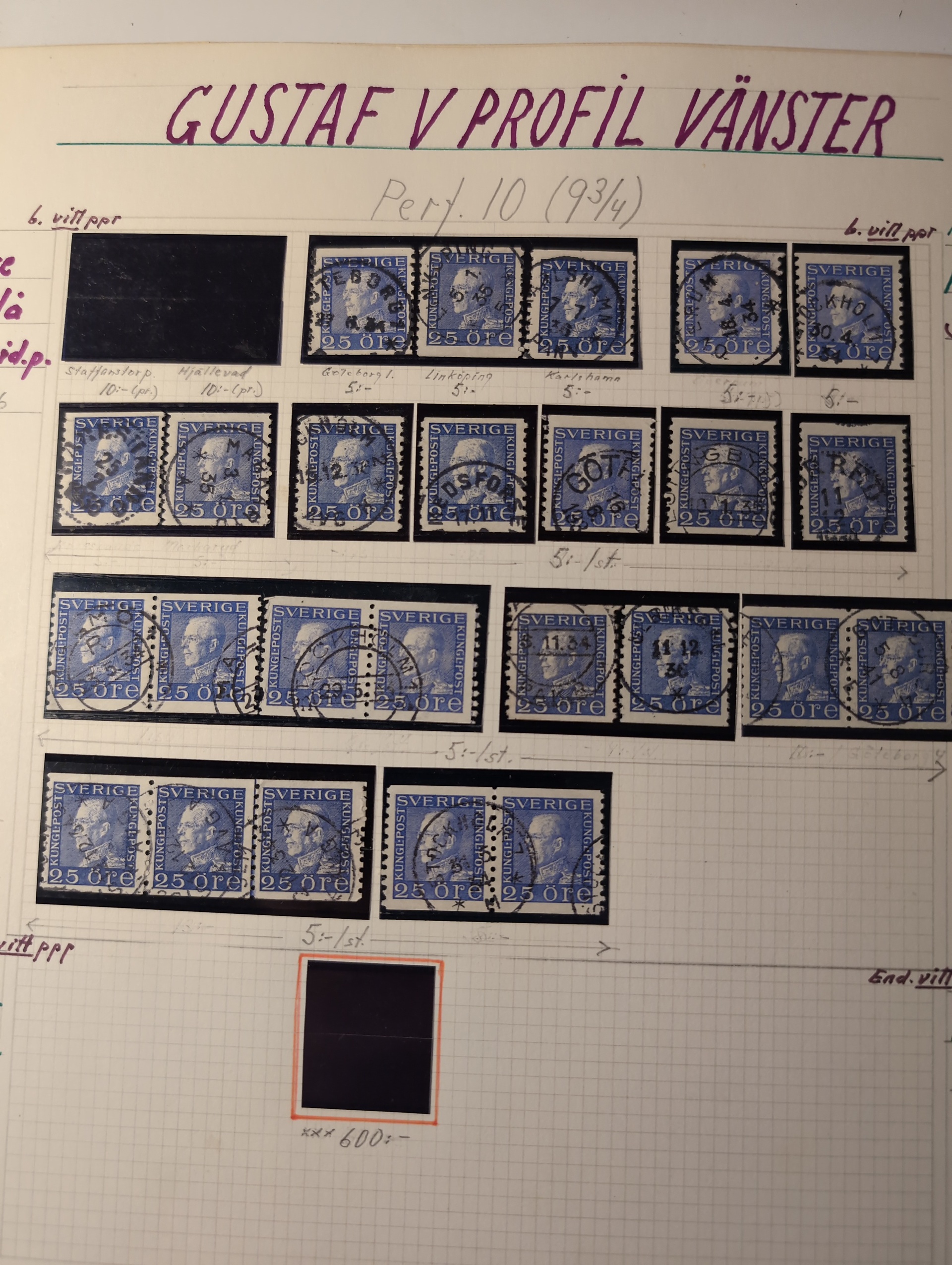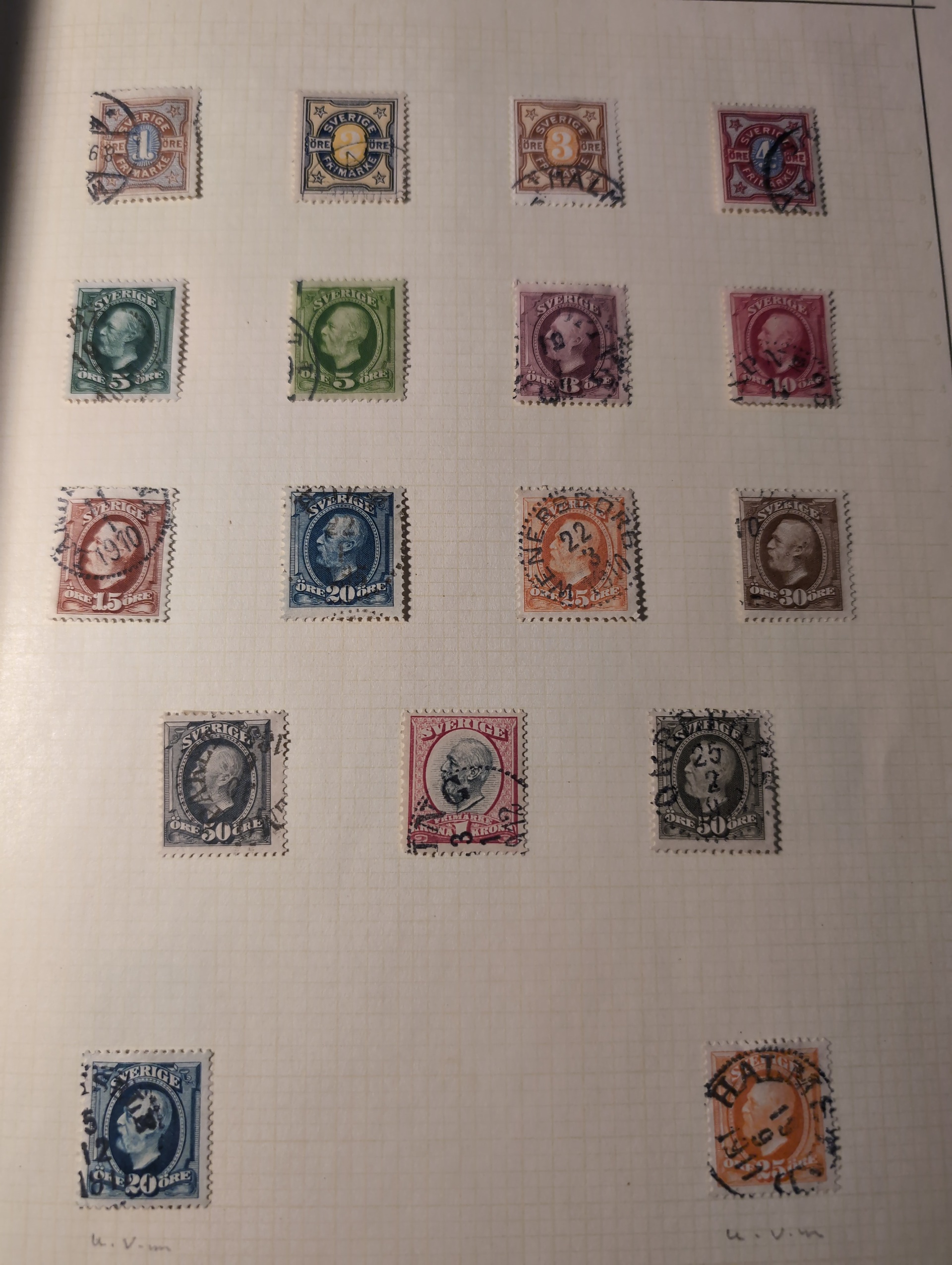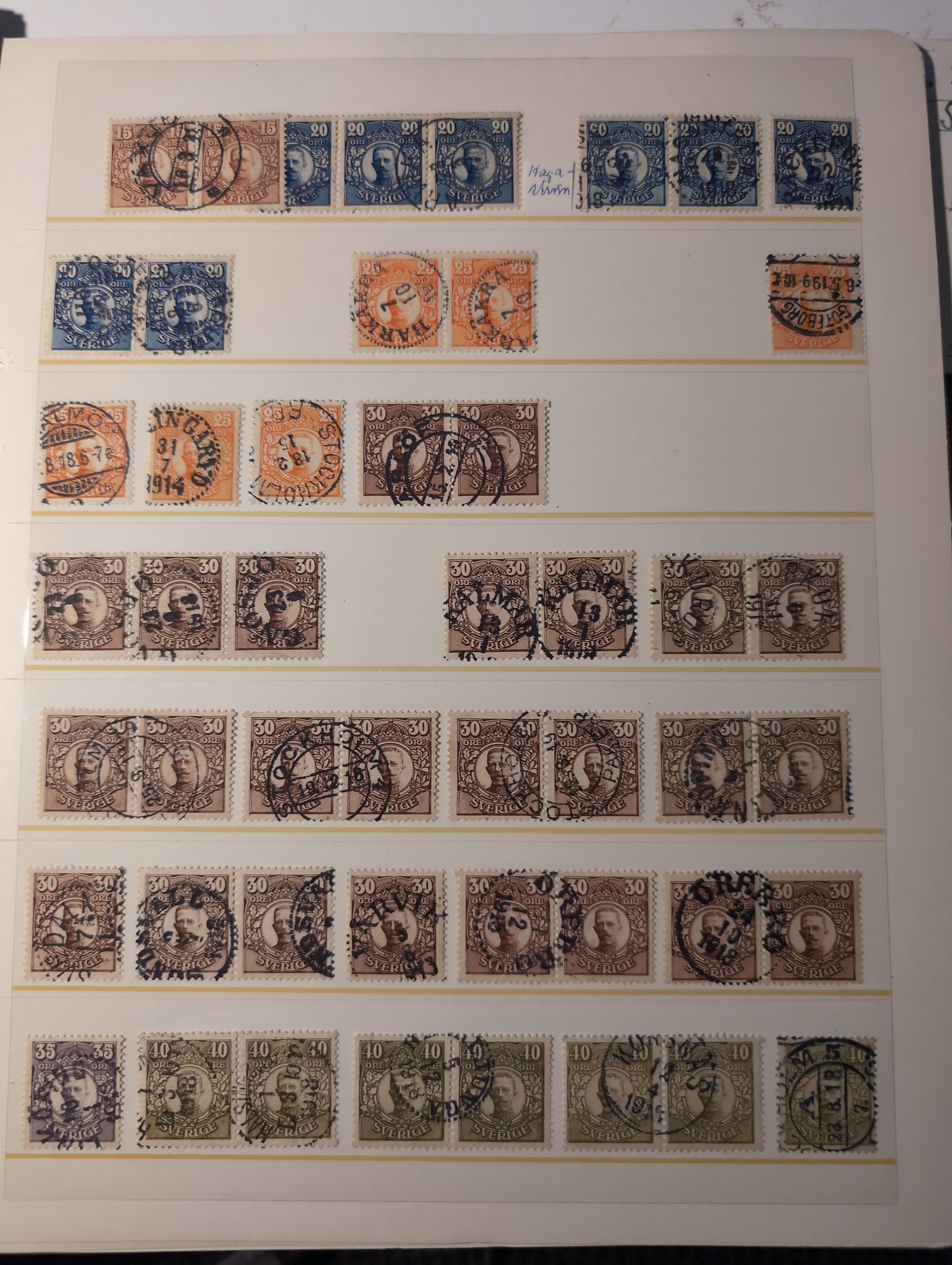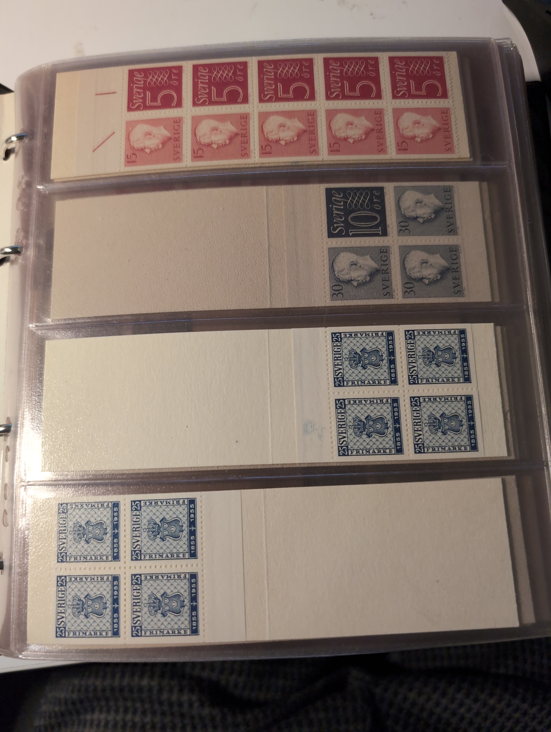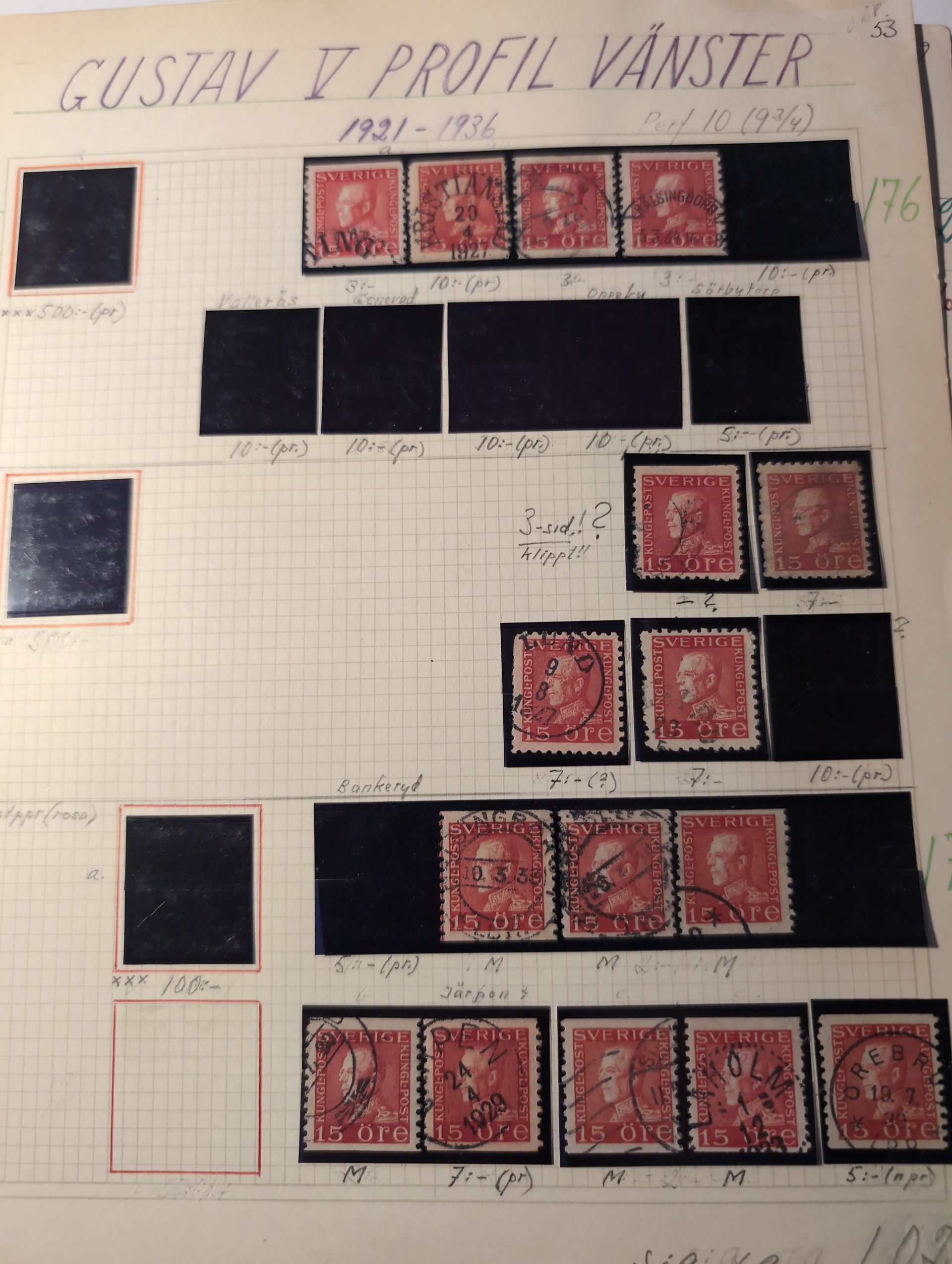 Sweden. Accumulation ★★/★/⊙ 1870s–2010 in box. Mystery box with a huge pile of album leaves and visir leaves mostly Coilstamps - 1960s. One album vending machine booklets, 2 stockbooks and 2 other albums with a mix of Sweden old-1950s. One envelope with more modern Face value incl. 46 "Brev" and 10 "Christmas" stamps. Interesting lot. Somewhat mixed quality. Approx. 18 kg. (1000s)