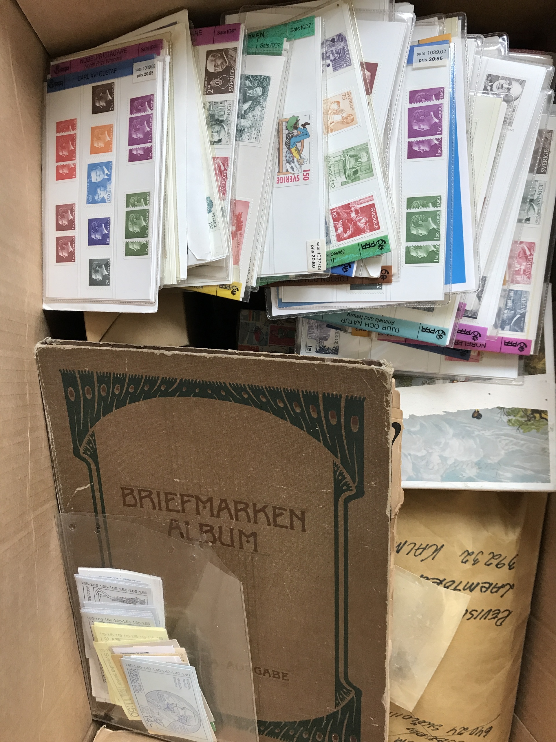 Sweden. ★★/★/⊙. Box with 1000's of stamps old-modern. Mostly Sweden incl. e.g. four albums with ** stamps and booklets, about 45 gift sets etc. Approx. 22 kg.