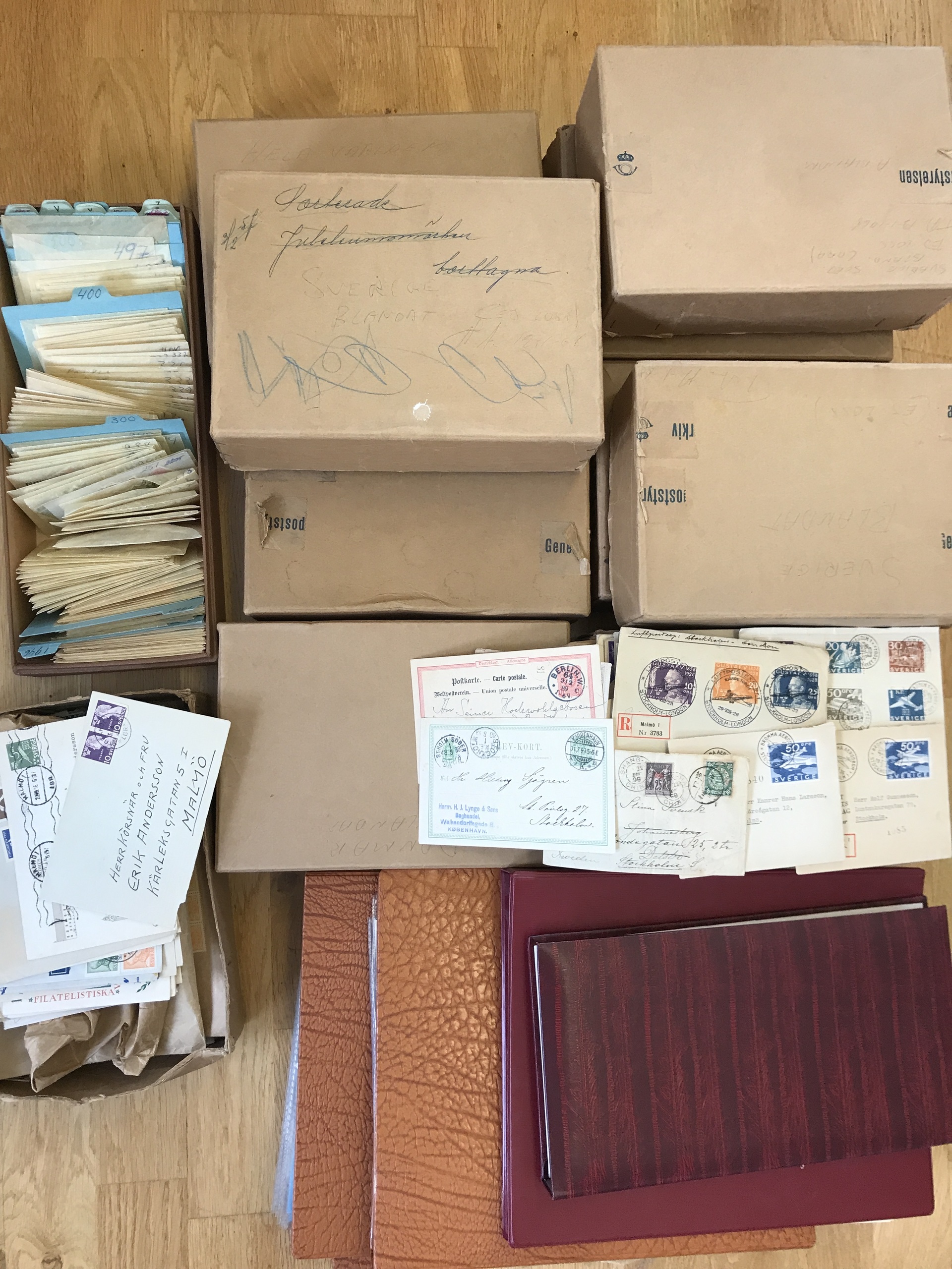 Sweden. Miscellaneous. Removal box with 1000's of stamps in envelopes, old opened kilowares, covers and cards and also some other countries. Approx. 21 kg.