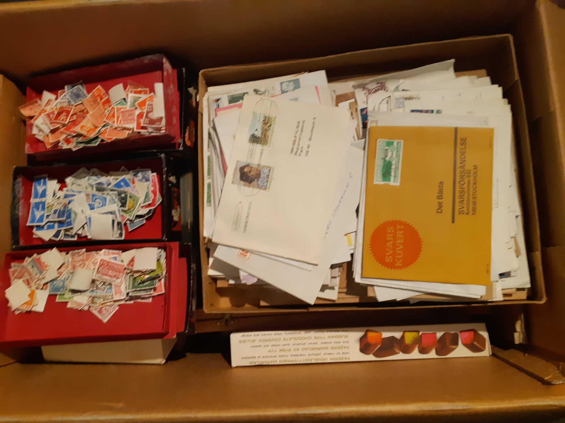 Sweden. Accumulation ★★/★/⊙ old–modern in removal box. Loose stamps, covers, Sweden slot-machine booklets with face value 1260 according to vendor and a few somewhat better FDCs e.g. 1939 'Vetenskapsakademin'. The most expensive items in poorer quality, otherwise mostly fine. Approx. 11 kg. (1000s)