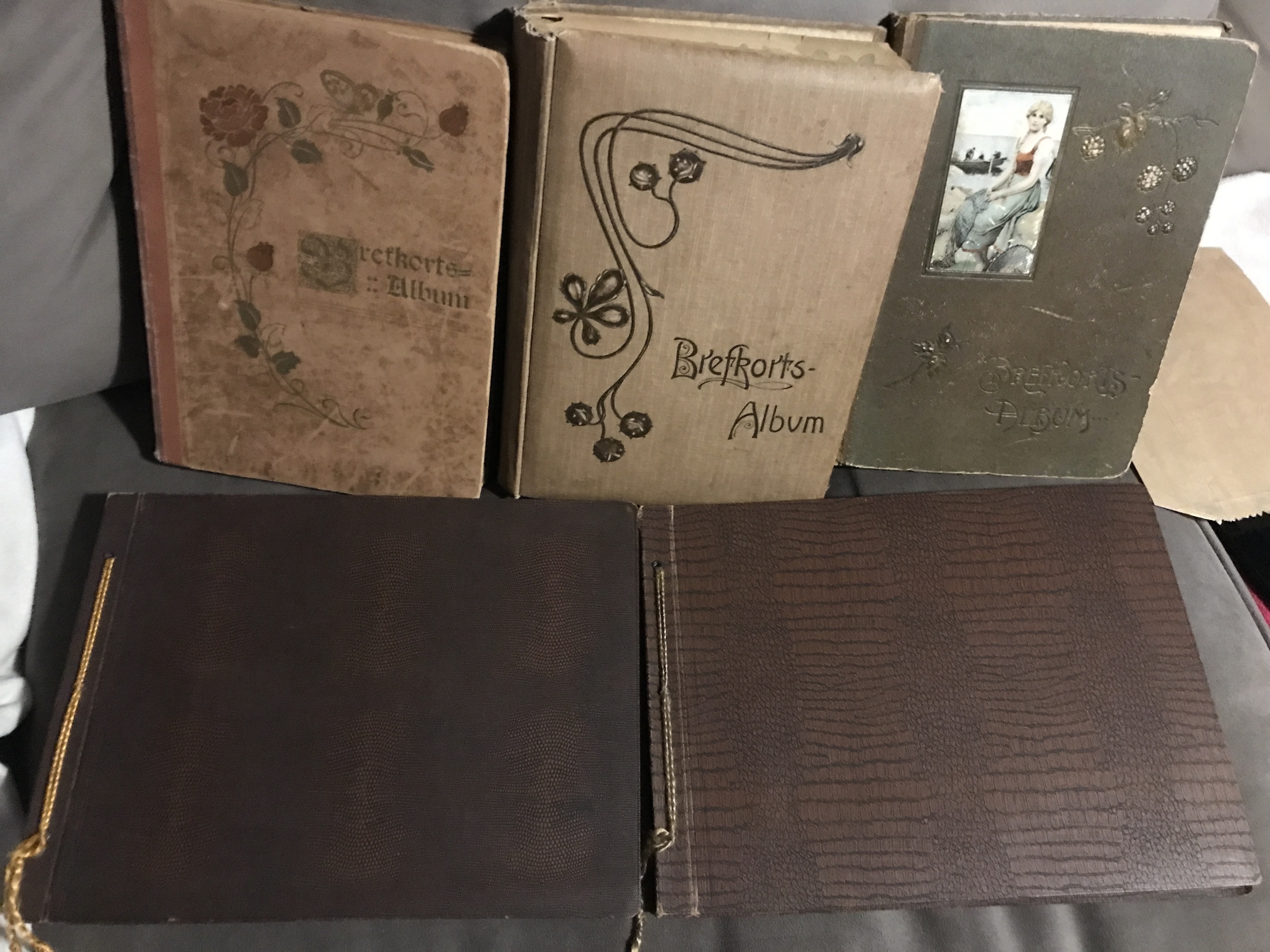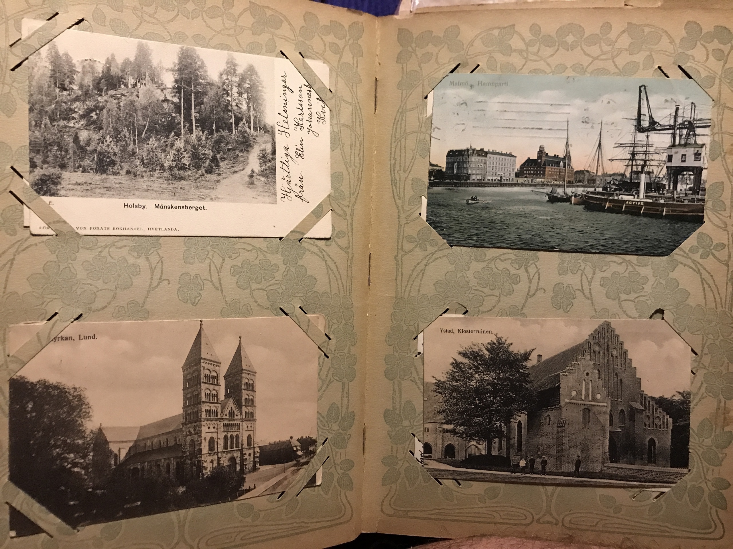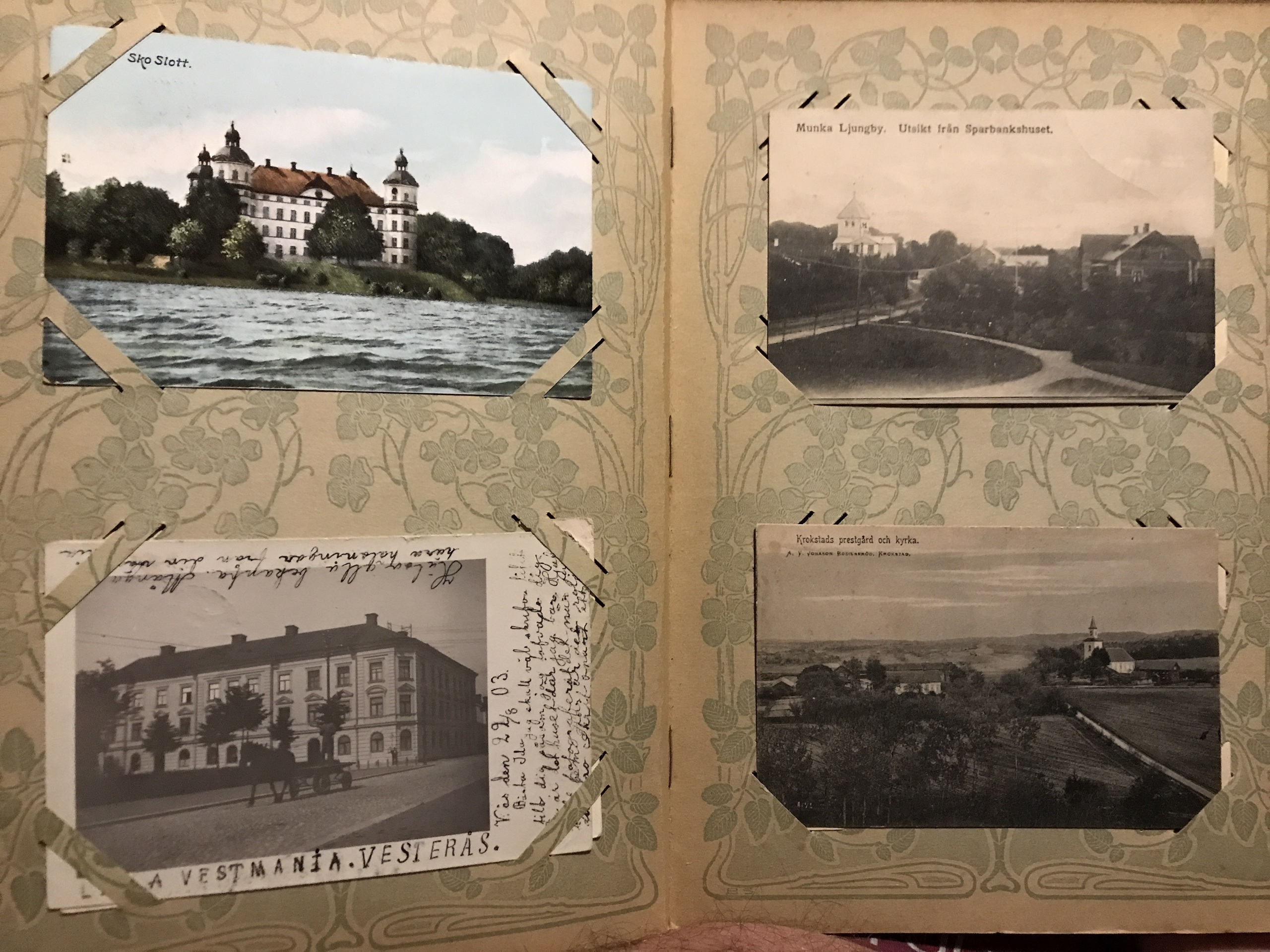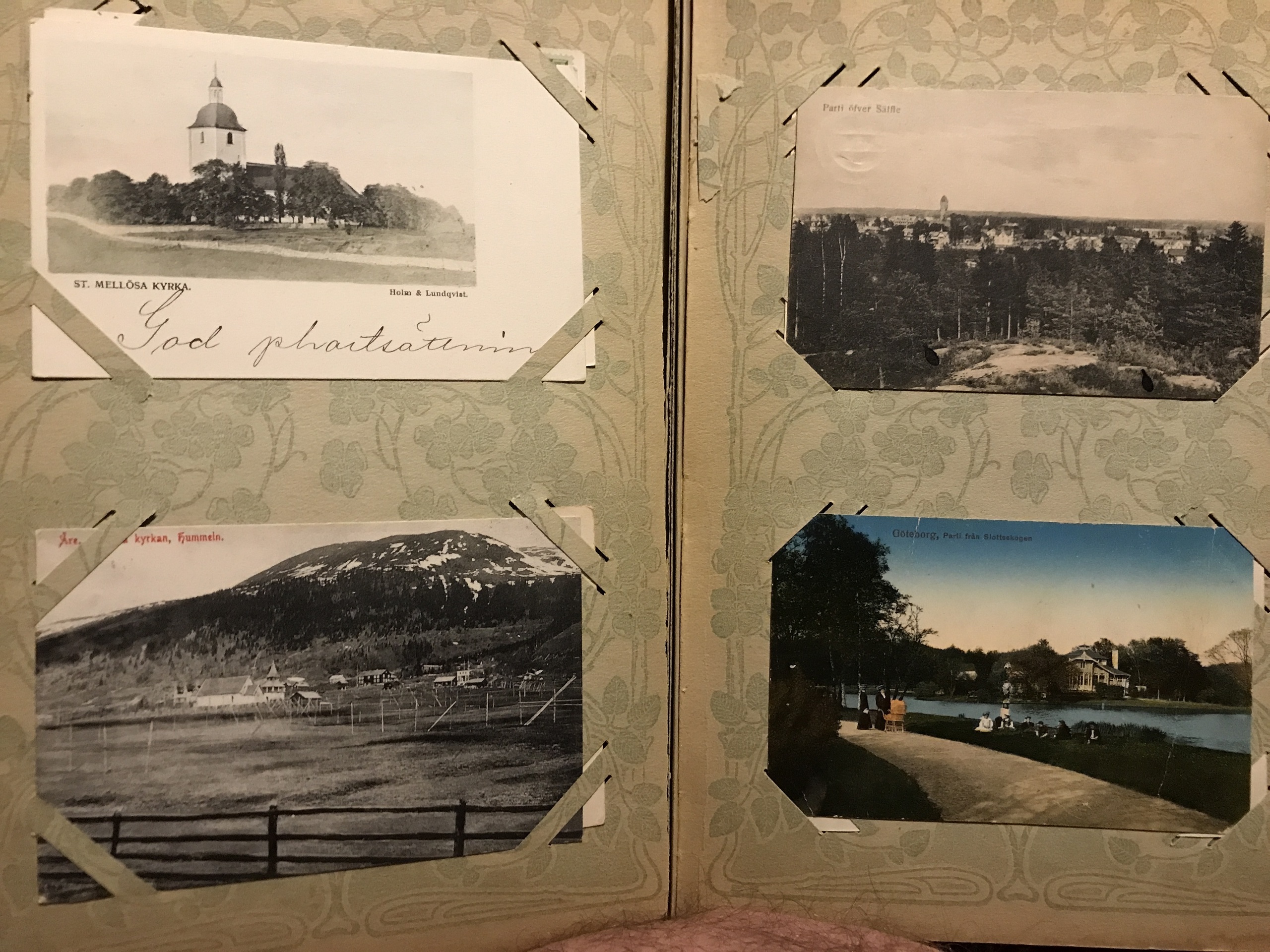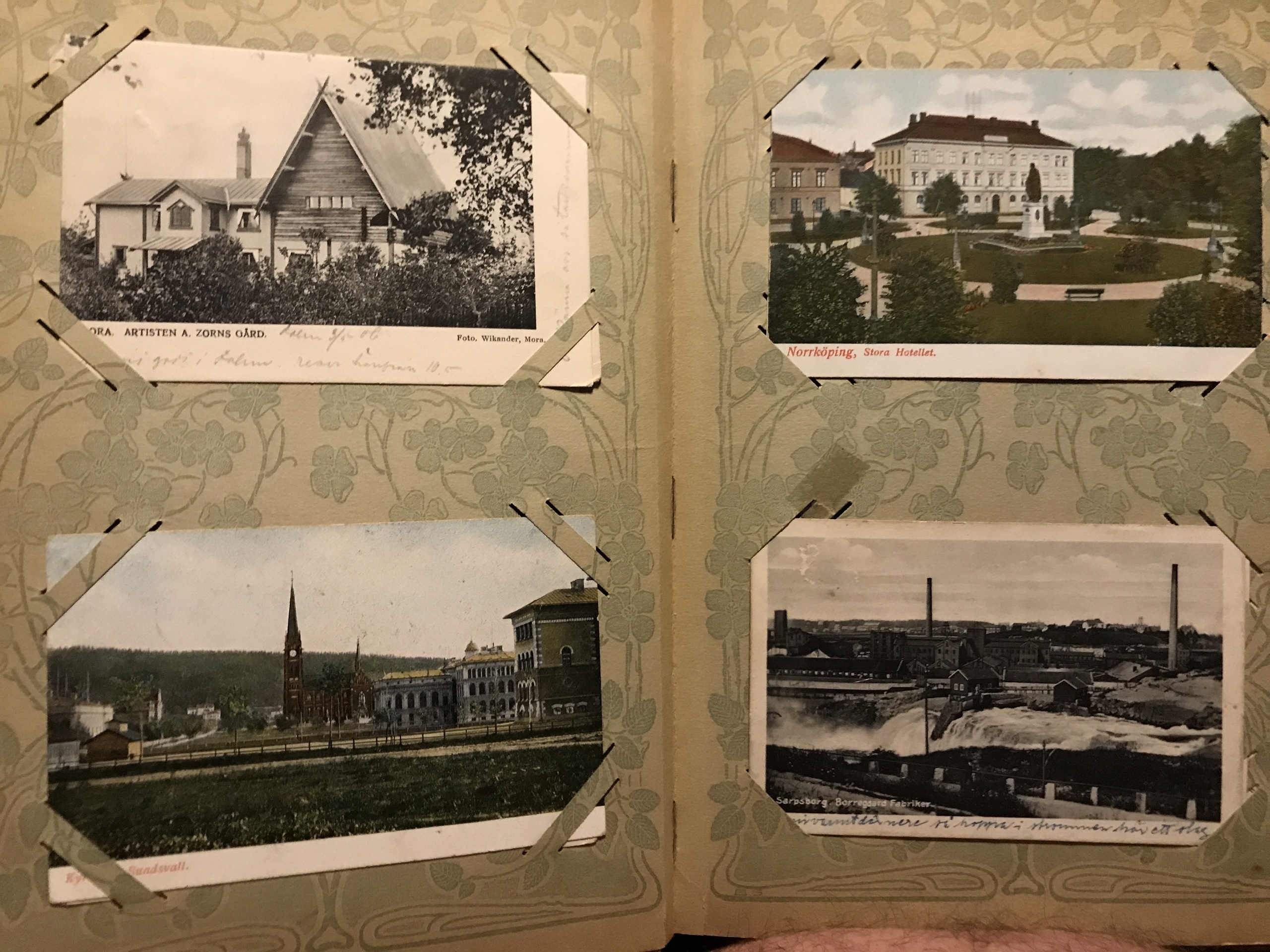 Sweden. Picture postcards. Four old albums with about 500 almost exclusively topographical postcards incl. several Oscar–GV Medallion period. Also one album with ca. 50 old gratulation- and romantic cards, etc. Please see a selection of scans at www.philea.se. Approx. 5 kg.