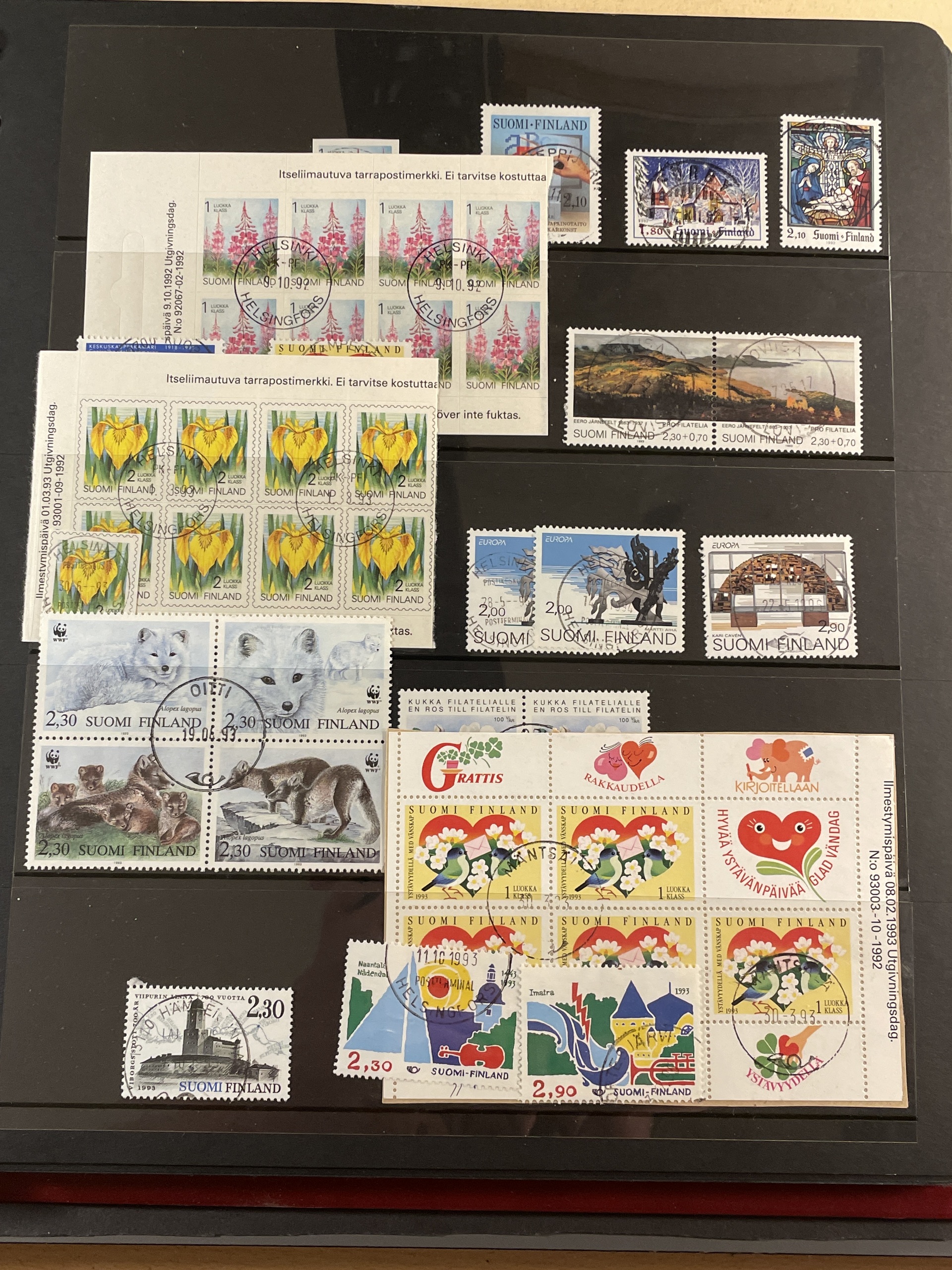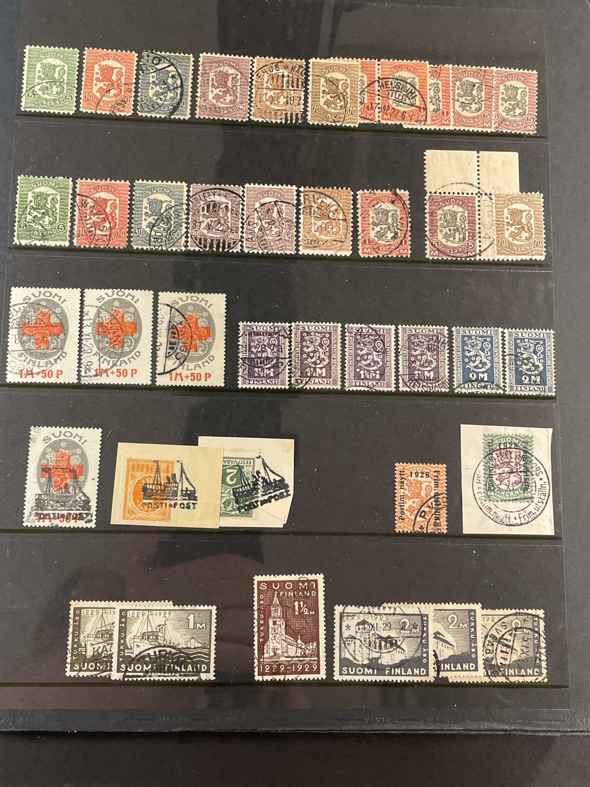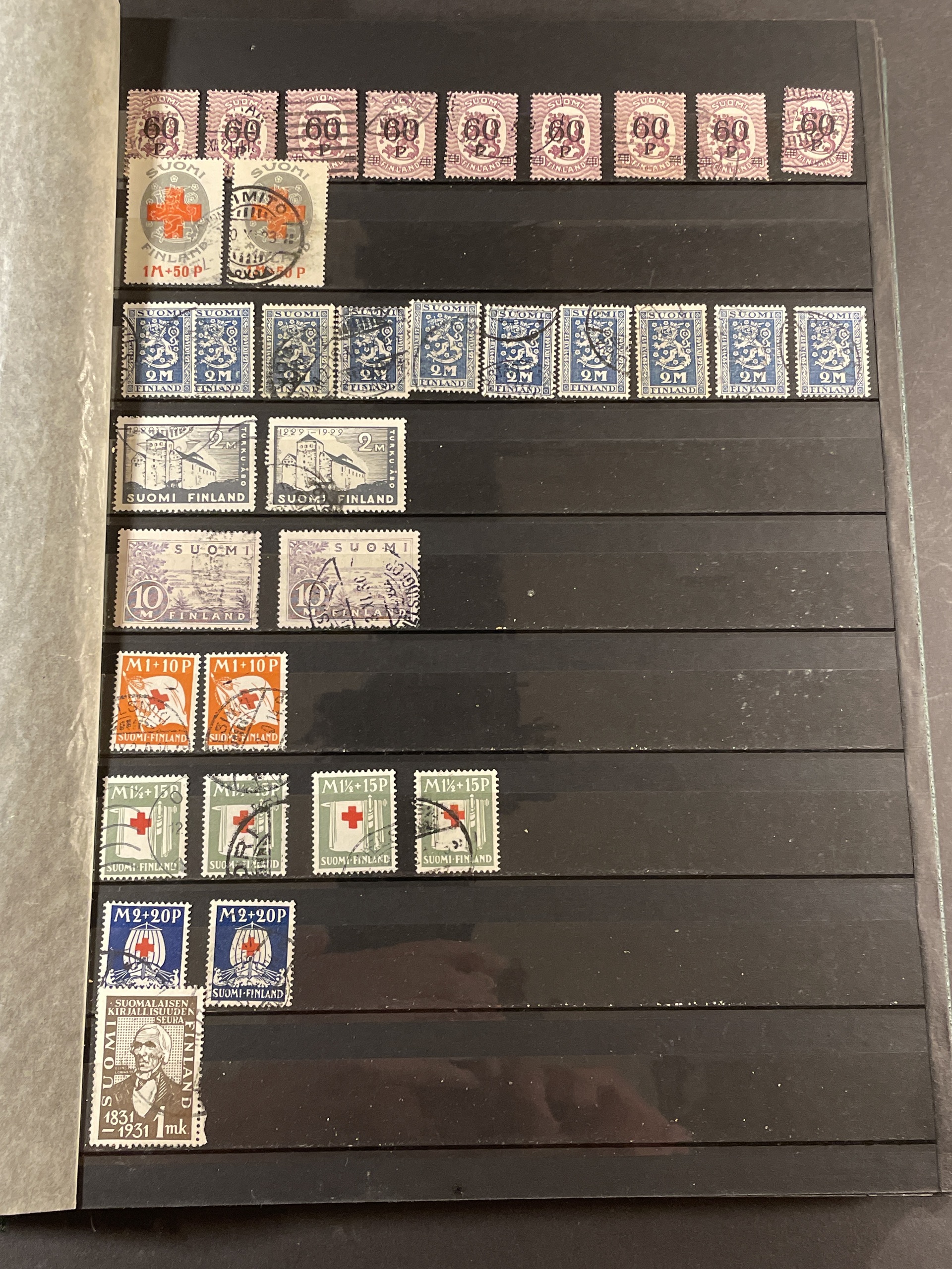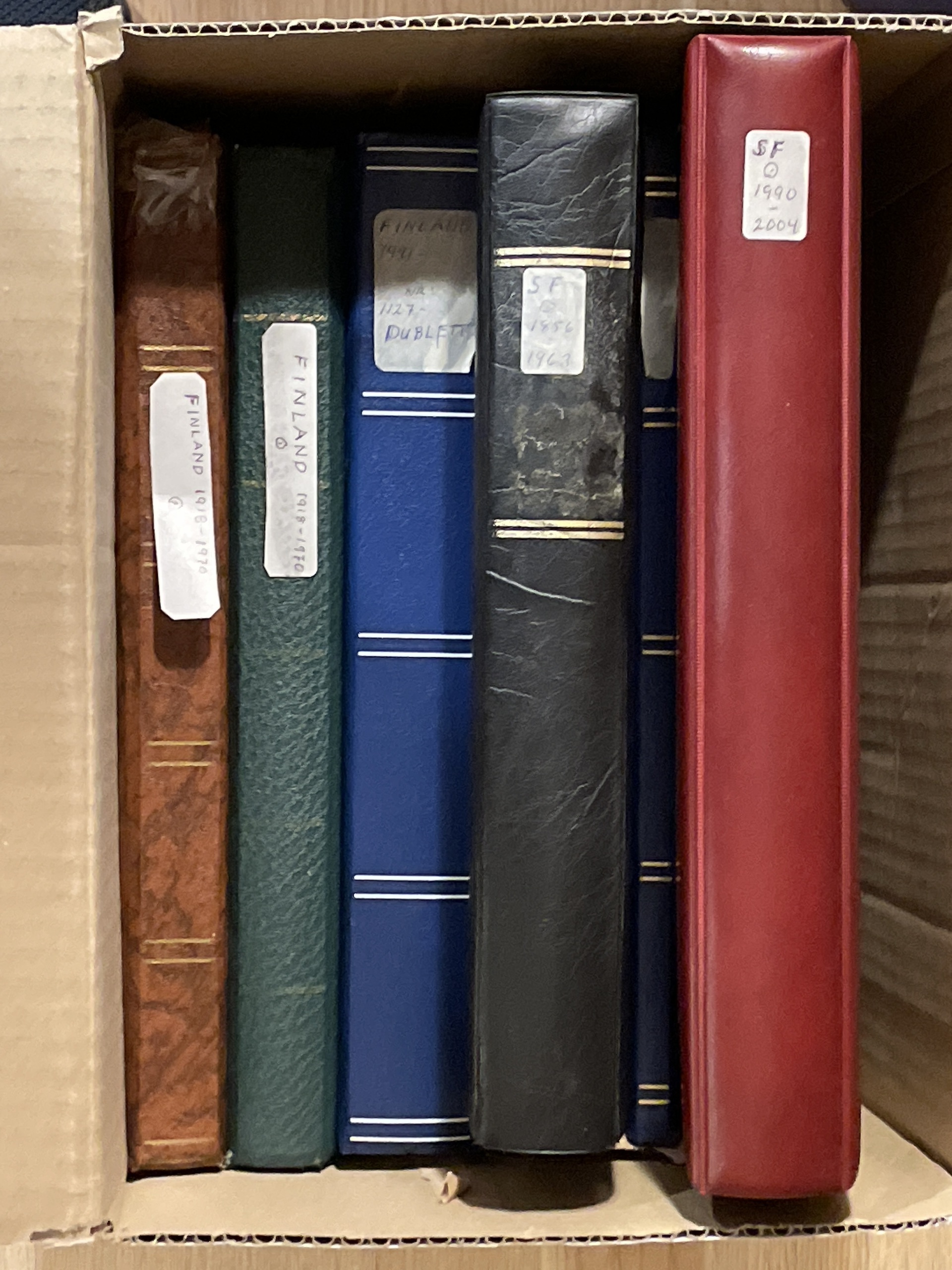 Finland. Collection/accumulation used 1928–2005 in box. 6 albums/stockbooks with, mostly, stock material. Also some older/better aslso found in the albums. Please explore. Fine quality. Approx. 9 kg. (1000s)