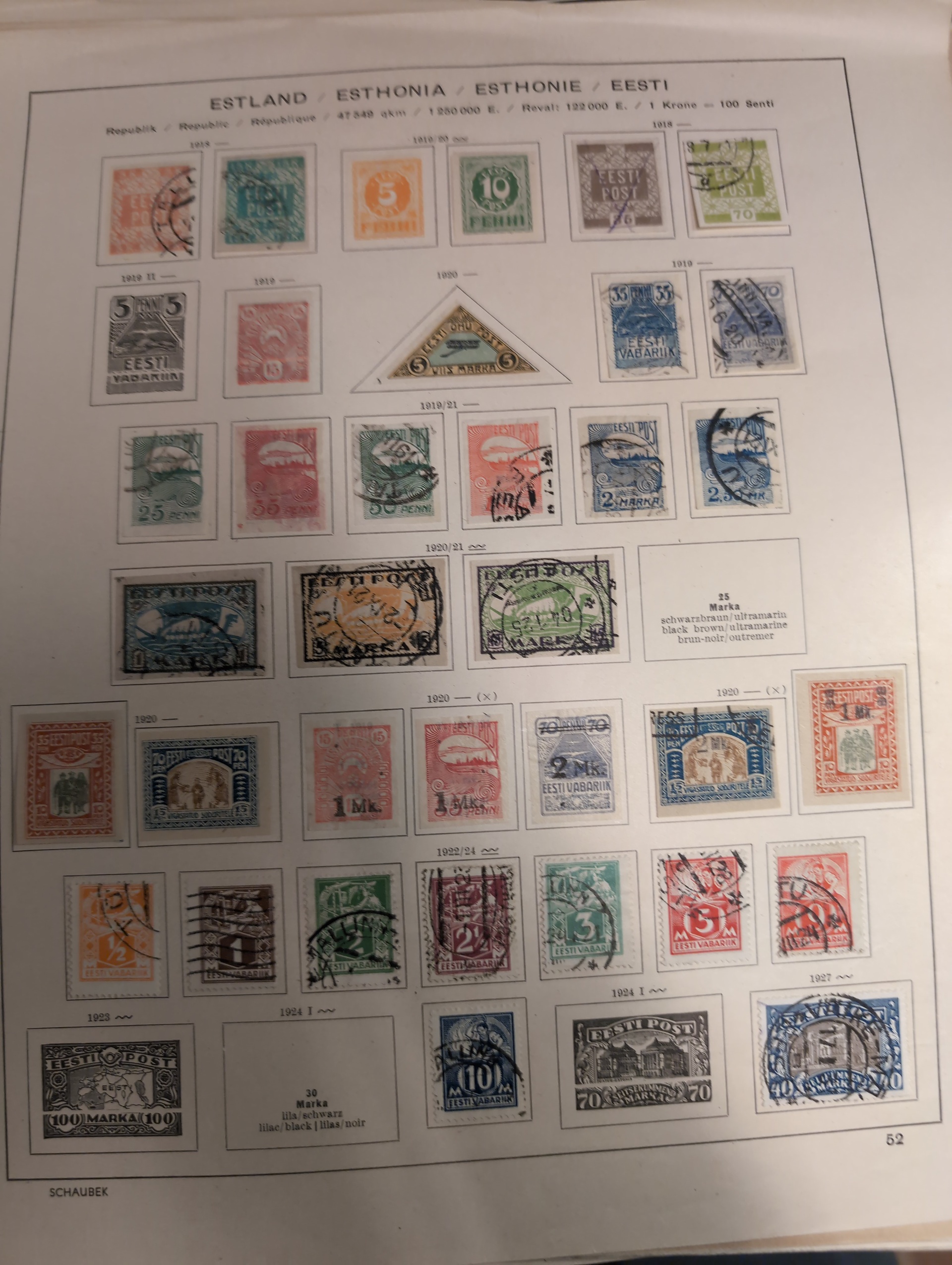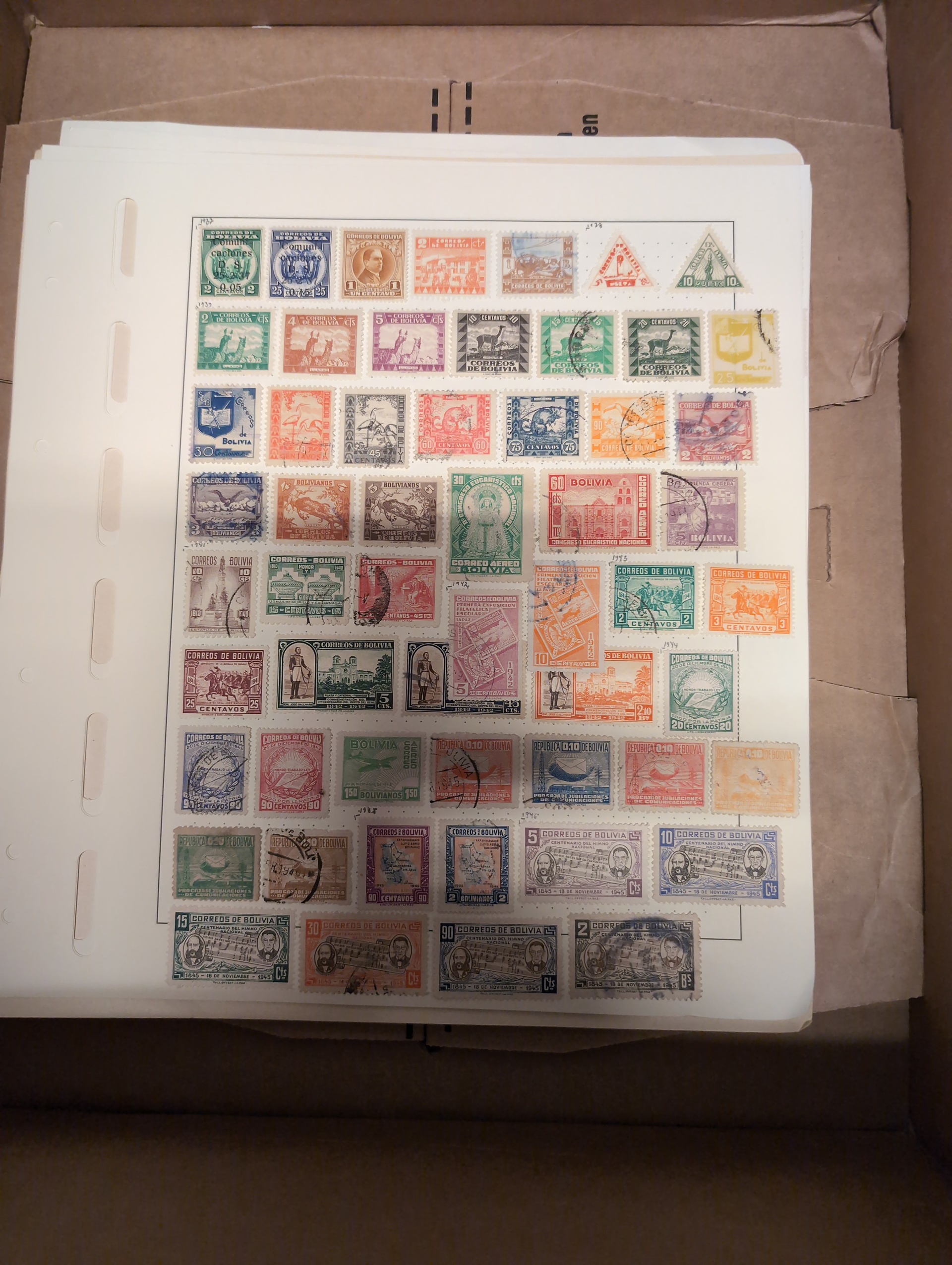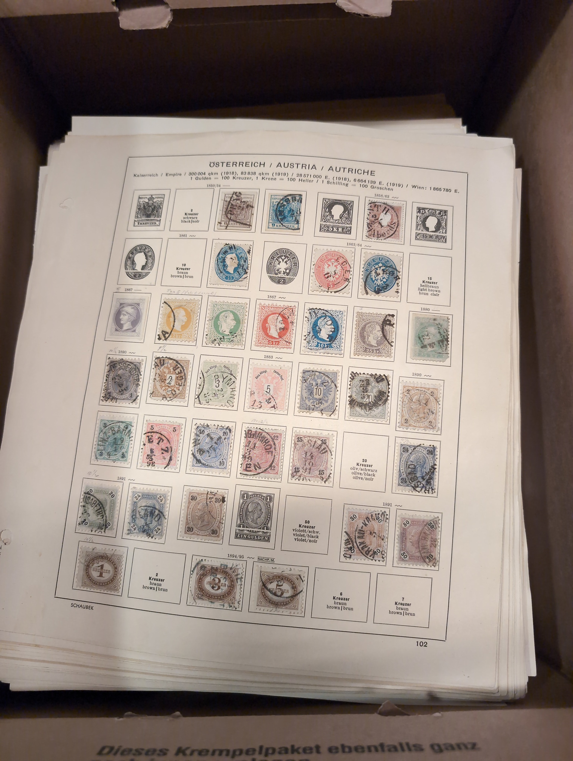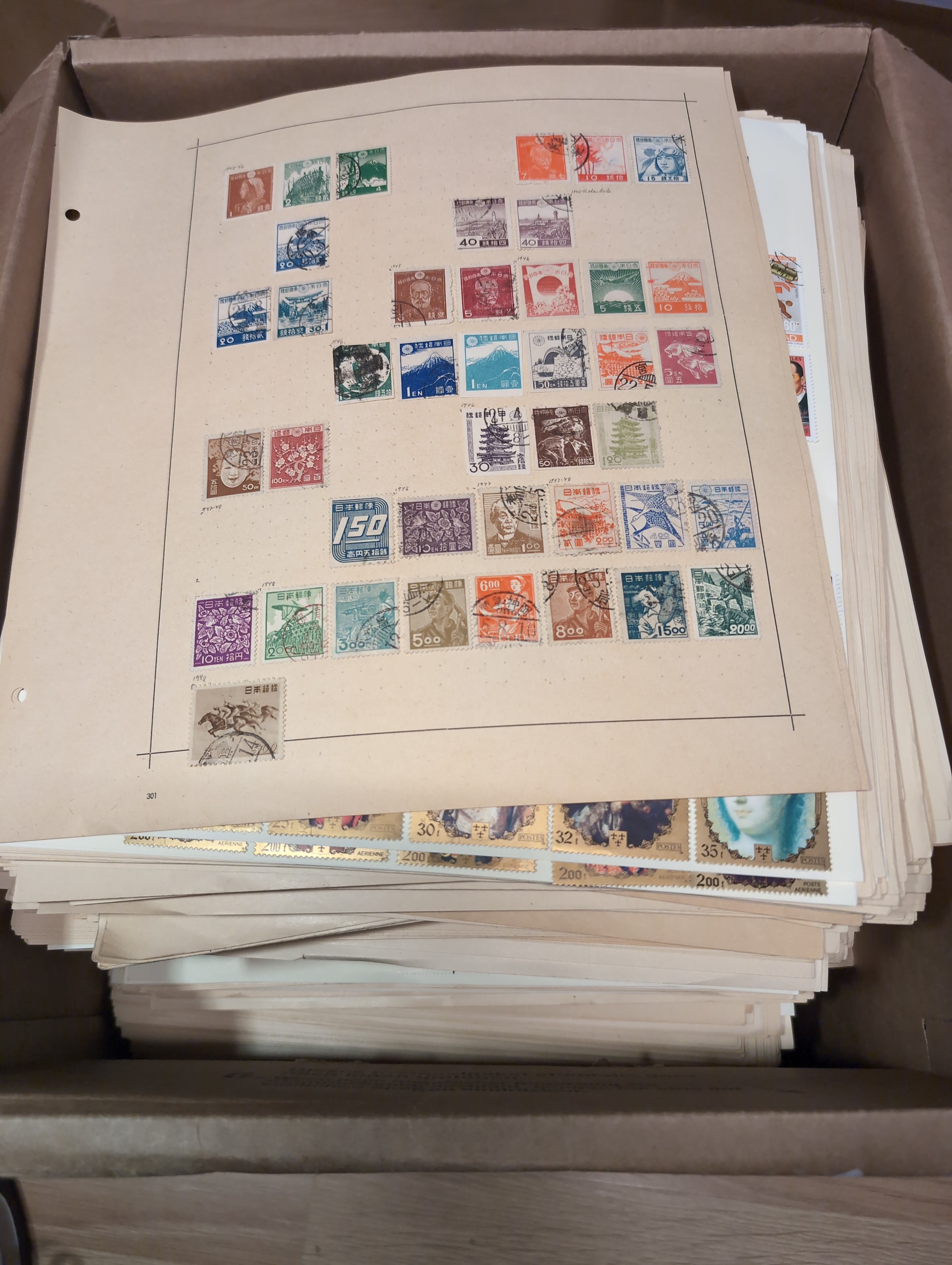 ALL WORLD. Collection/accumulation ★/⊙ 1880s–1970s in box. Album leaves in big box, incl. Japan, Estonia, Lithuania, Norway and many smaller countries in africa and asia. Looks interesting with some a bit better stamps. Please see a selection of scans at www.philea.se. Somewhat mixed quality. Approx. 20 kg. (1000s)