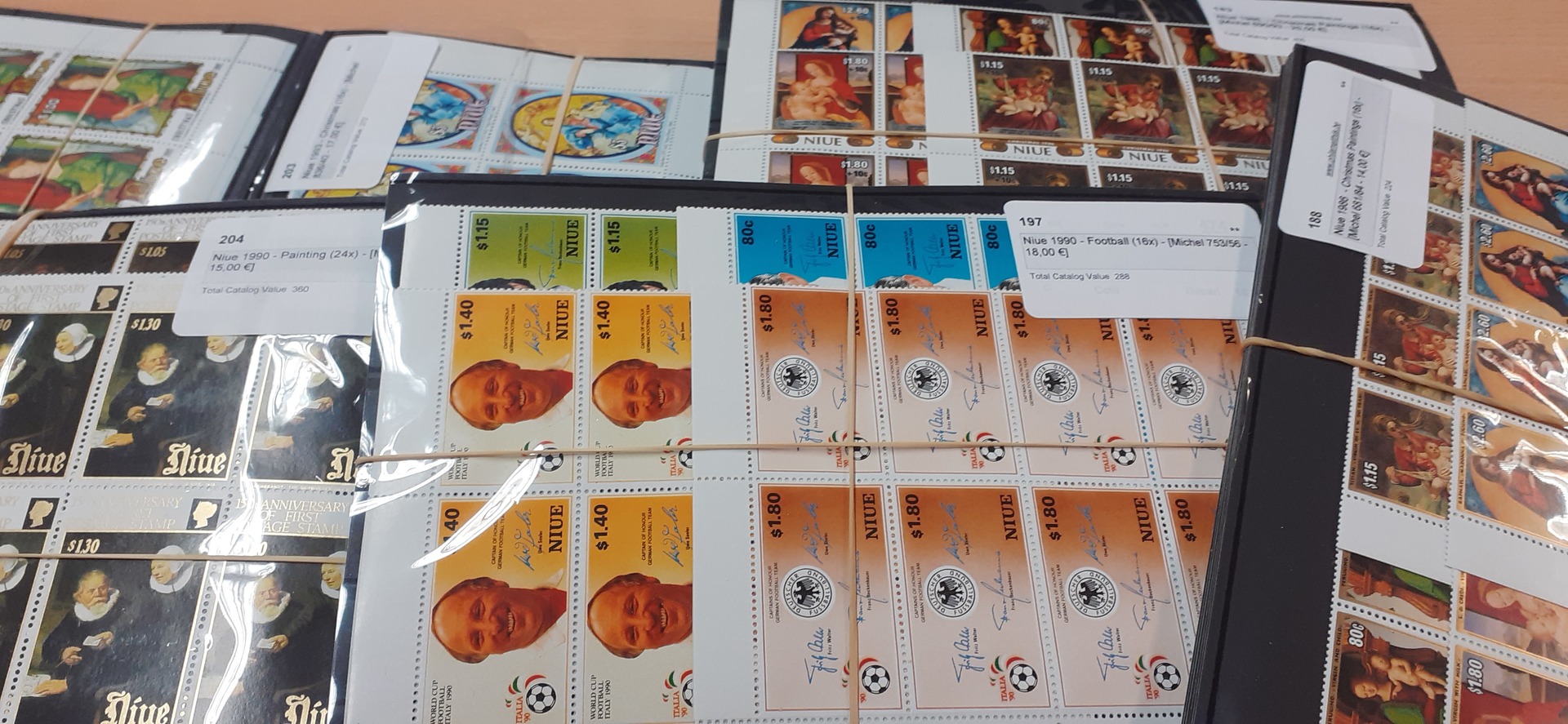 Niue. Accumulation ★★ 1986–93 on stock cards. Six different sets in quantietes about 50–150 of each catalogue value MORE THAN EUR 20000! Great dealer opportunity. Fine quality.