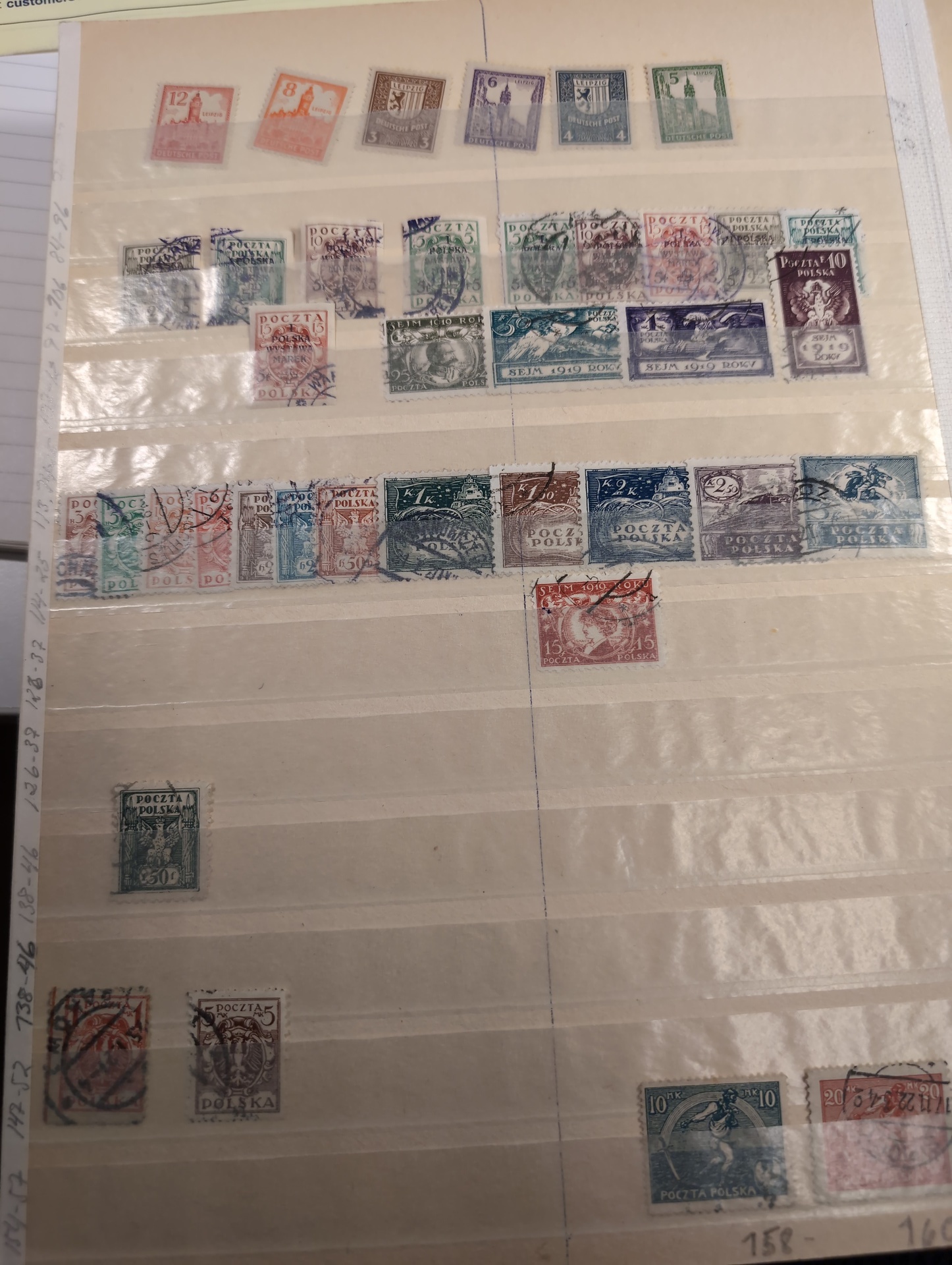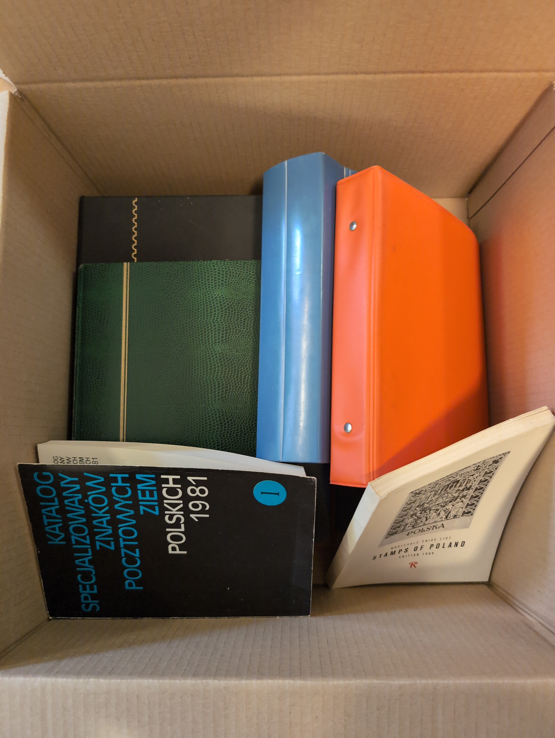 Poland. Collection/accumulation used in box. Four stockbooks with used stamps. Handbook in leadger and the comprehensive Znakow catalogue from 1981. Approx. 6 kg.