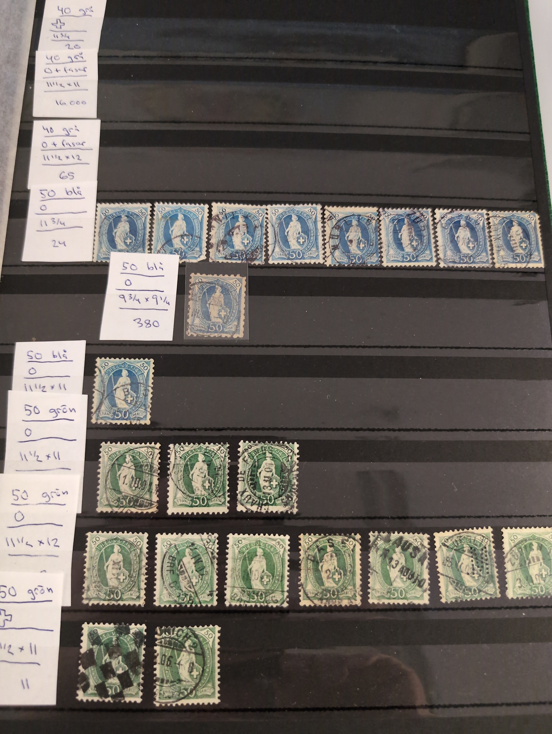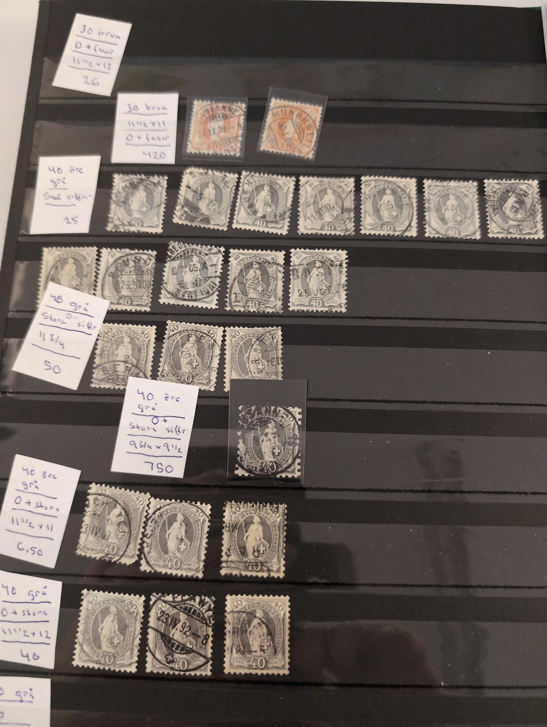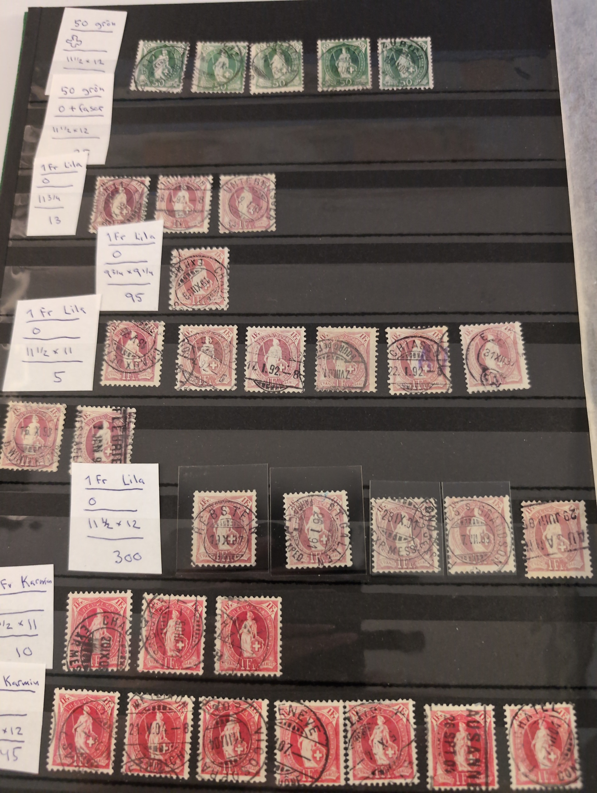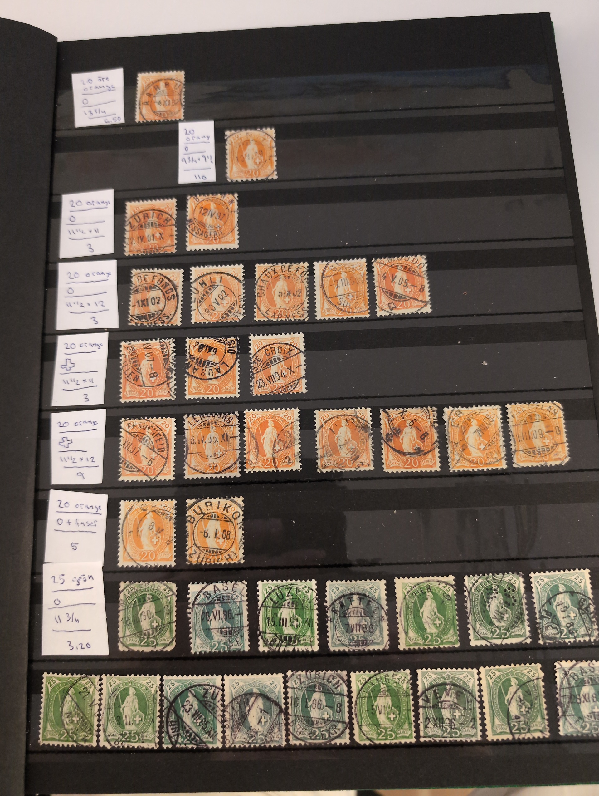 Switzerland. Accumulation used 1882–1993 in box. Standing Helvetias sorted in stockbook with many better stamps, value according to vendor over €7000. One thick stockbook with duplicates and Leuchtturm album with used collection 1964–1993. Somewhat mixed quality. Approx. 6 kg. (1000s)