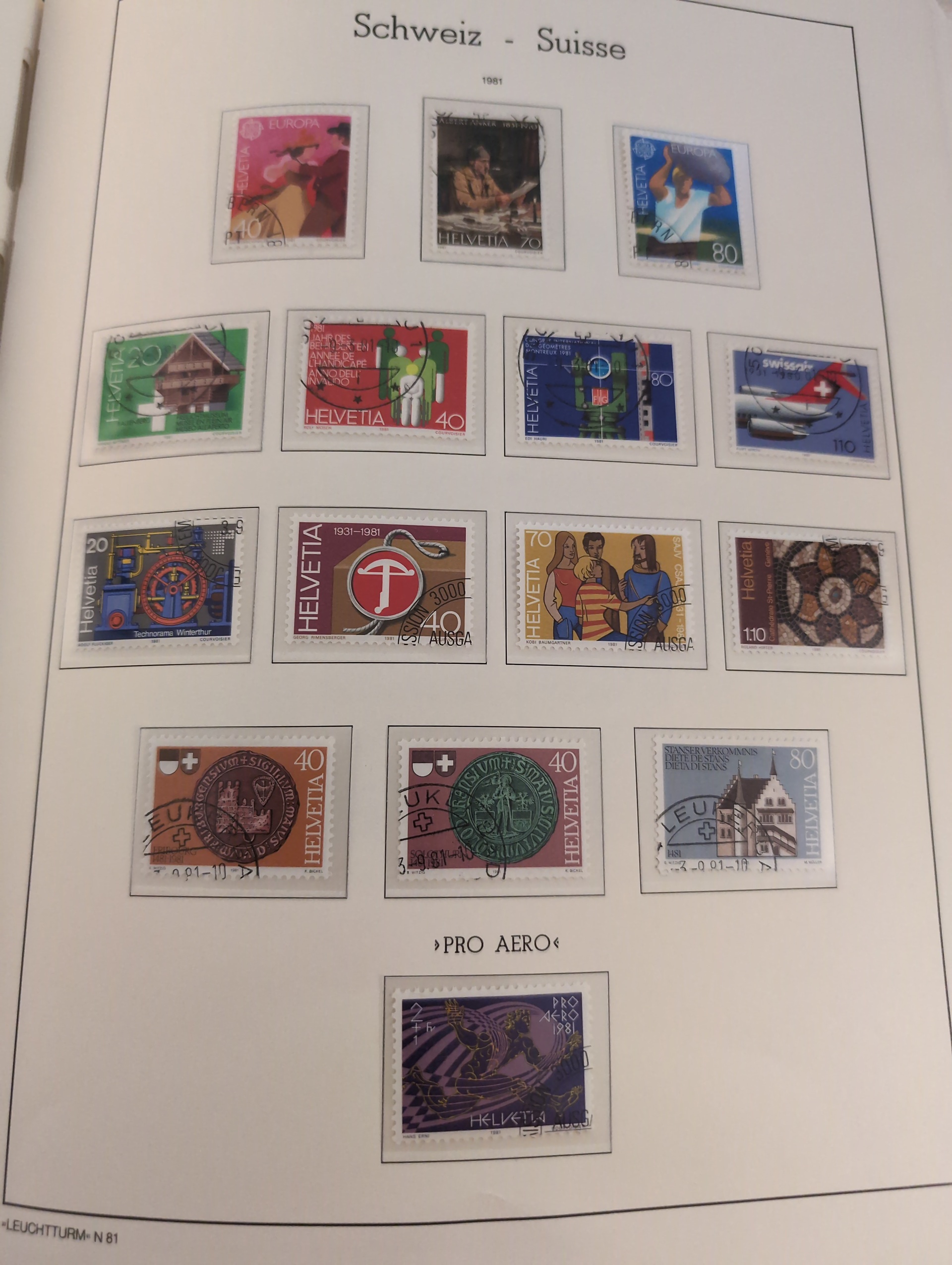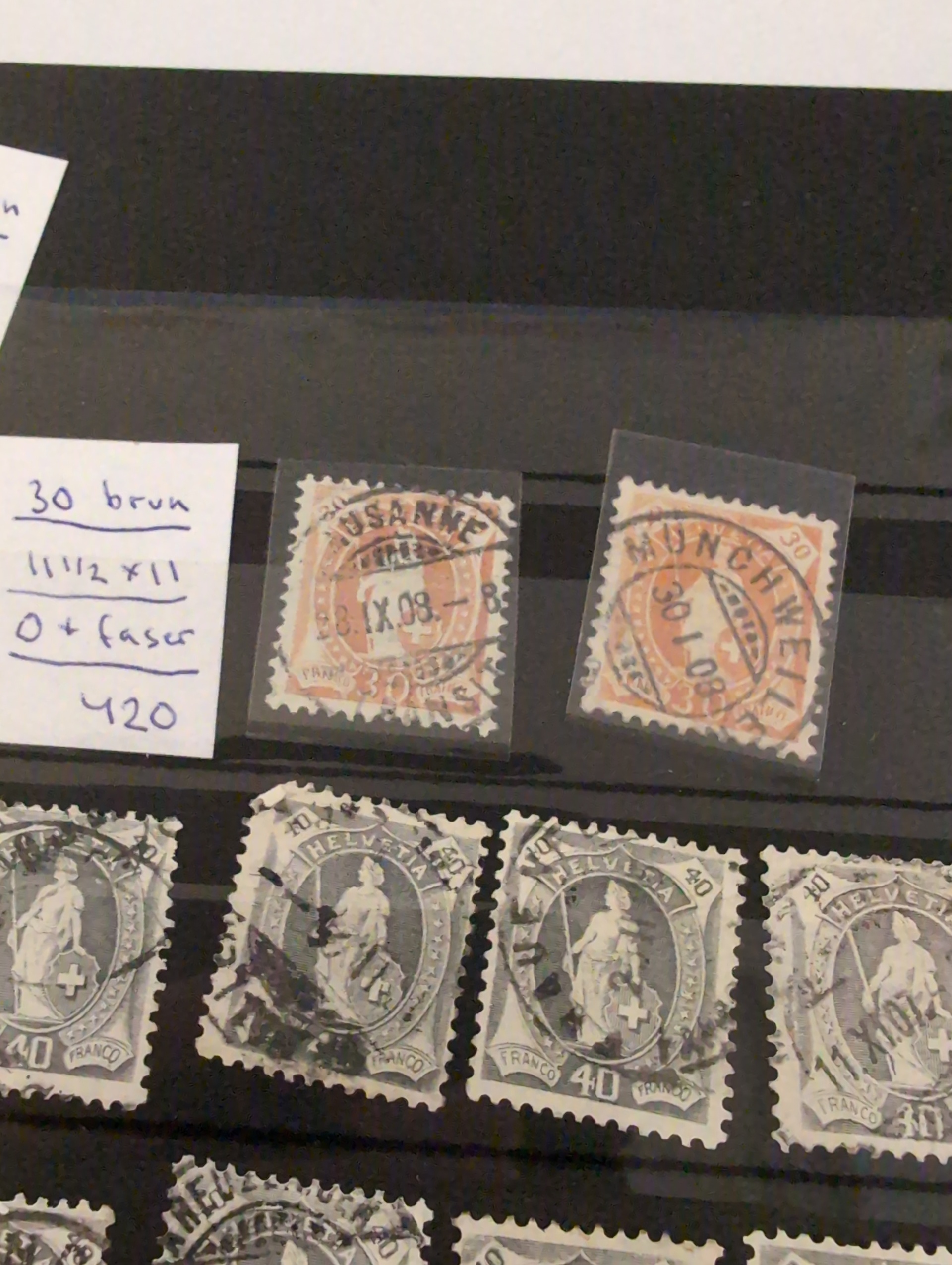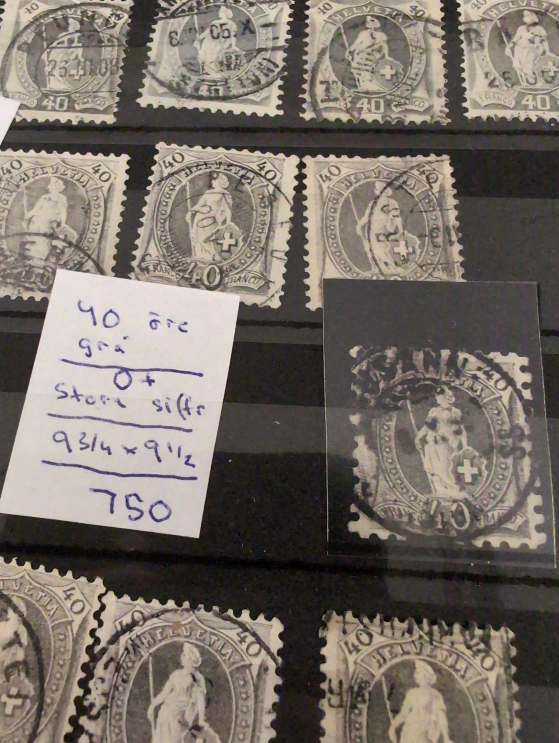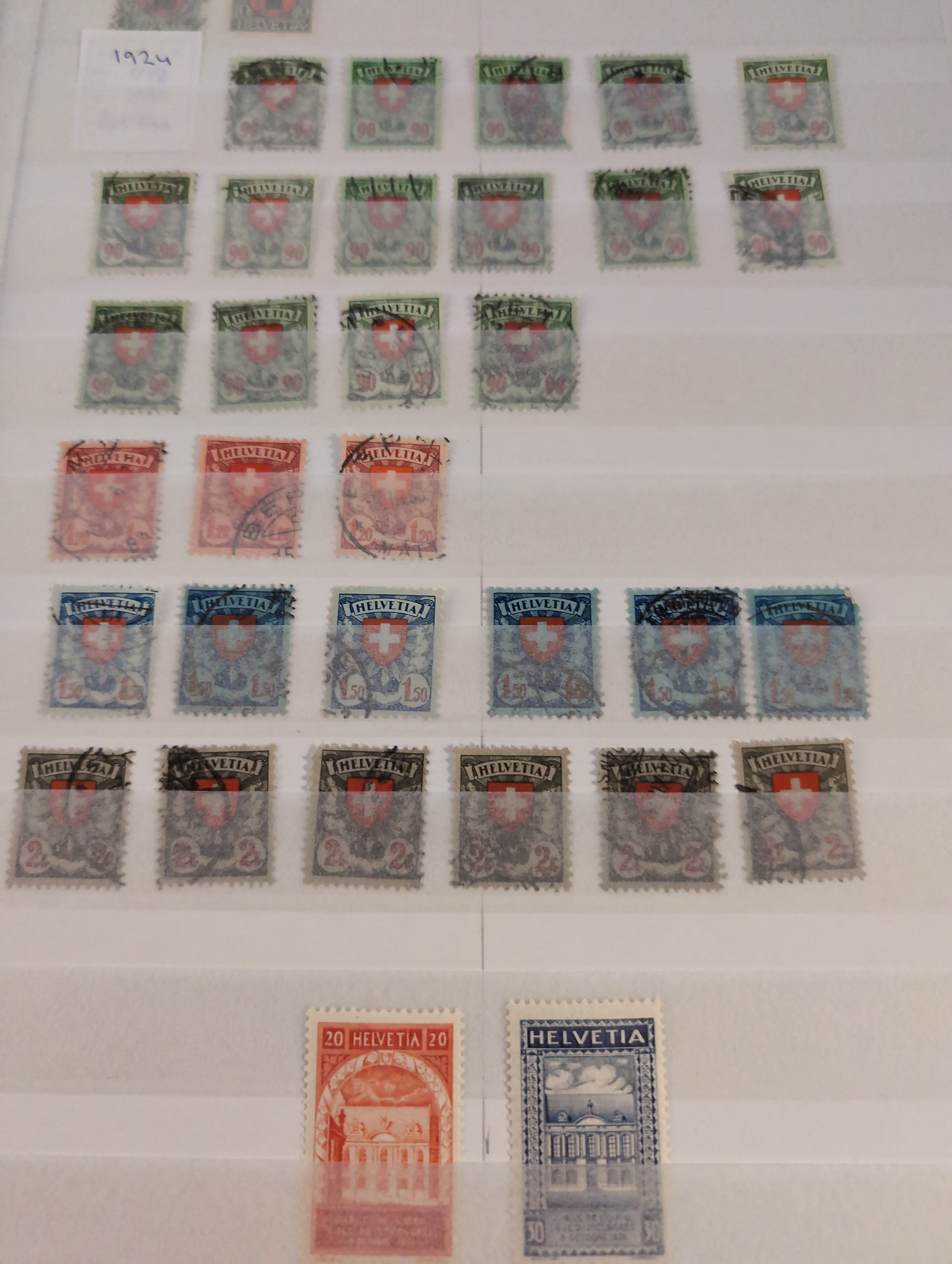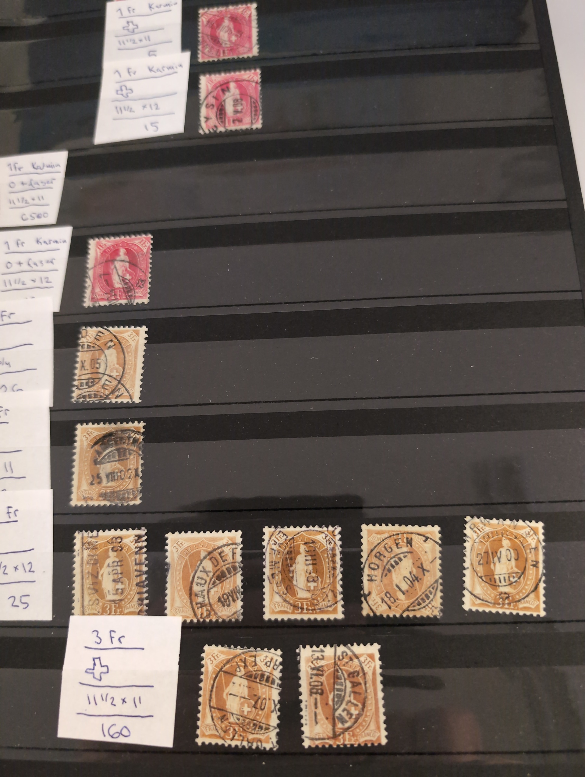 Switzerland. Accumulation used 1882–1993 in box. Standing Helvetias sorted in stockbook with many better stamps, value according to vendor over €7000. One thick stockbook with duplicates and Leuchtturm album with used collection 1964–1993. Somewhat mixed quality. Approx. 6 kg. (1000s)