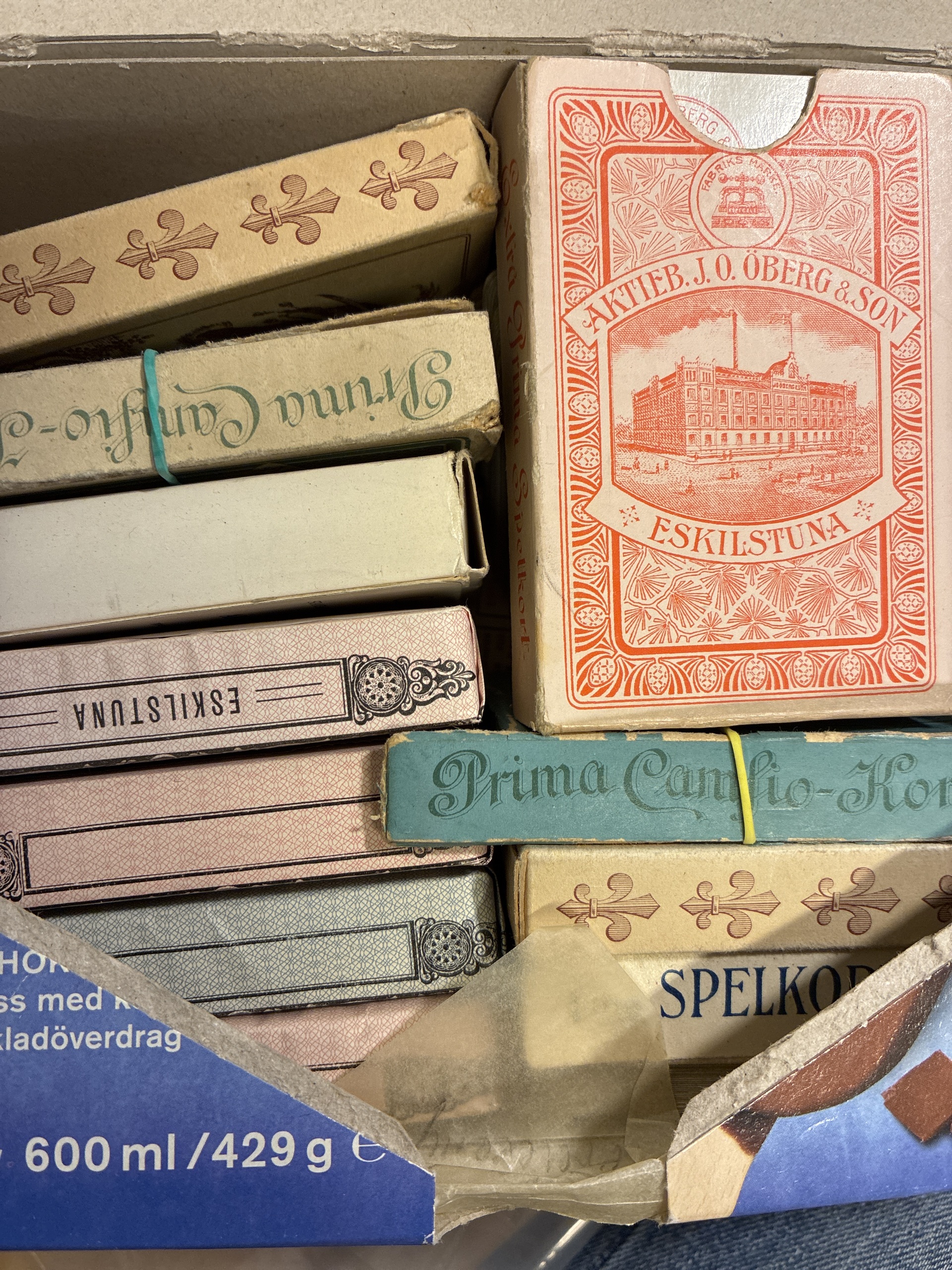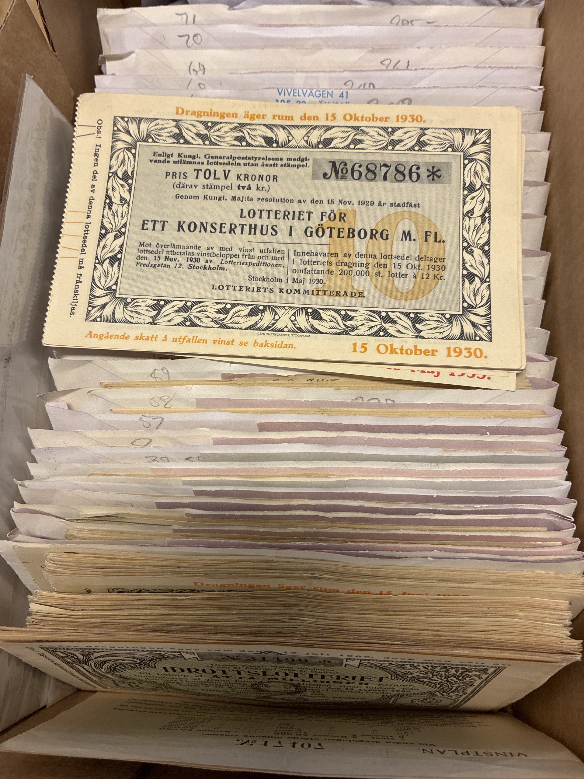 Other. Miscellaneous, 1900s in removal box. Postal item, English and Swedish playing cards, postogram, lottery tickets, plastic cards, passports. bottle labels. Please see a selection of scans at www.philea.se. Somewhat mixed quality. Approx. 18 kg.