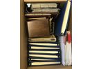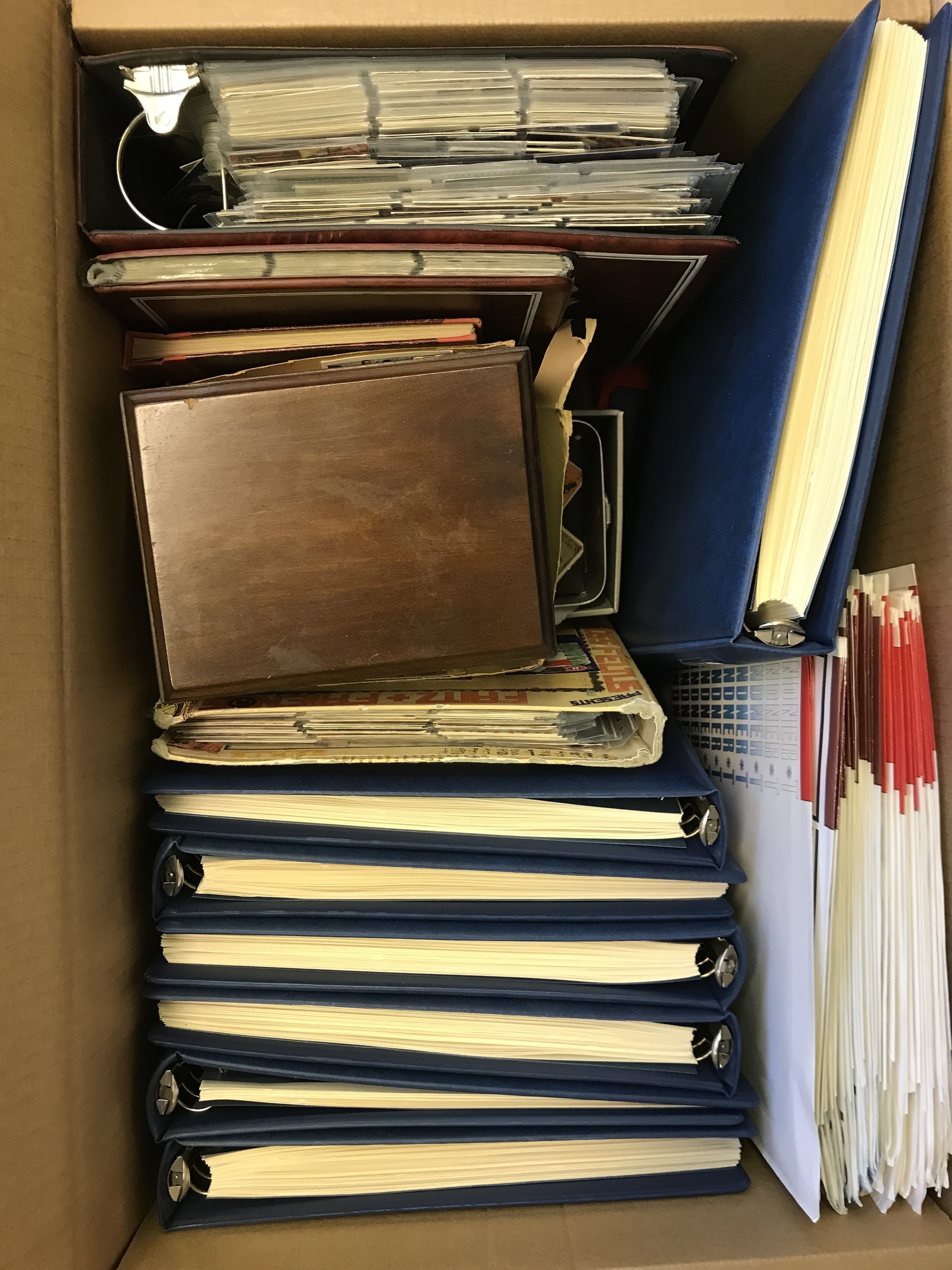 Miscellaneous, Sweden. Box with e.g. 100s of Hockey trading cards, coins, stamps, six Lindner Falzlos albums with leaves + supplements Austria, Monaco and Switzerland, etc. Approx. 40 kg.