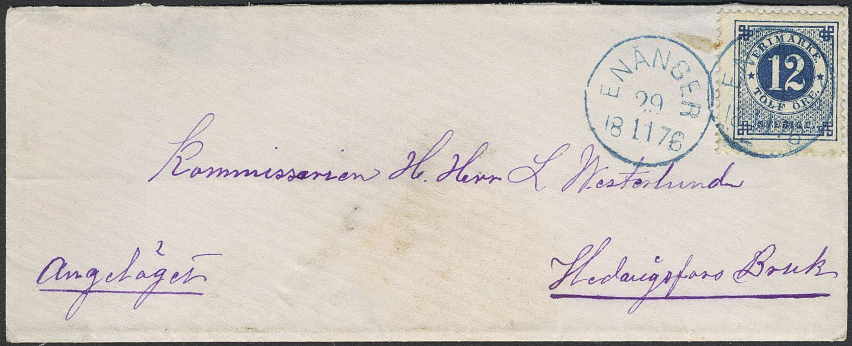 Sweden. Facit 21, X county. ENÅNGER 29.11.1876. Pmks in blue colour on cover with also a seal from the Post office on the reverse, sent to Hedvigsfors Bruk.