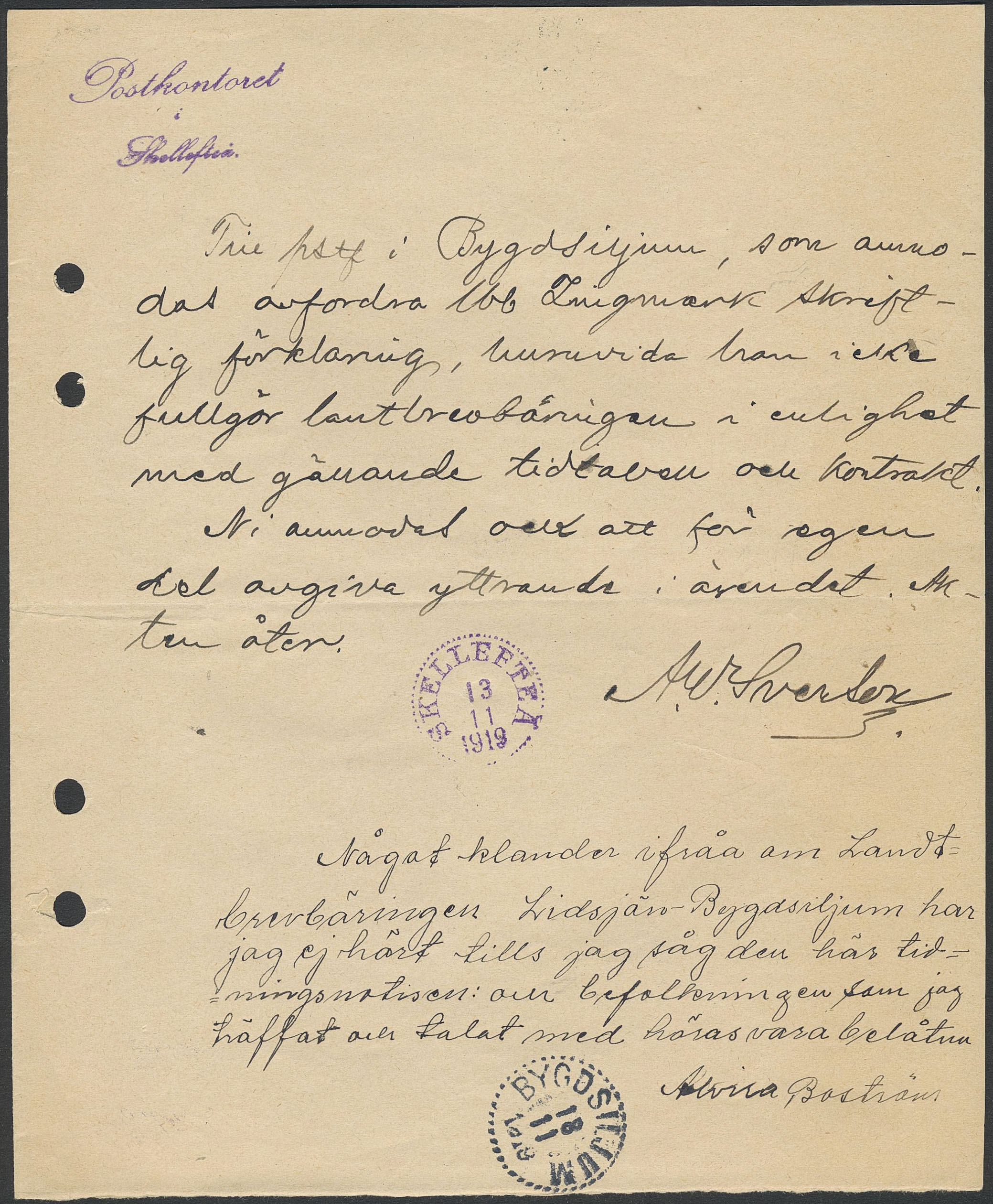 Sweden. AC county. SKELLEFTEÅ 13.11.1919. Cancellation in violet colour on letter sent to BYGDSILJUM 18.11.1919. RR during 19th century, not recorded during 20th century, according to the census by SSPD.