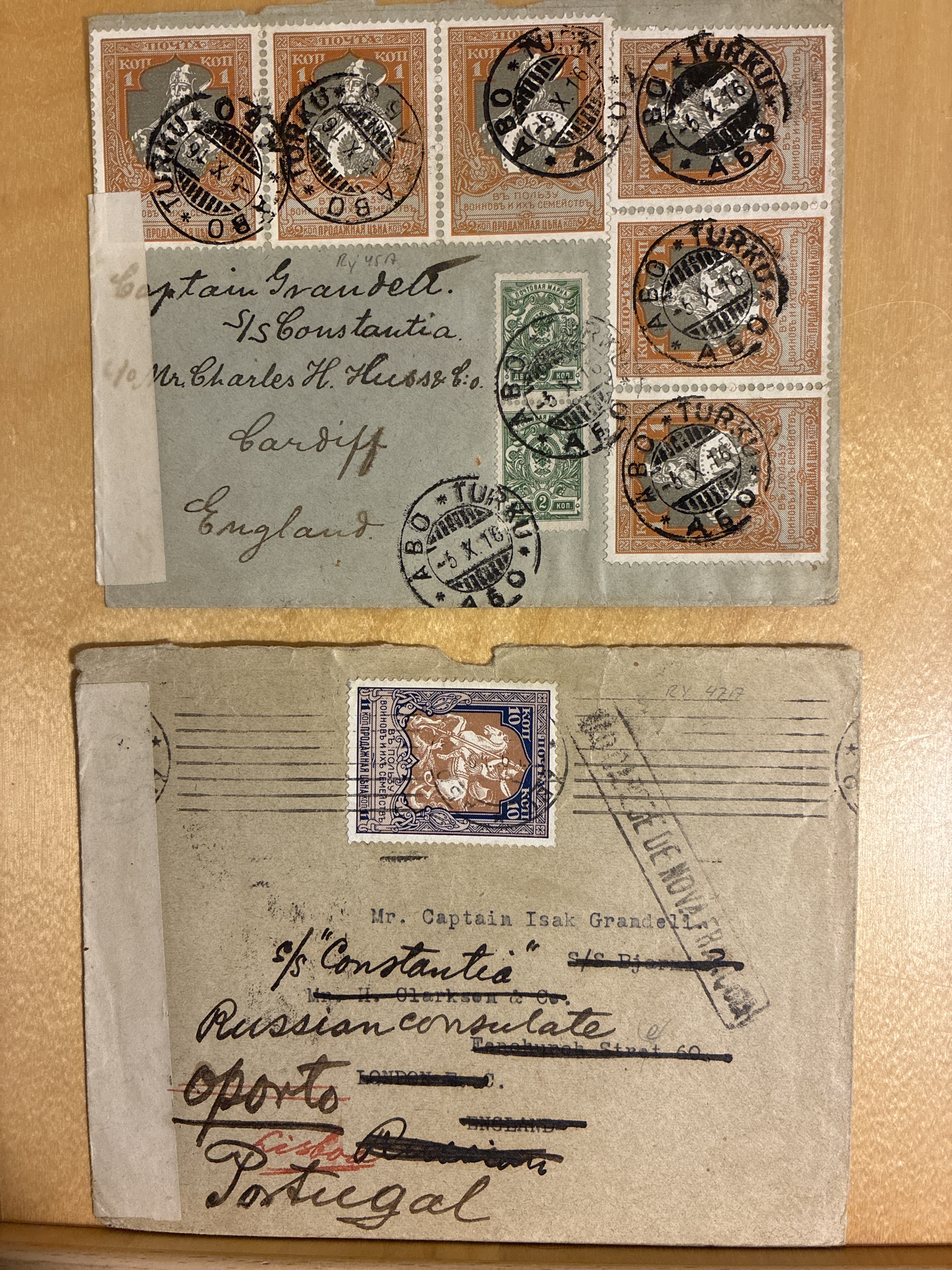 Finland. Lot covers 1916 in envelopes. Charity stamps, 2 covers. RV5x6, R19x2 canceld ÅBO 5.X.1916 to England. Censur Torneå. RV7 canceld ÅBO, LONDON and arrival Portugal. Censur Torneå. The entire lot is presented at www.philea.se. Mostly fine quality.