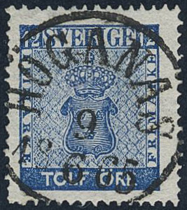Sweden. Facit 9b2 used, 12 öre dark blue. Superb cancellation HÖGANÄS 9.6.1865. Allegedly, position 53 plate 6. One weakly bent corner perf.