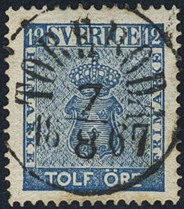 Sweden. Facit 9c3 used, 12 öre blue, perforation of 1865. EXCELLENT cancellation TÖREBODA 7.8.1867.