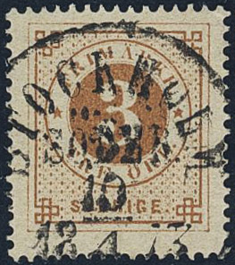 Sweden. Facit 17b used, 3 öre yellow-brown on smooth paper. Superb cancellation STOCKHOLM SÖDER 10.4.1873. Scarce shade in this quality. Signed by O.P.