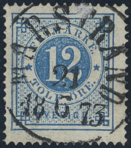 Sweden. Facit 21i used, 12 öre clear blue on ordinary paper. EXCELLENT cancellation MARSTRAND 21.6.1873. One short perf. Opinion (shade) by O.P.