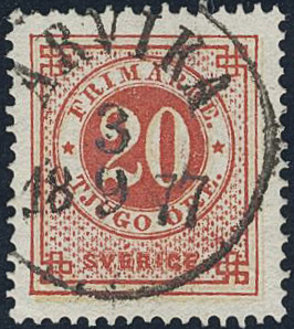 Sweden. Facit 23b used, 20/20 öre red on pale orange. Superb cancellation ARVIKA 3.9.1877.