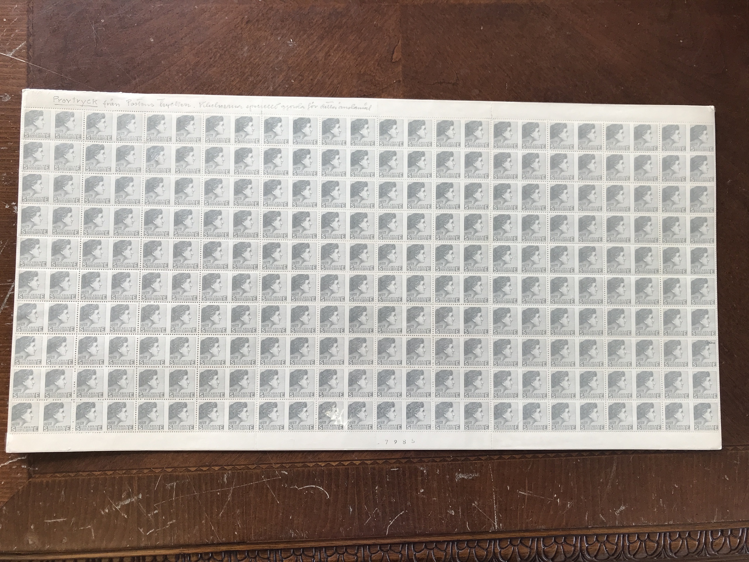 Sweden. Proof Facit P ★★, SVEN EWERT 'Kvinnohuvud' in block-of-240 test stamps in grey colour. The large unit have upper and lower margins.