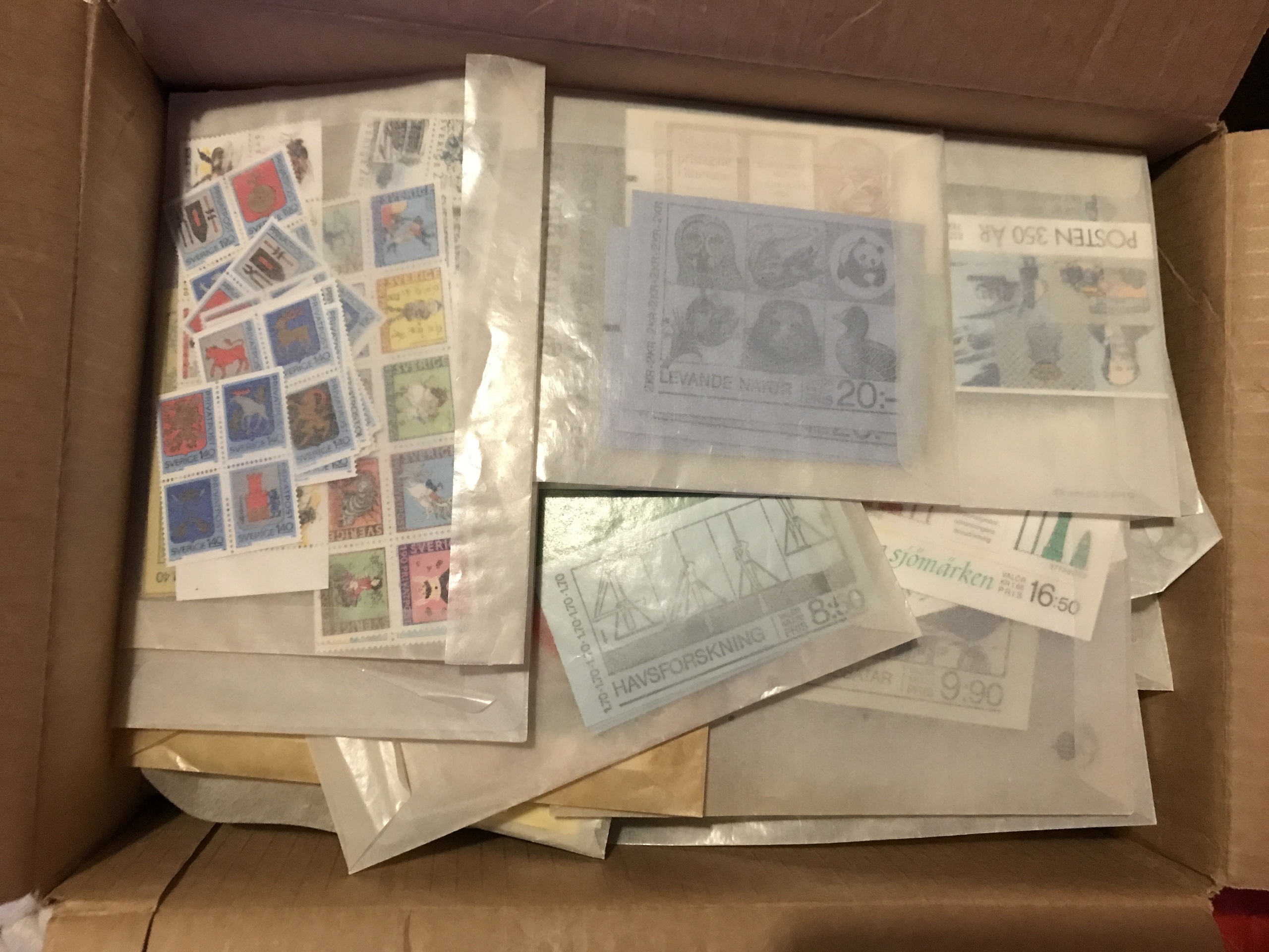 Sweden. Face value. Box with booklets and blocks etc. mostly 1970–80s. Face value >5300 + 84 discount stamps.