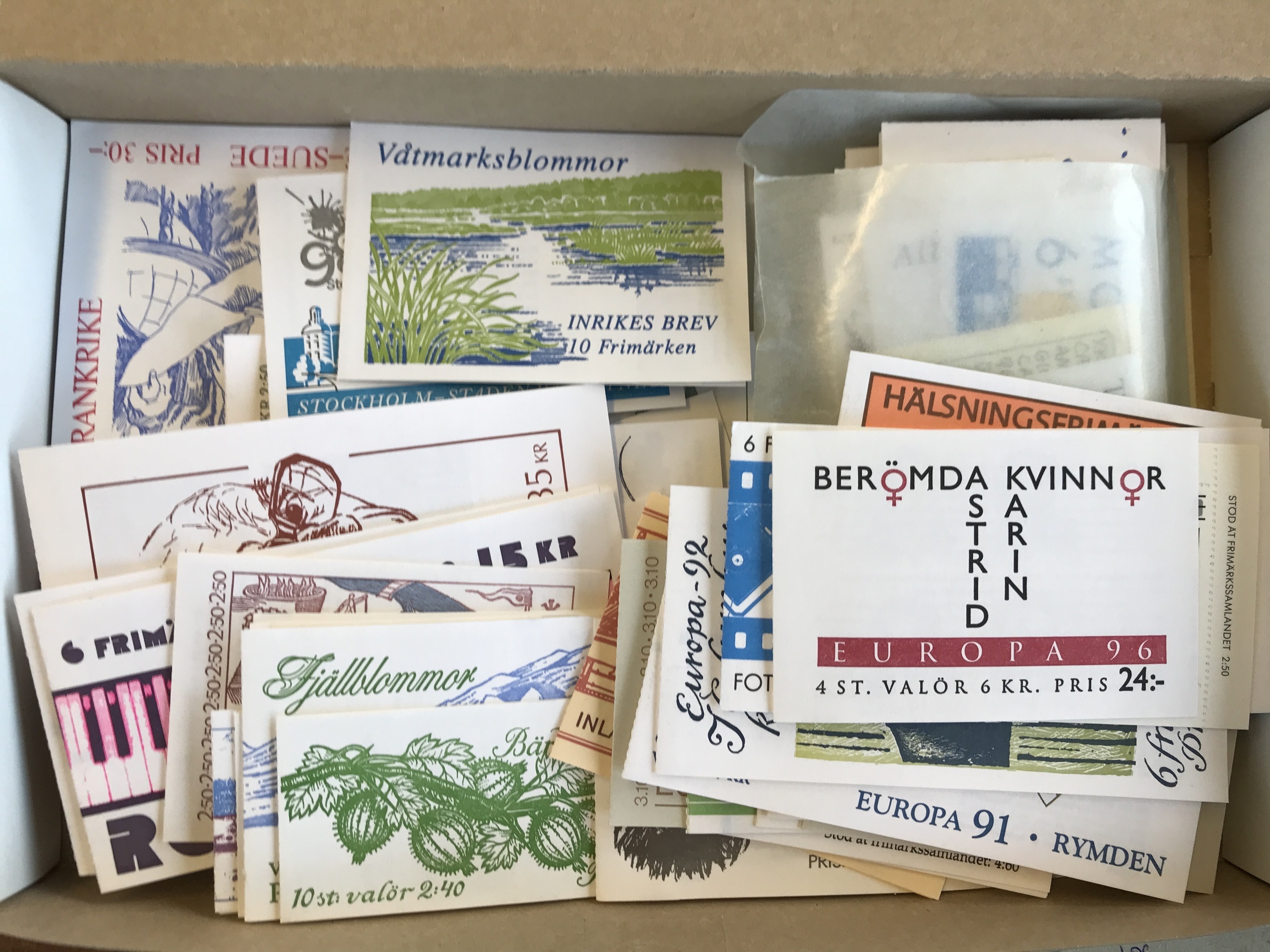Sweden. Face value. Booklets and few stamps mainly 1986–1999. Face value approx. 3100 + 67 'Sverige BREV', 20 discount stamps and ten Christmas stamps.