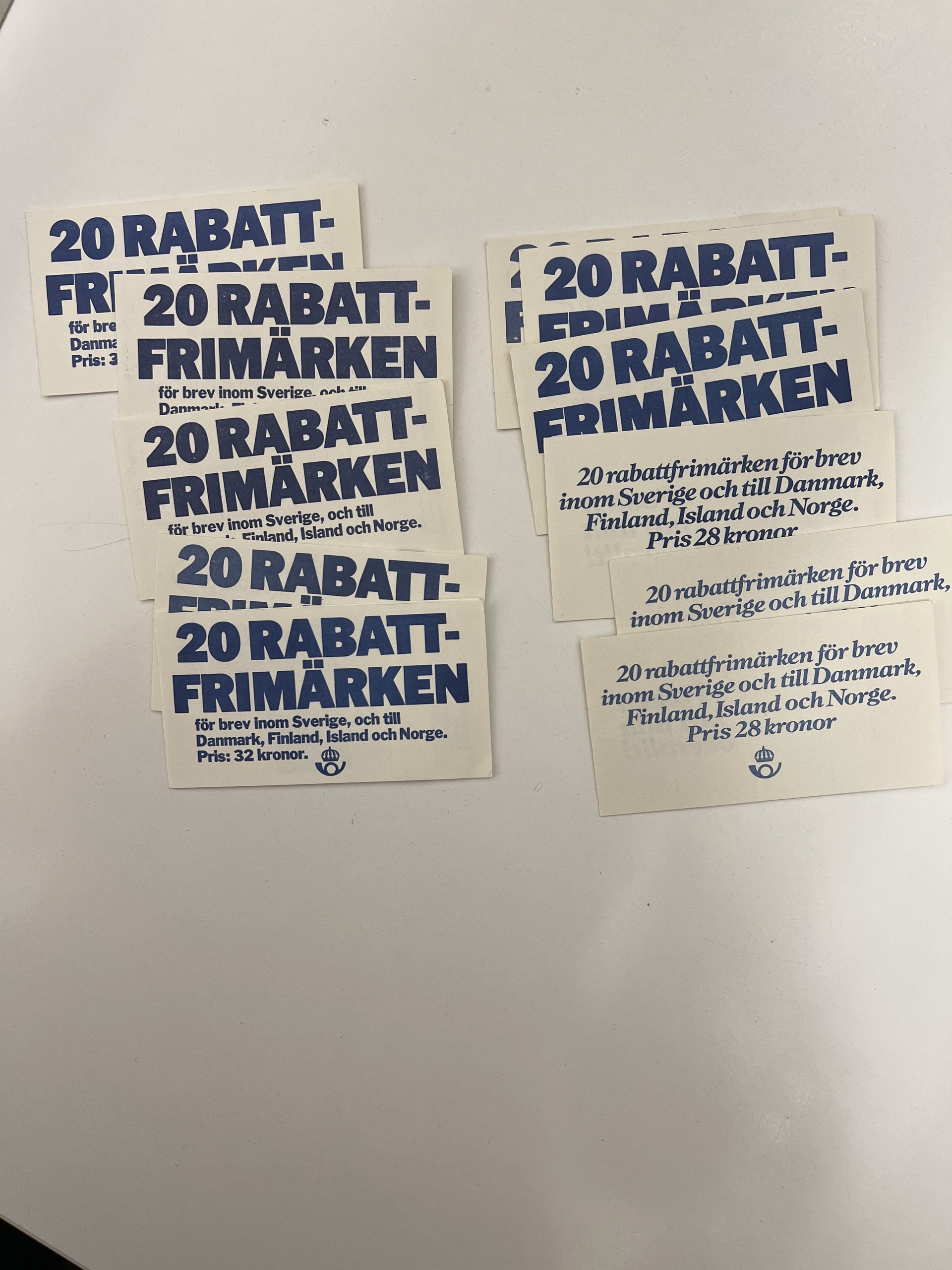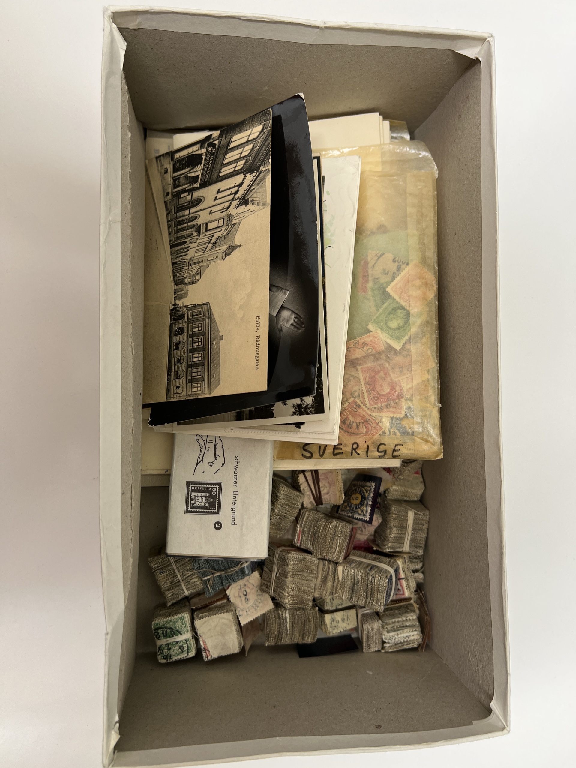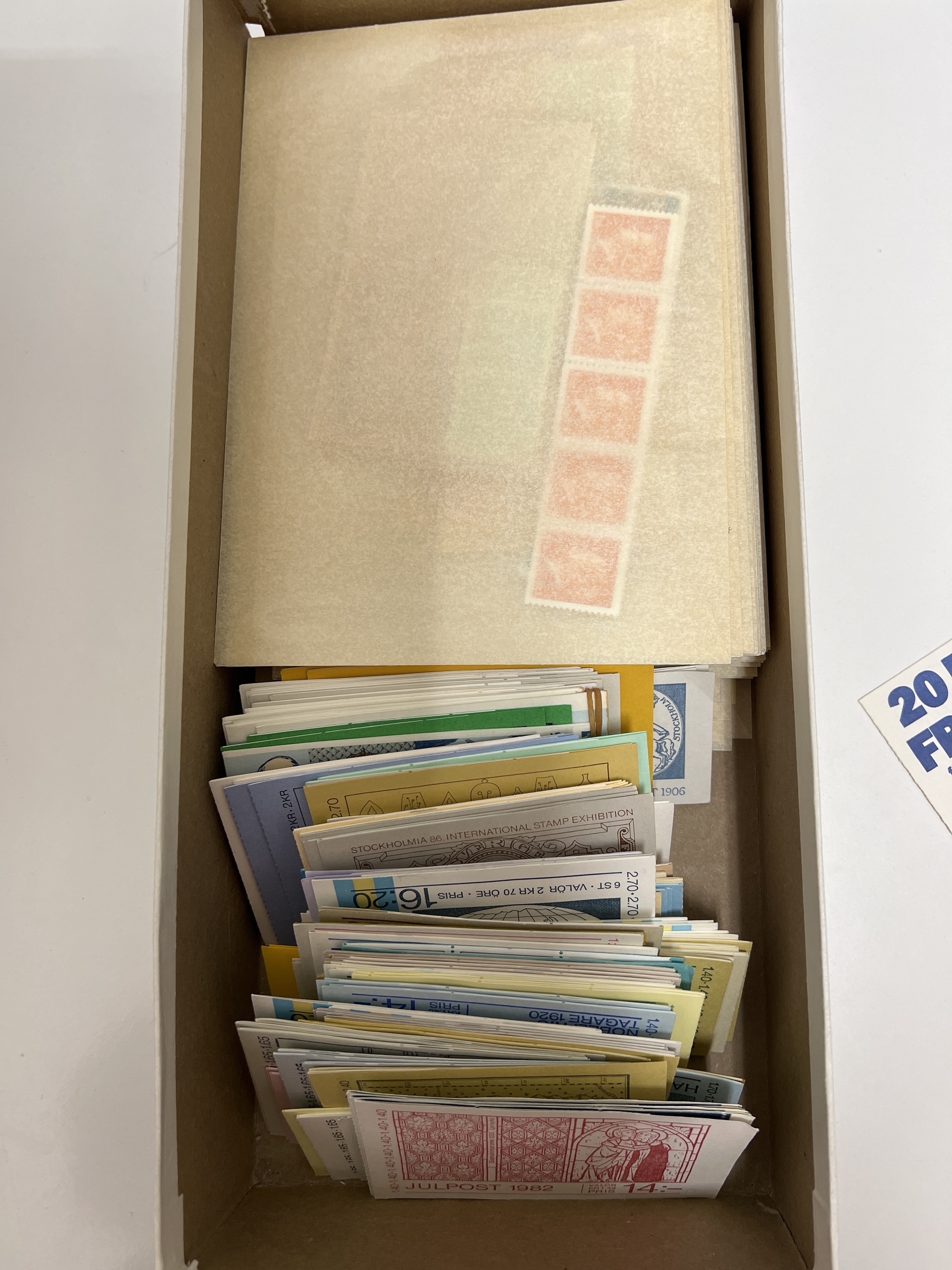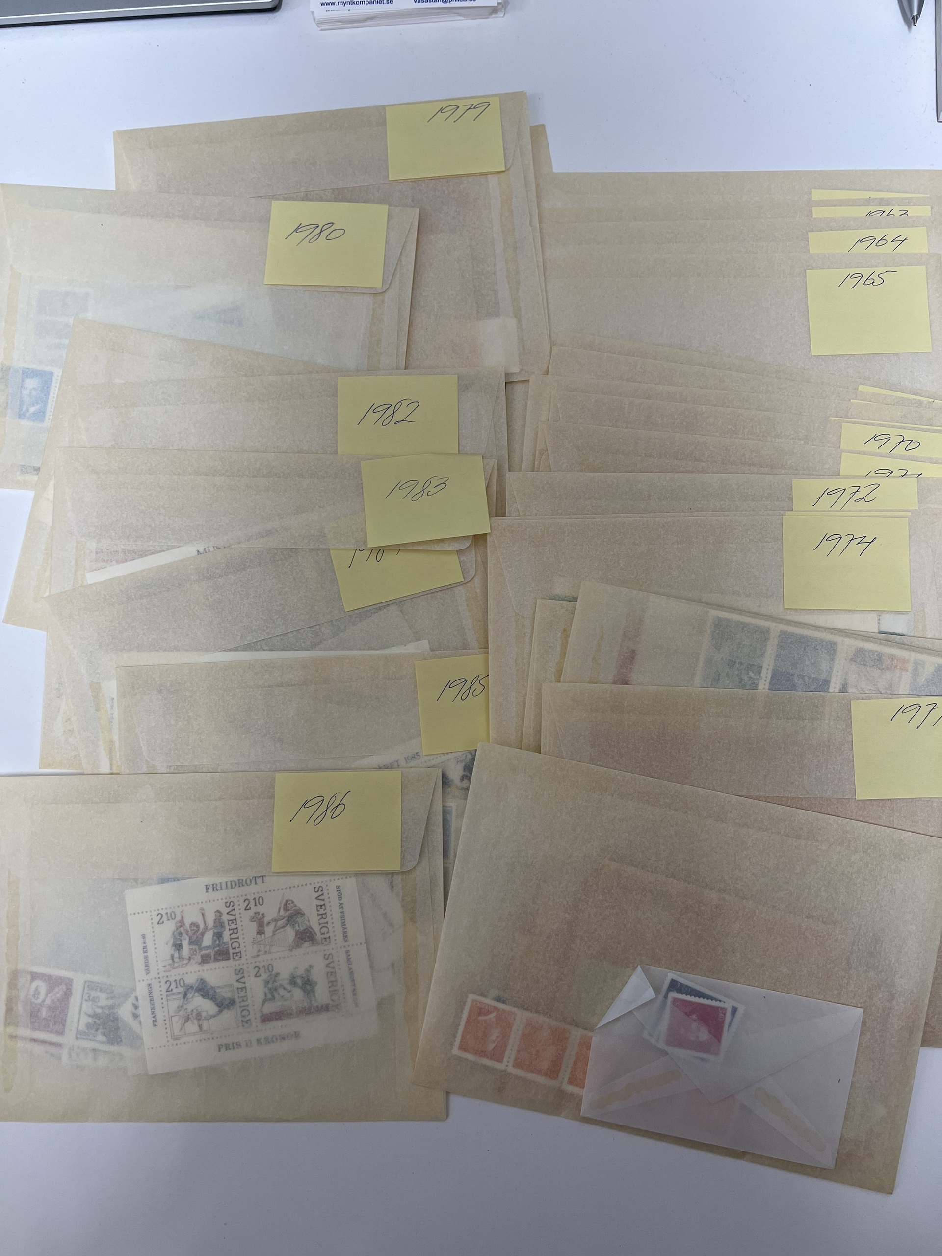 Sweden. Face value, lot 1960–1980s incl 11 discount booklets, plus cpl. year sets in glassines and some other souvenir sets. Also box with bundles, mostly foreign plus box FDCs and albums with various. Approx. 9 kg.