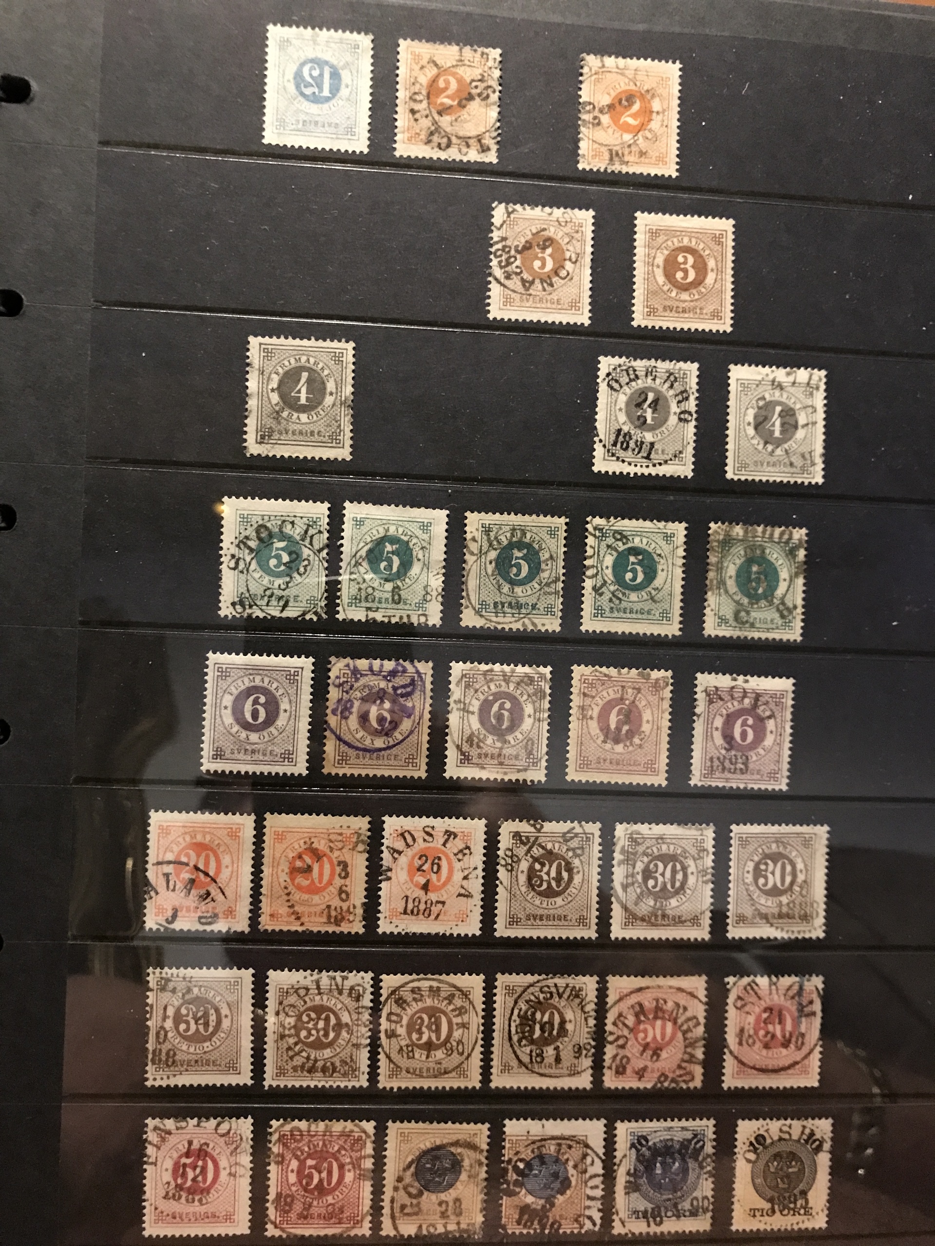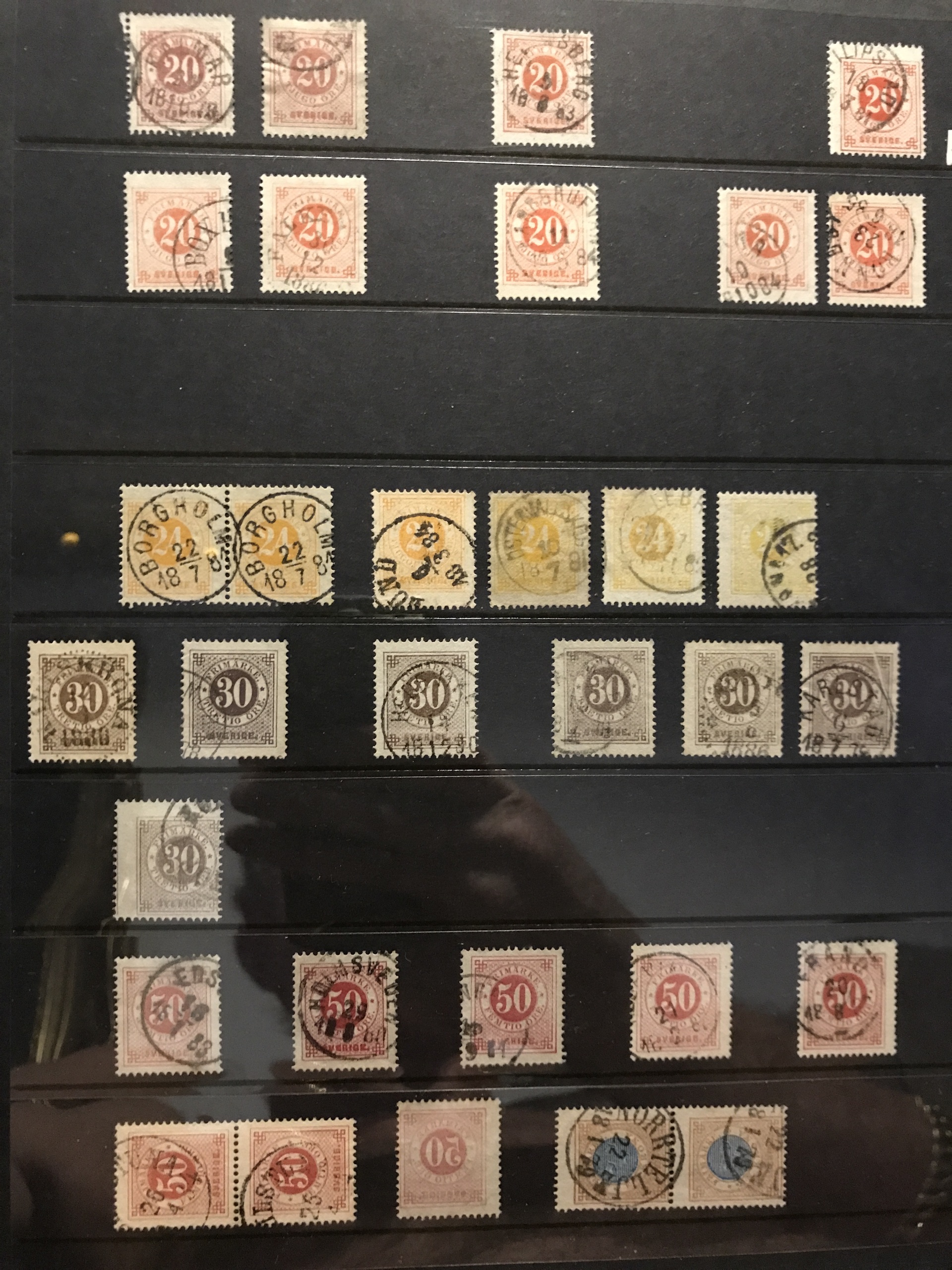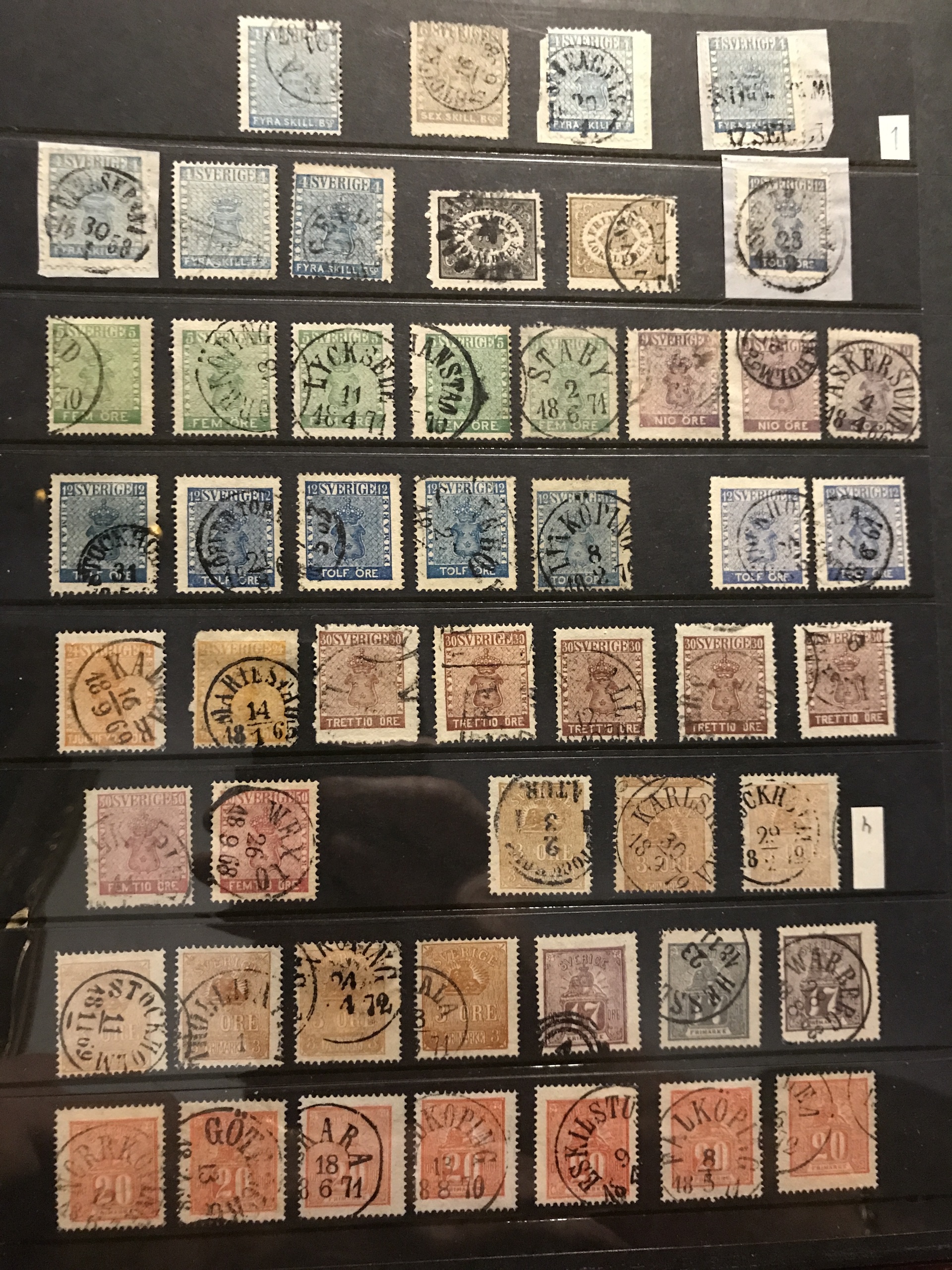 Sweden. Used. Visir binder with several better stamps 1855–1920 incl. six 4 skill, 6 skill (some short perfs), both local stamps, over-complete Coat-of Arms, 17 öre grey, nice Circle types, some cancellations and varieties, etc. Please see a selection of scans at www.philea.se. Somewhat mixed quality.