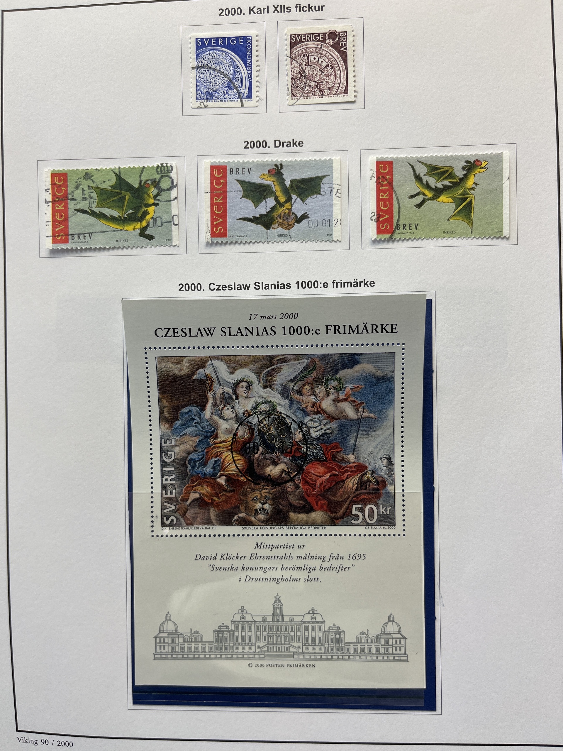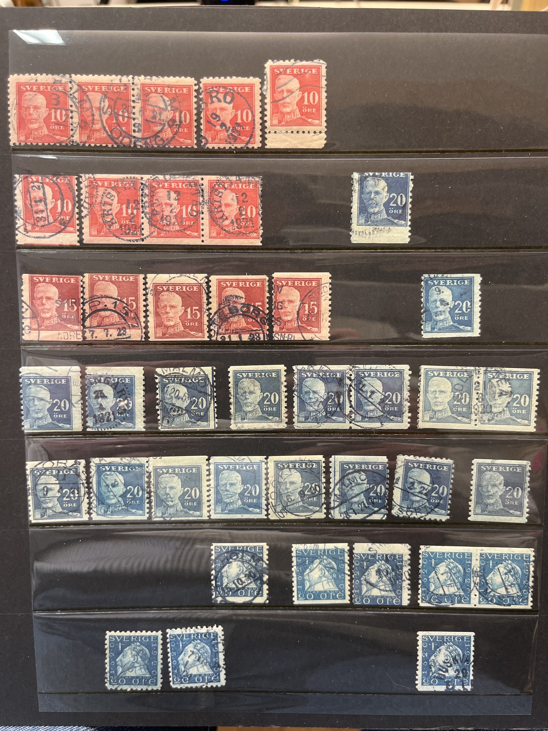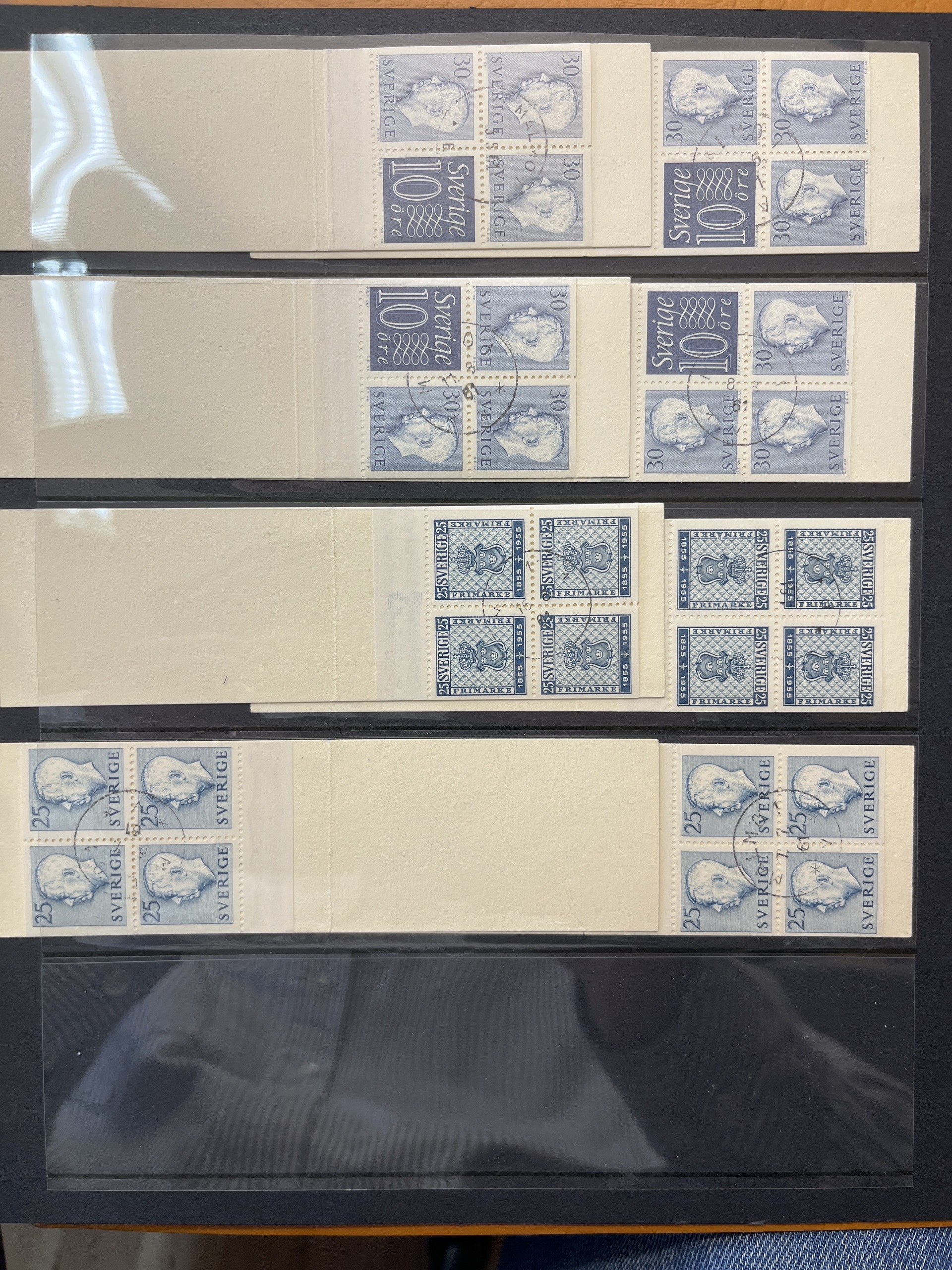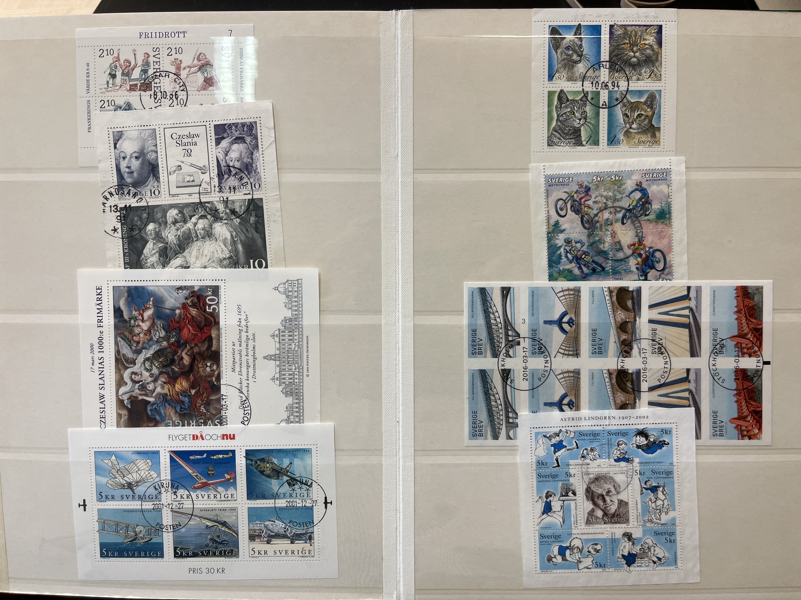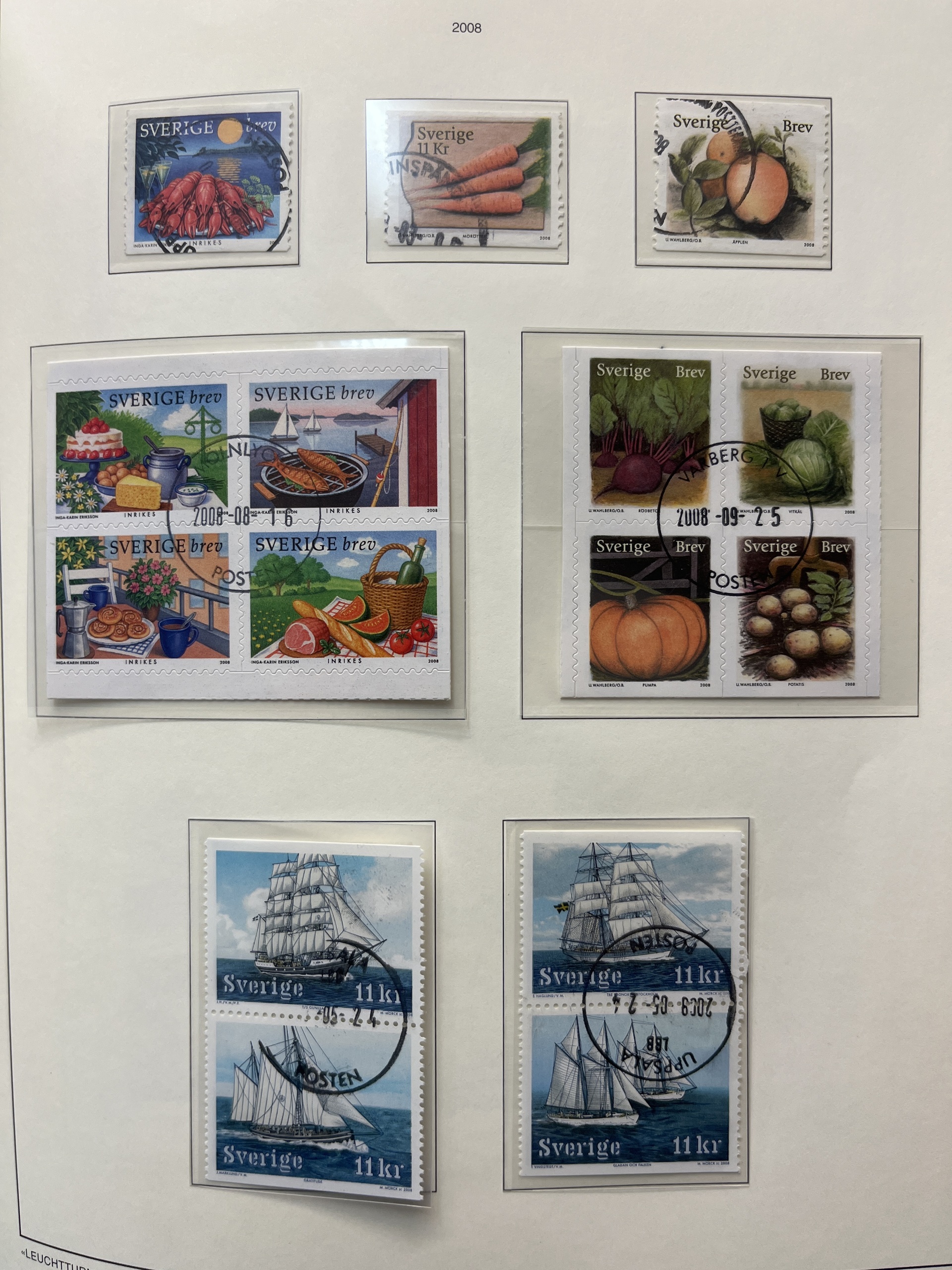 Sweden. Accumulation used in two removal boxes with ten albums. E.g. three Leuchtturm albums with stamp mounts 1974–1997 and 1970–2009 and a removal box with duplicates in glassine envelopes (most Sweden). Approx. 31 kg.