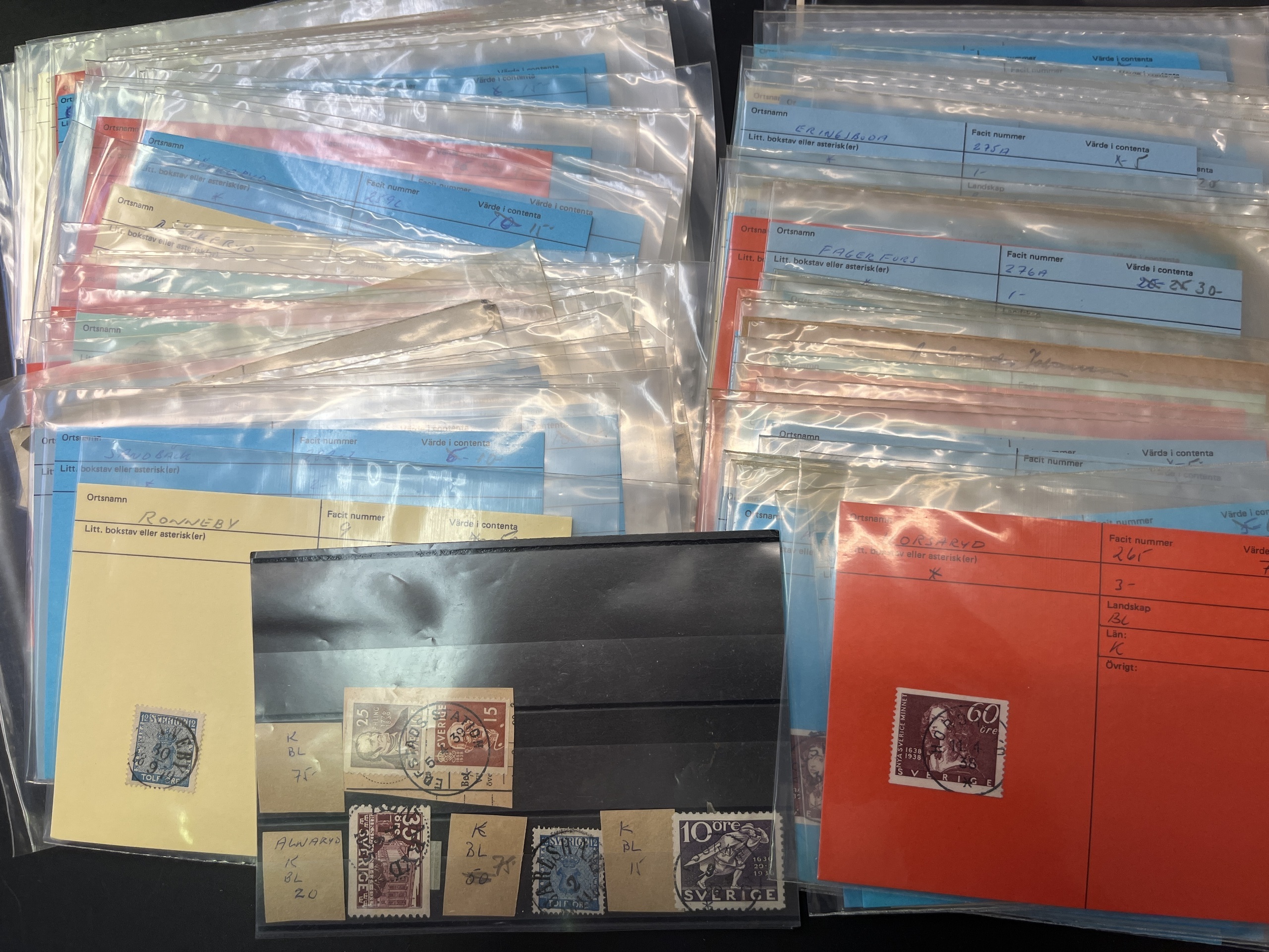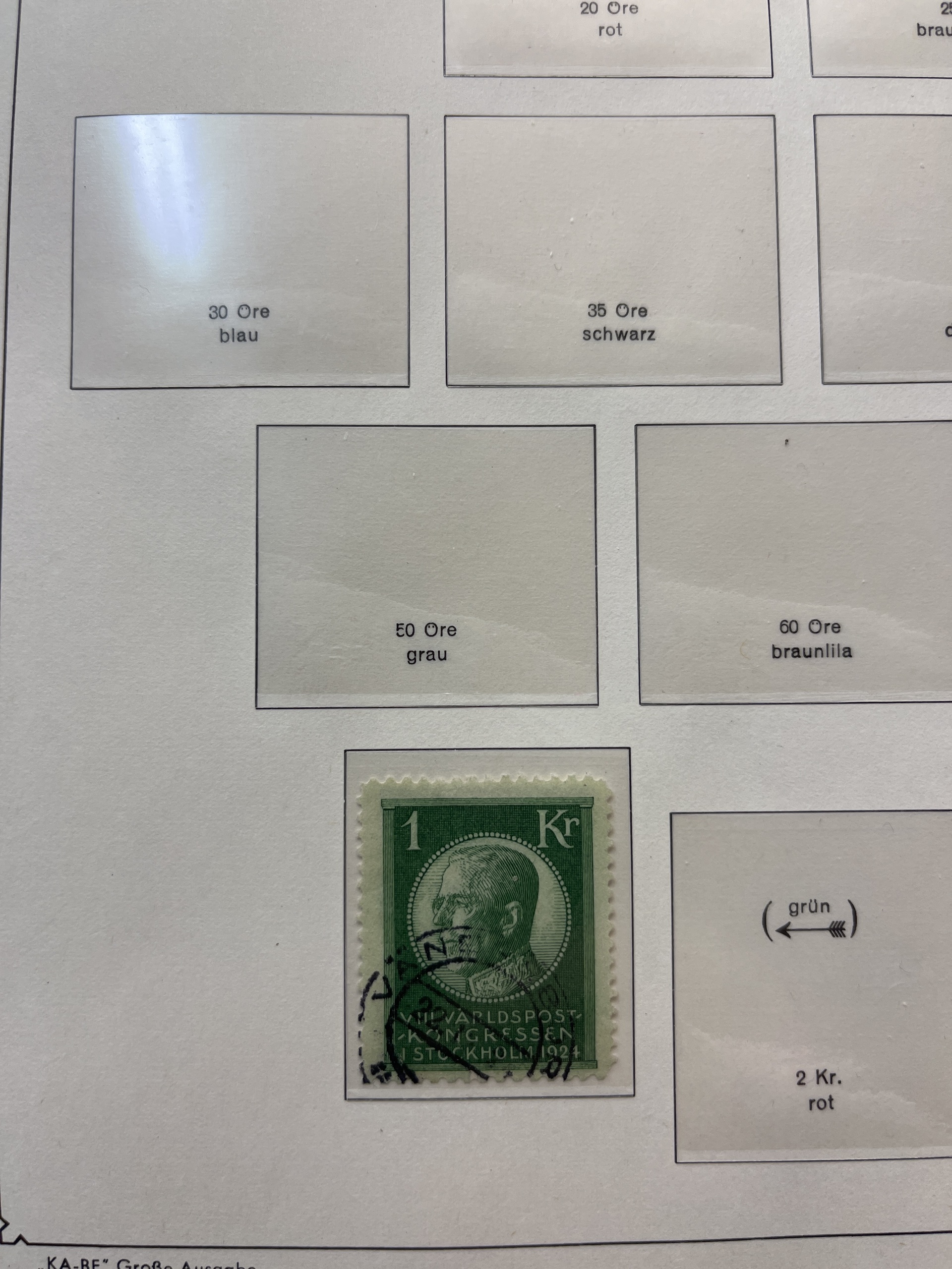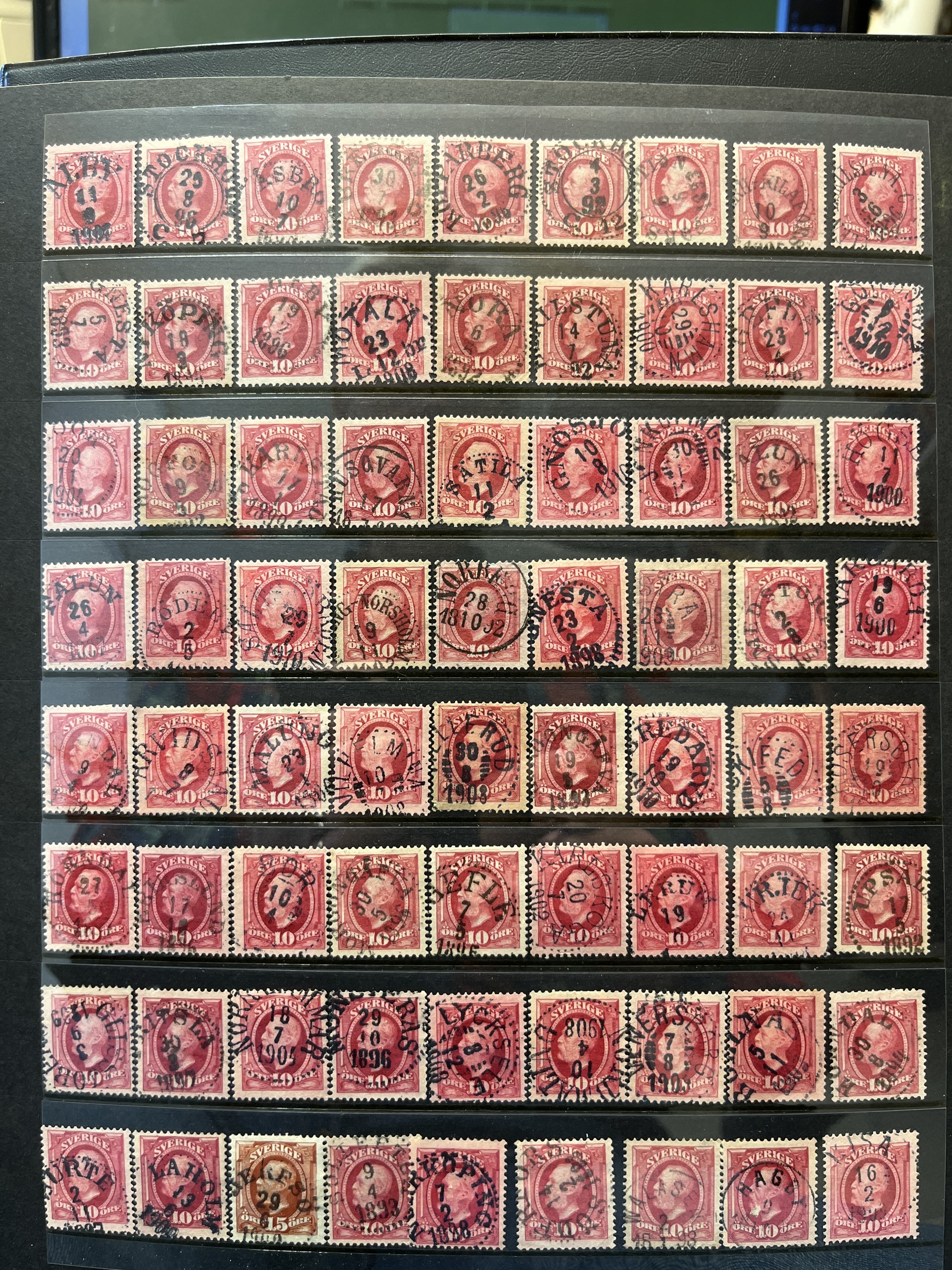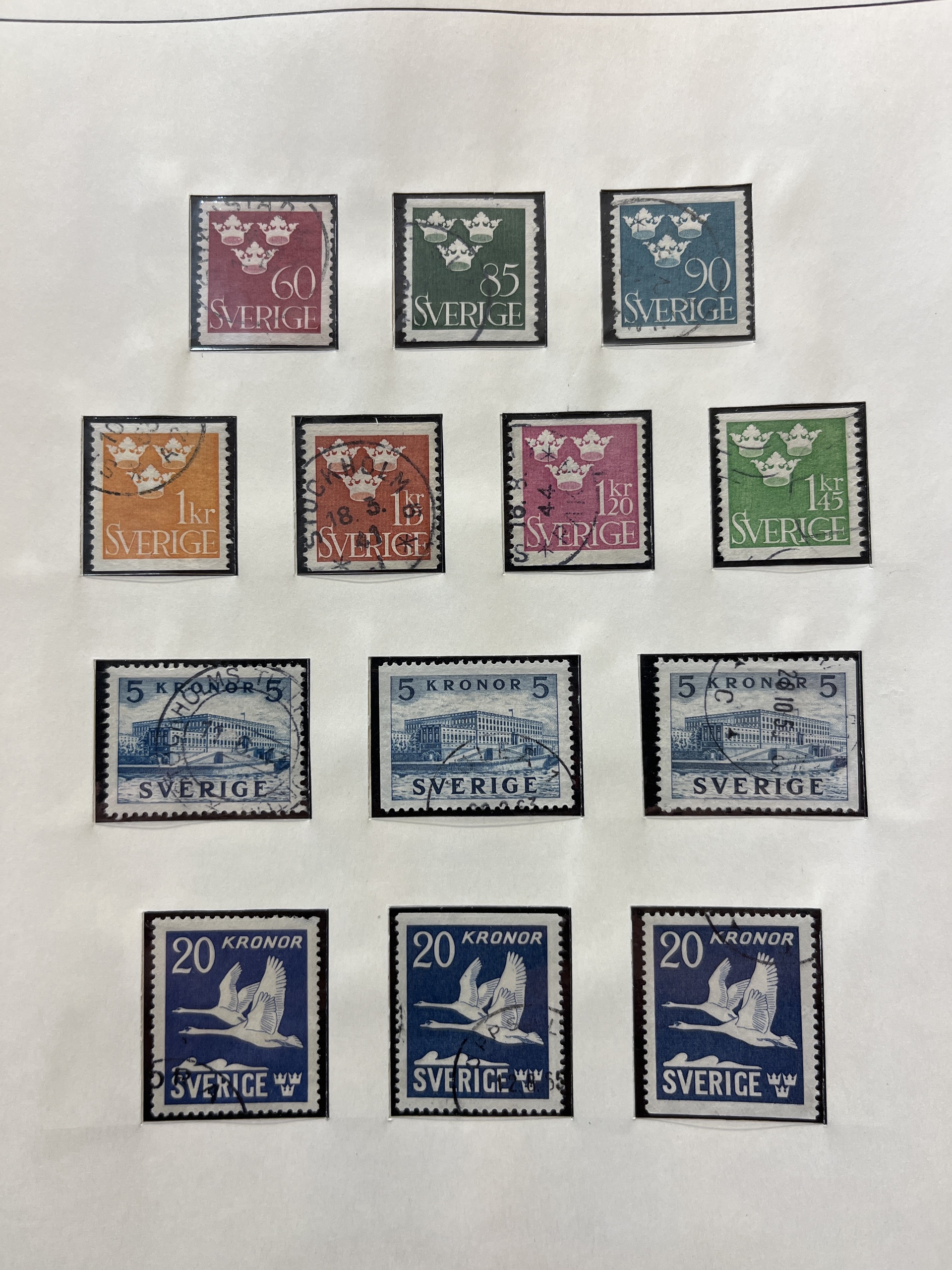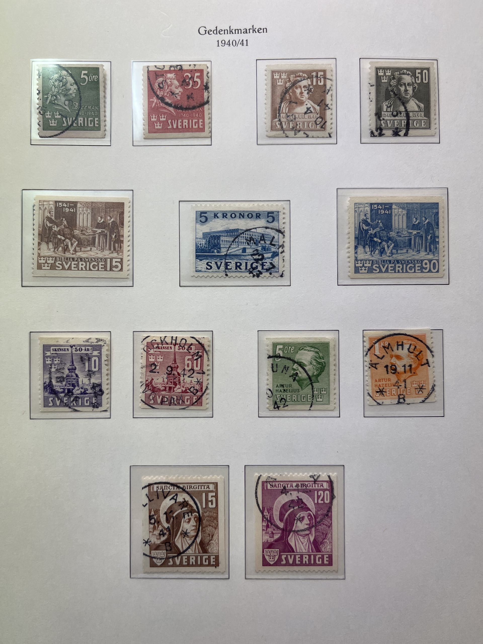 Sweden. Collection/accumulation used in box. with e.g. collection 1858–1959 (few stamps) in KA-BE album with stamp mounts, also duplicates in box and album. Approx. 6 kg.