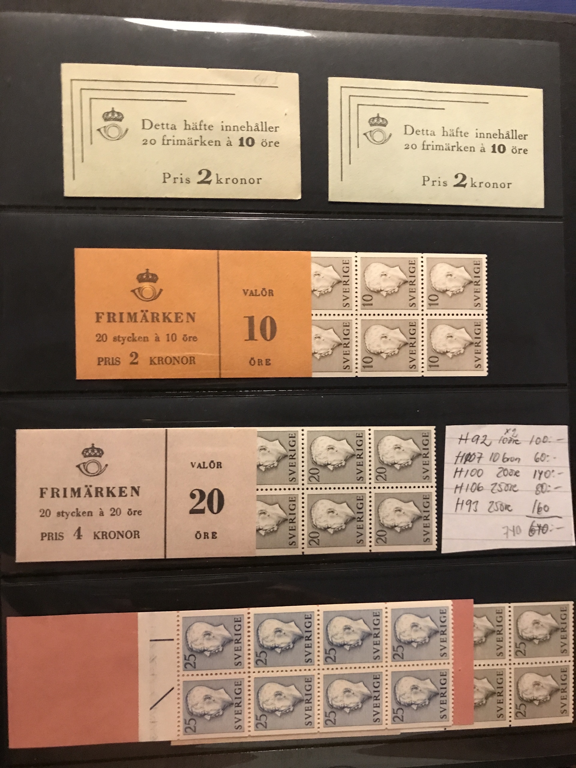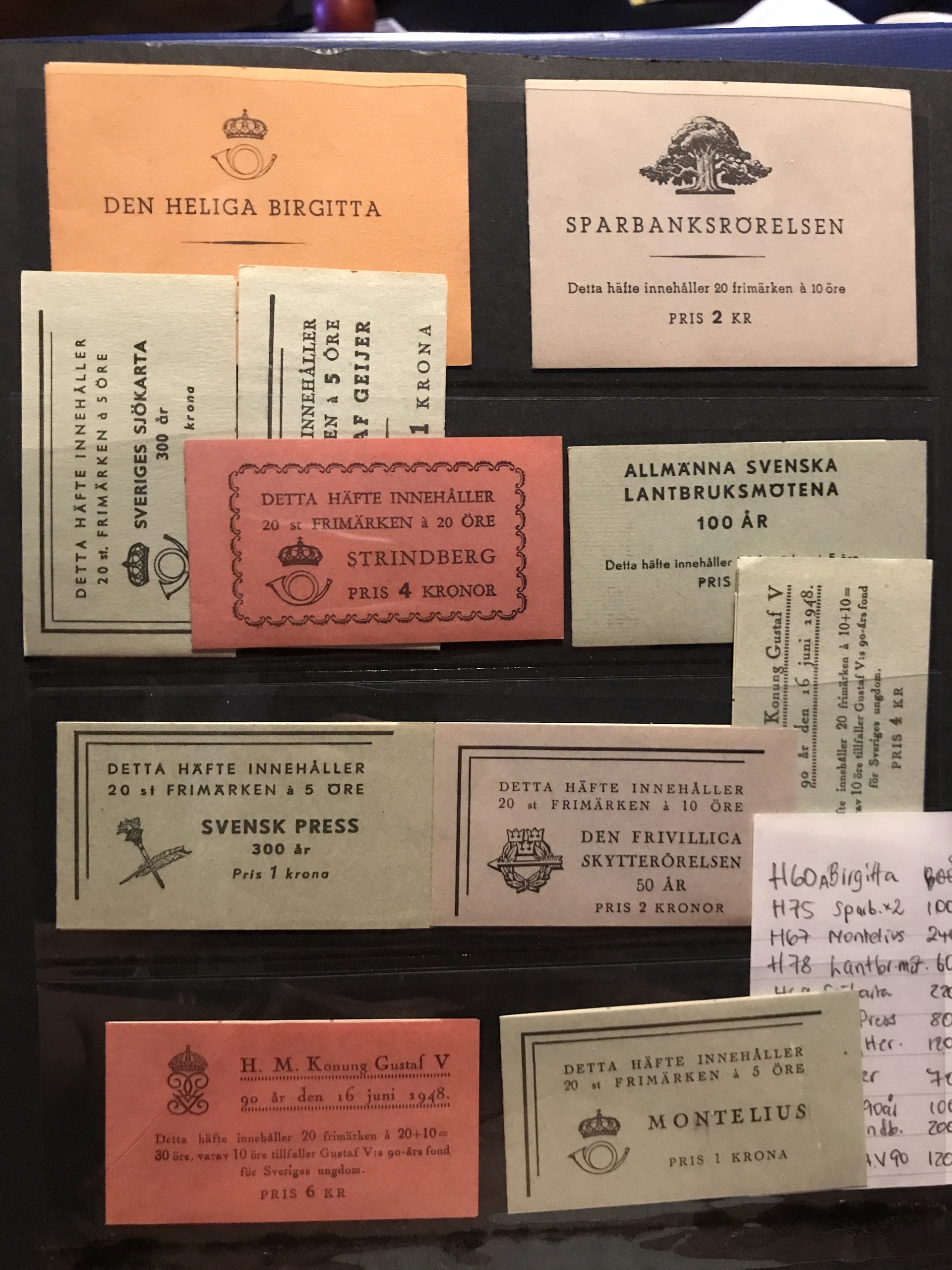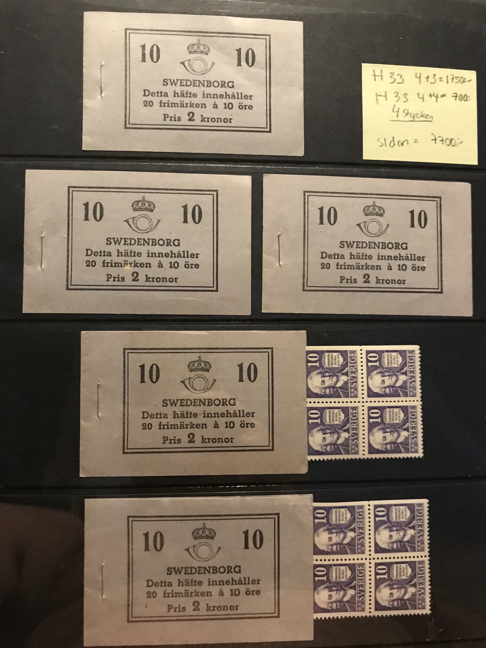 Sweden. Booklets. Two Visir binders with about 210 booklets mainly 1932–72 incl. 22 handmade. Containing e.g. four H23, six H24, one H27, three H28, 29, 31, five Swedenborg incl. four CB, H35C. Further e.g. H60 and 70 and some slot-machine booklets. Please see a selection of scans at www.philea.se.