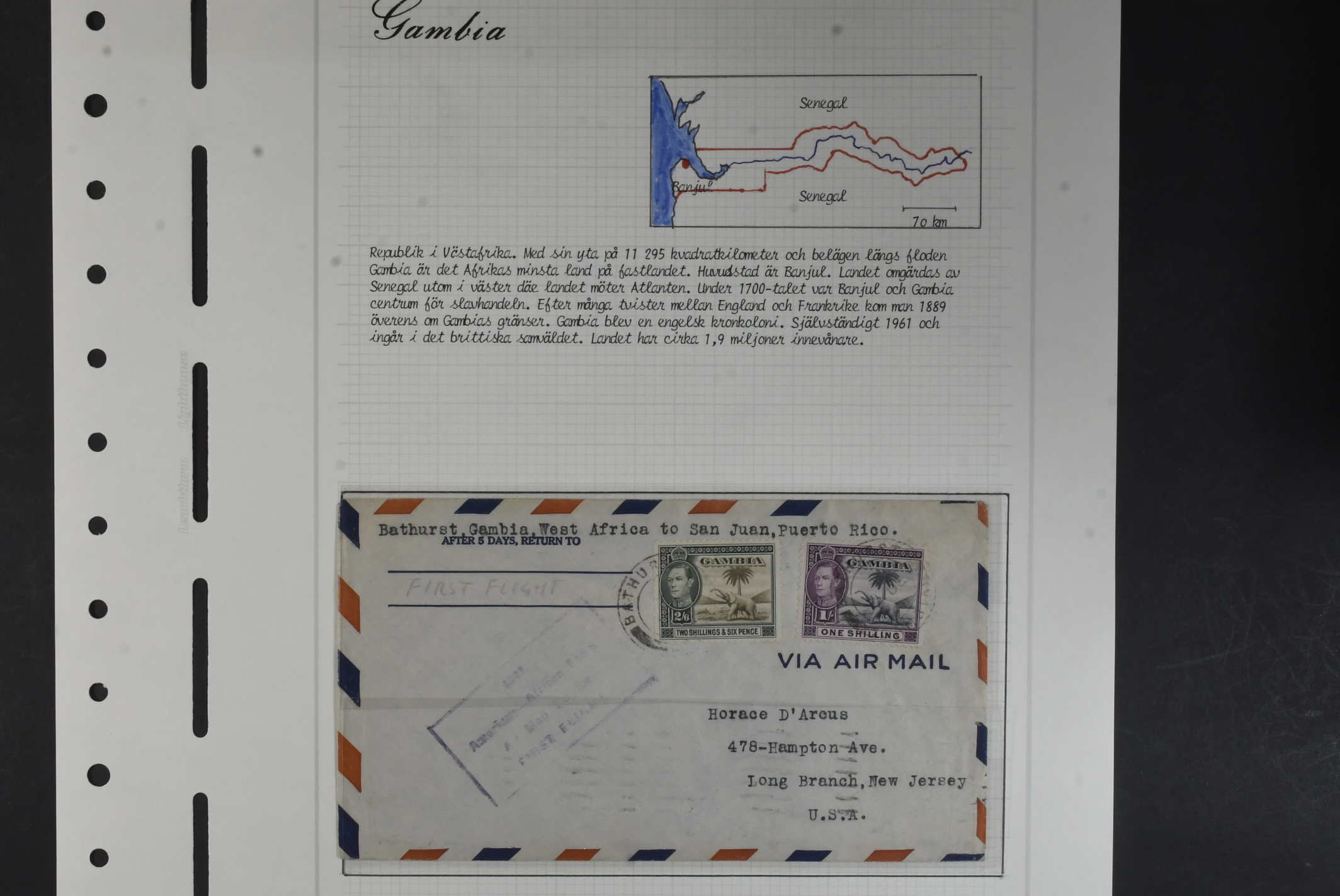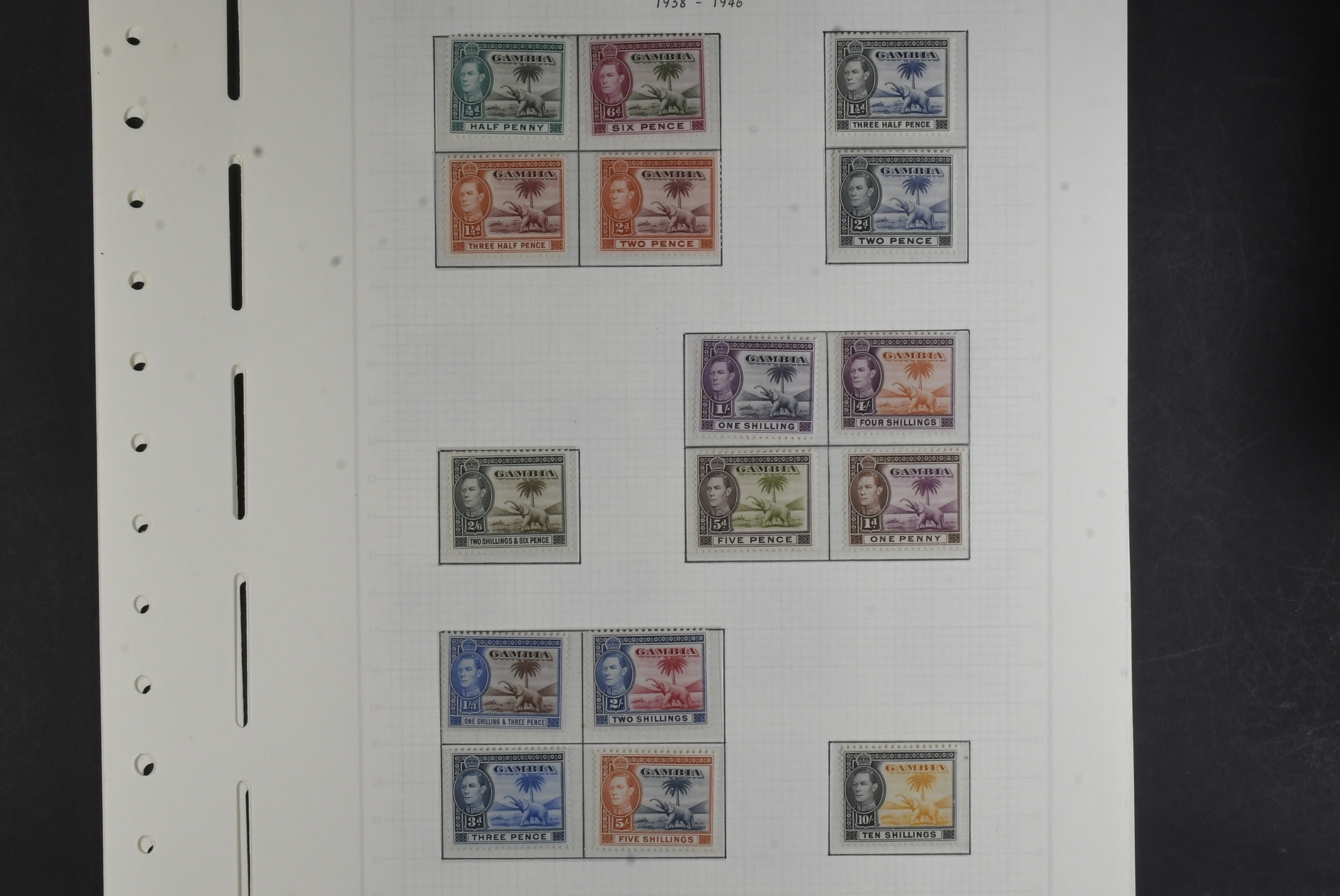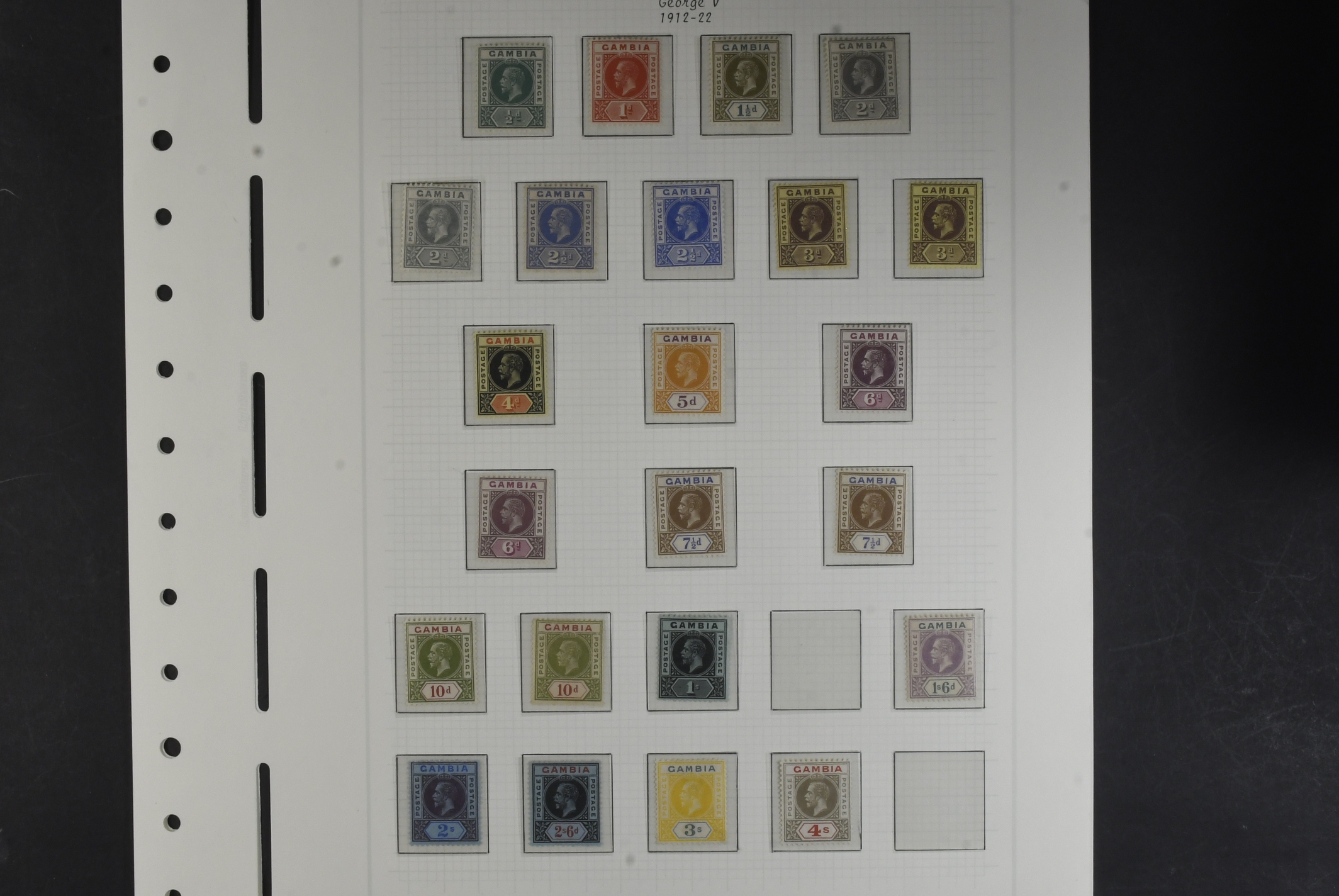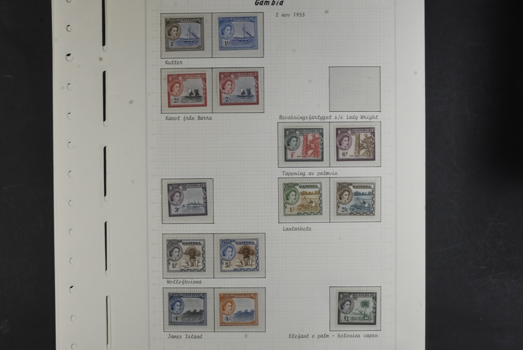Gambia. Collection ★ 1912–1953 on leaves without stamp mounts. Well filled and with some better stamps e.g. SG117, 134a, 139, 140, 141, 150–168, 165. The entire lot is presented at www.philea.se. Mostly fine quality. (72)