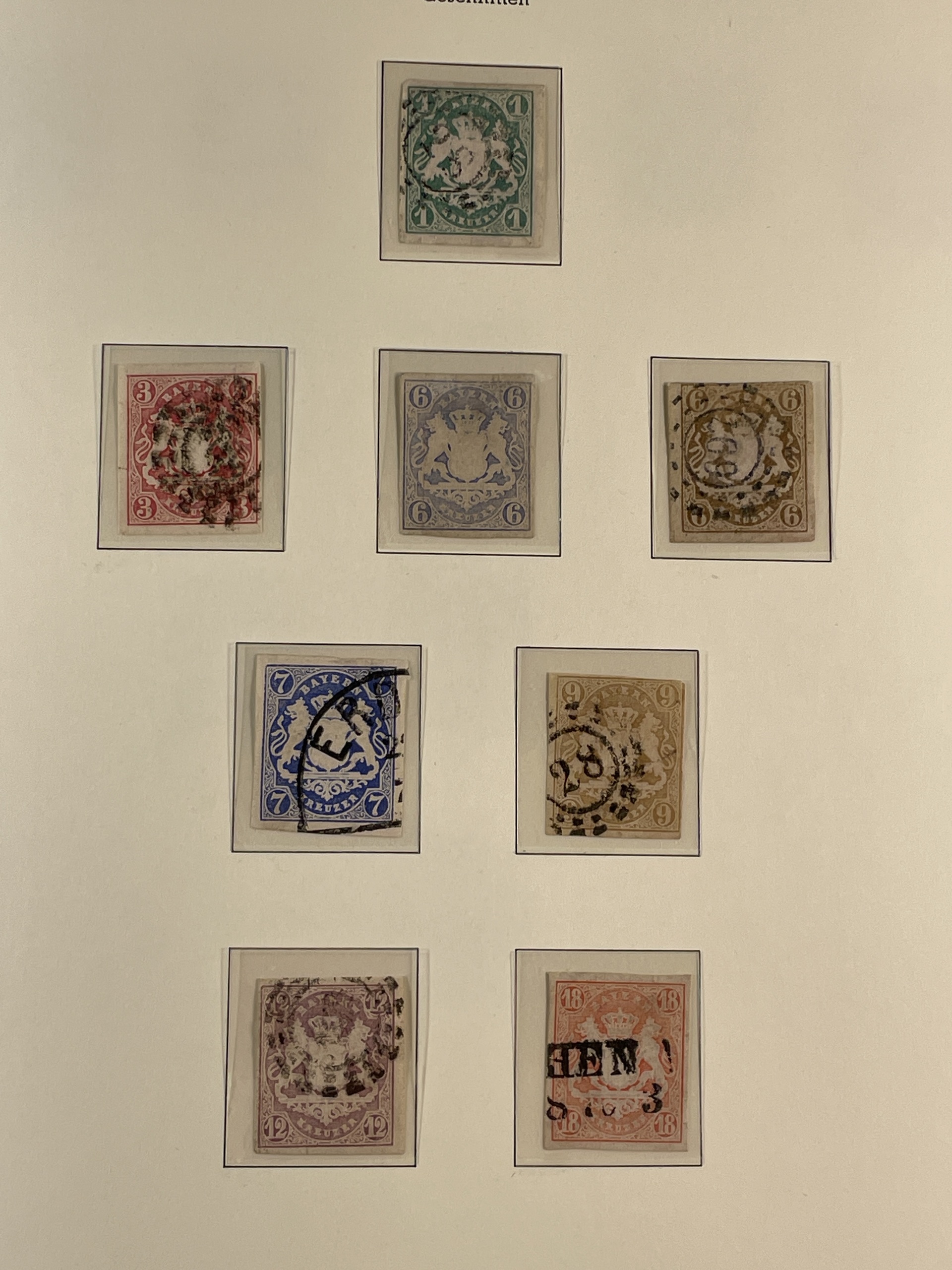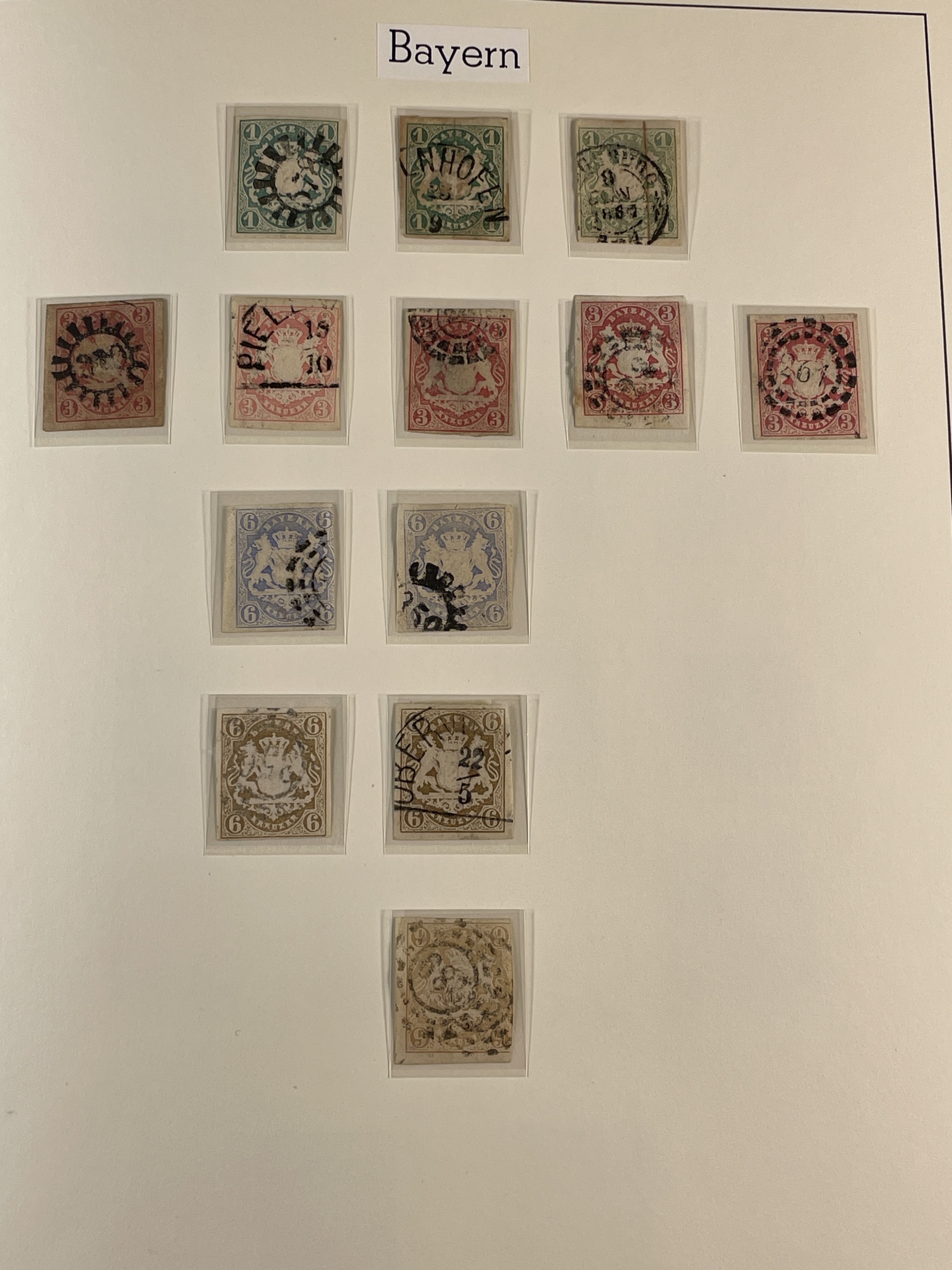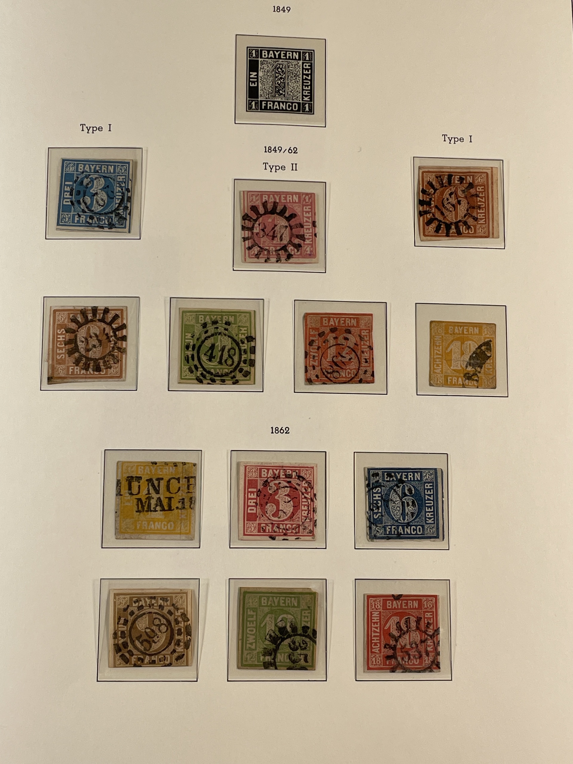 Germany, Bavaria. Collection ★★/★/⊙ 1849–1920 in Leuchtturm album with stamp mounts. Nice collection incl. better stamps and sets many shades and some cancels. Viewing is recommended. Please see a selection of scans at www.philea.se. Somewhat mixed quality. (550–600)