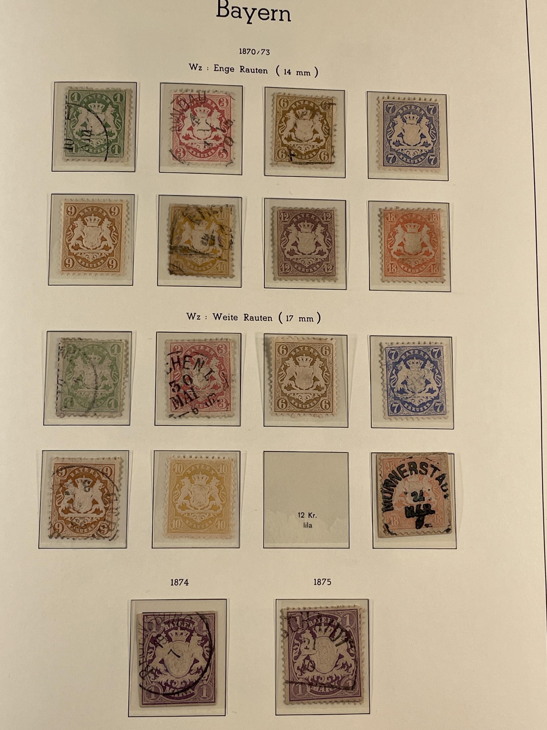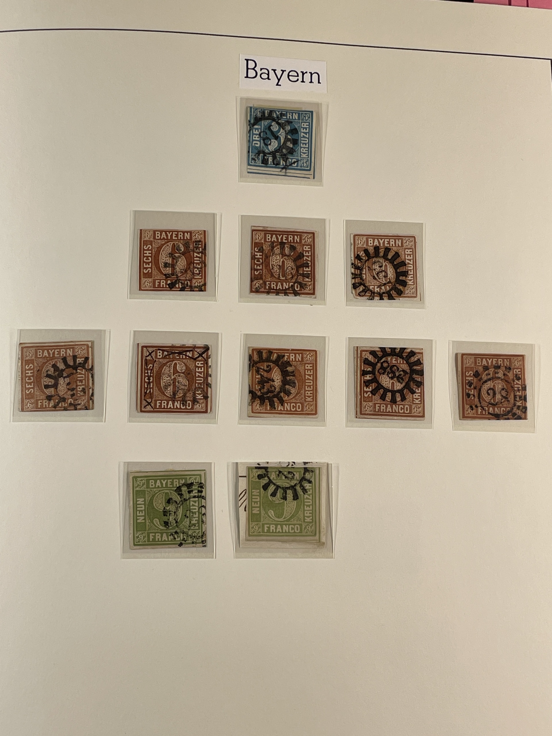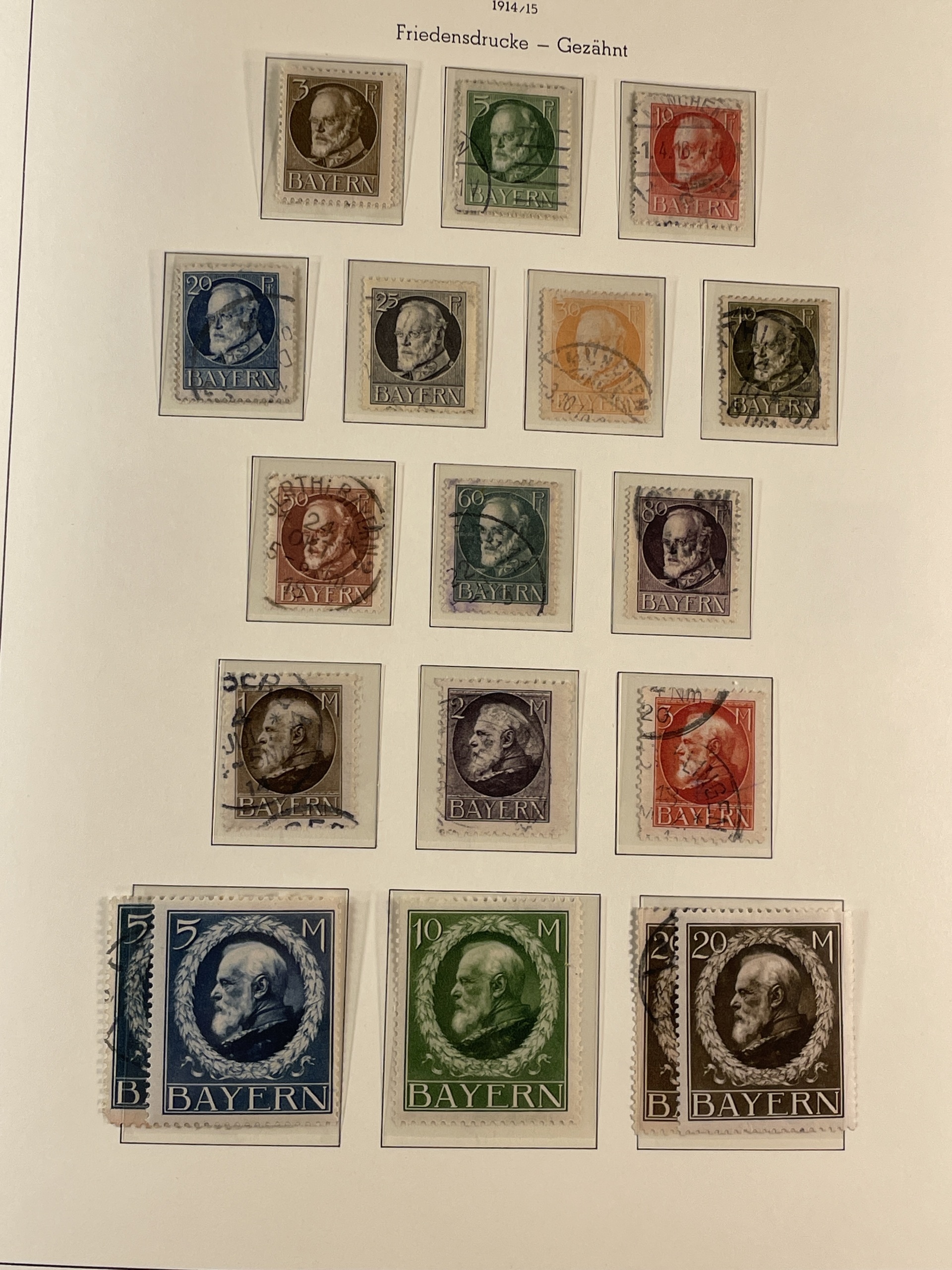 Germany, Bavaria. Collection ★★/★/⊙ 1849–1920 in Leuchtturm album with stamp mounts. Nice collection incl. better stamps and sets many shades and some cancels. Viewing is recommended. Please see a selection of scans at www.philea.se. Somewhat mixed quality. (550–600)