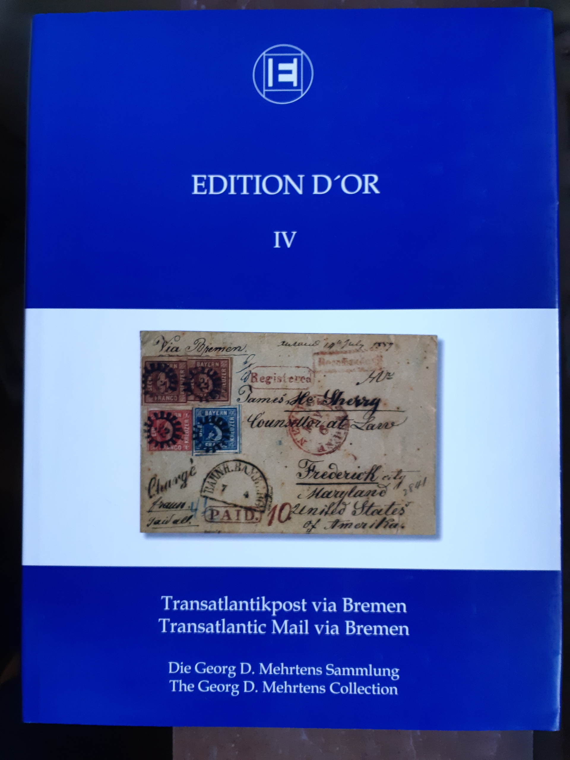 Literature. EDITION D'OR, Vol. IV 'Transatlantic Mail via Bremen – The Georg D. Mehrtens Collection', Heinrich Köhler, 2006. The Large Gold awarded exhibit depicted in its entirety, hardcover, with dust jacket, 239 pp., introduction bilingual English/German. Sold out at publisher. Used.