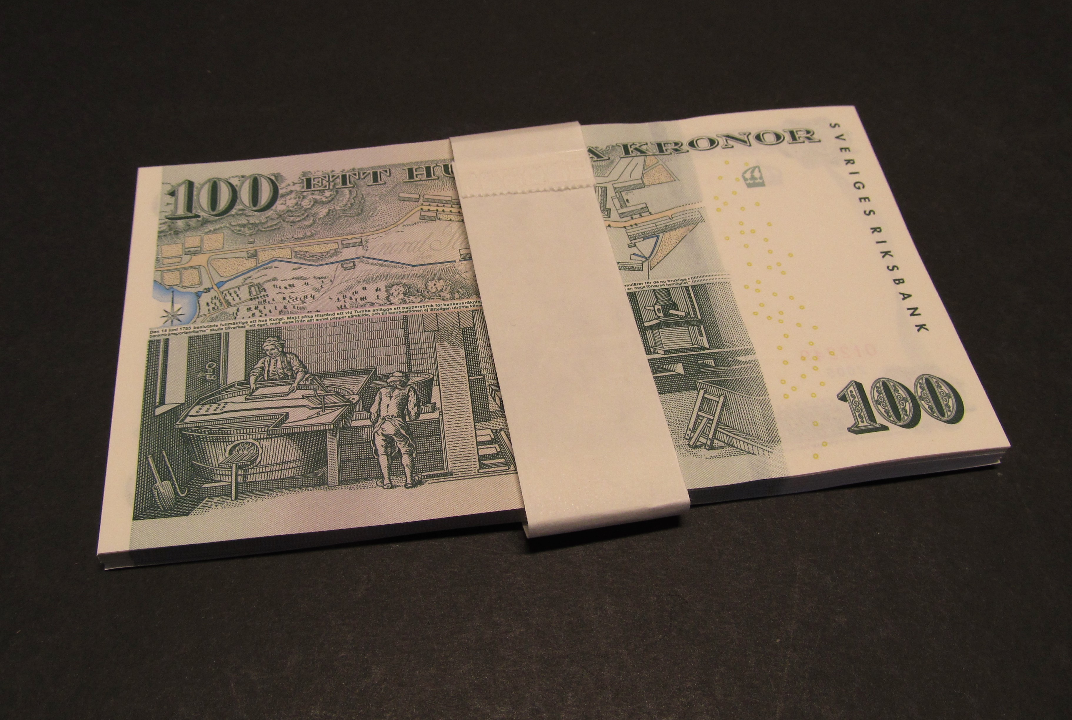 Banknotes, Sweden. SF Jub3:1, 100 kronor 2005. Commemorative issue to Tumba Bruk's 250th Anniversary. Partial bundle of 42 pcs with wrapper from serial number 012208–012249. 01/0.
