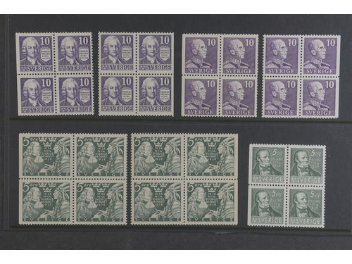 Sweden. ★★. 19 different blocks-of-four with BC/CB-pairs incl. both Berzelius and Bellman, Linné CB, etc. F 27000. The e..