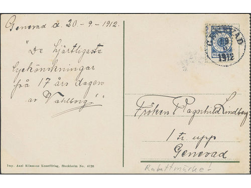 Sweden. On cover, 'Rabattmärke', possible from 'Genevads sockerbruk' on postcard cancelled GRENEVAD 19.9.1912. Small imp..