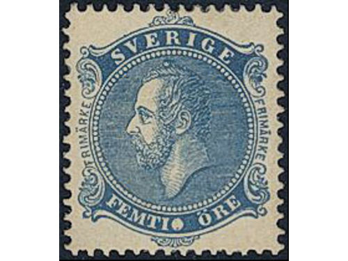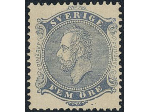Sweden. Facit 16, 99 (★), C A Nymans proposal stamp FEM öre in ultramarine colour with dashed background. Show less