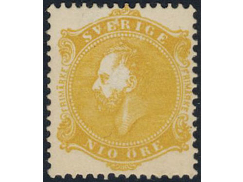 Sweden. Facit 16, 99 (★), C A Nymans proposal stamp NIO öre in brown yellow colour with dashed background. Scraping on front. Show less