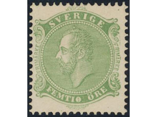 Sweden. Facit 16, 99 (★), C A Nymans proposal stamp FEMTO öre in yellow green colour with dashed background. With variety partly filled 'O'. Show less