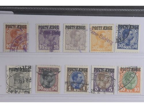 Denmark. Ferry Facit PF1–9 used, 1919 POSTFÆRGE overprint on King Christian X 10 øre to 10 kr. SEK 5200