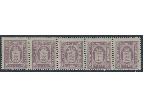 Denmark. Official Facit Tj6 ★★, 1875 Coat-of-Arms 3 øre lilac, watermark crown, perf 14 × 13½. Inverted wm, strip of five, a bit rough perfs. SEK 2500 for * much more for ** Show less