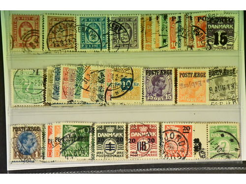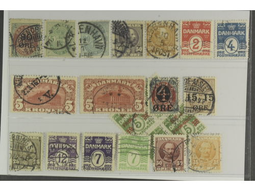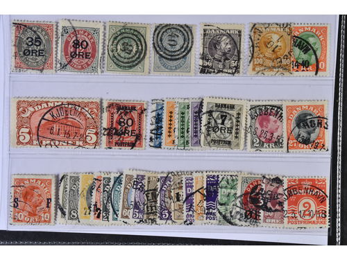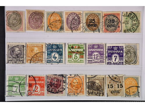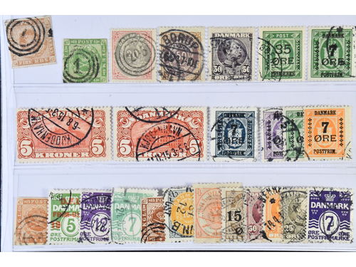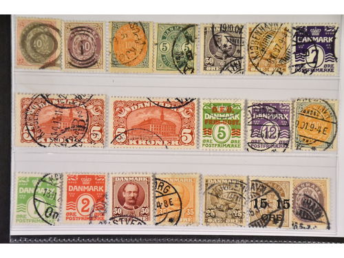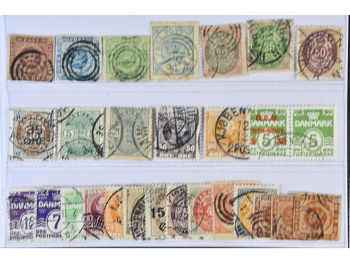 Denmark. Used 1875–1930. All different, e.g. F 34, 36–37, 50, 67–68, 120–21. Mostly good quality. F SEK 7105 (19)