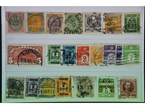 Denmark. Used 1904–1926. All different, e.g. F 47-50, 52, 67-68, 120, 123, 130. Mostly good quality. F SEK 10715 (22)