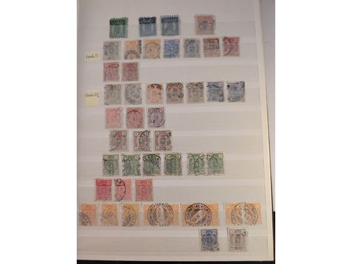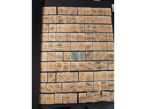 Finland. Cancellations, accumulation 1880s–1901 in box. Eight stockbooks, two of the stockbooks with 20p orange and four of them with 5p green with bridge type cancels with many different towns, one stockbook with mixed cancels and one with duplicate stamps 1930s–1960s. Mostly fine quality. Approx. 8 kg. (6000+) Show less