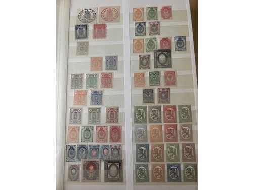 Finland. Accumulation ★★ in box. Stockbook, four Visir leaves with u/m stamps and sets + small box with stamps with plate flaws 1889–1917. Please see a selection of scans at www.philea.se. Show less