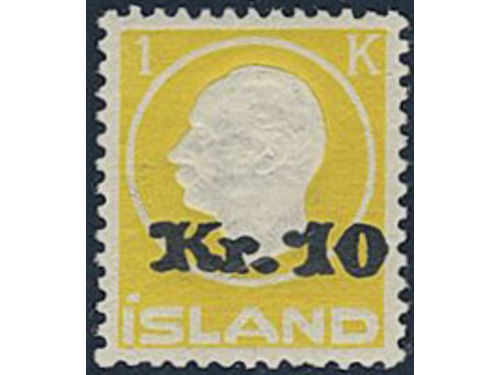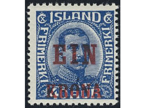 Iceland. Facit 159 ★★, 1926 New value overprint EIN KRONA / 40 aur blue. SEK 5000 Show less