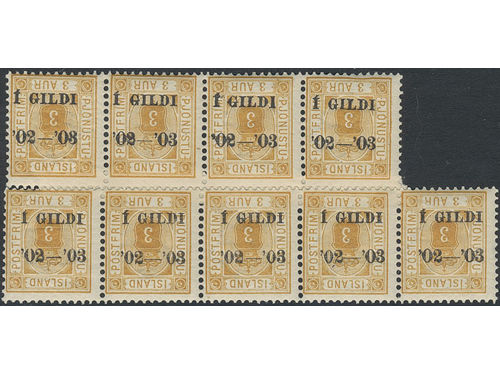 Iceland. Official Facit Tj21 ★★/★, 1902 Overprint Í GILDI '02-'03 3 aur orange, perf 12¾ in reconstructed block of nine with inverted overprint. Show less