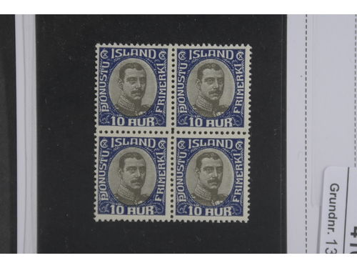 Iceland. Official Facit Tj45 ★★, 1920 King Christian X 10 aur grey/dark blue in a very fresh block-of-four. SEK 5200 Show less
