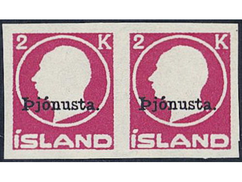 Iceland. Official Facit Tj53 I (★), 1922 Surcharge Þjonusta 2 Kr red, smaller type and with stop after a. Imperf, somewhat larger size on white paper, in pair. Proof? Show less