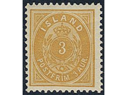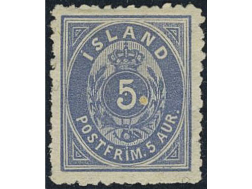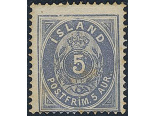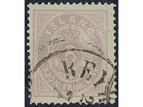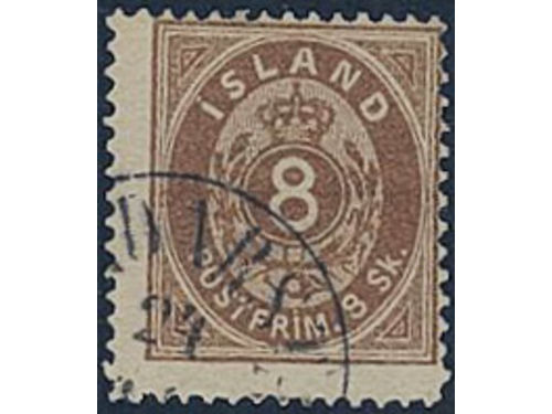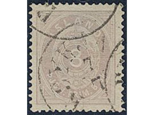 Iceland. Official Facit Tj2 used, 1873 Number in frame 8 sk lilac, perf 14 × 13½. Good centering. SEK 6500